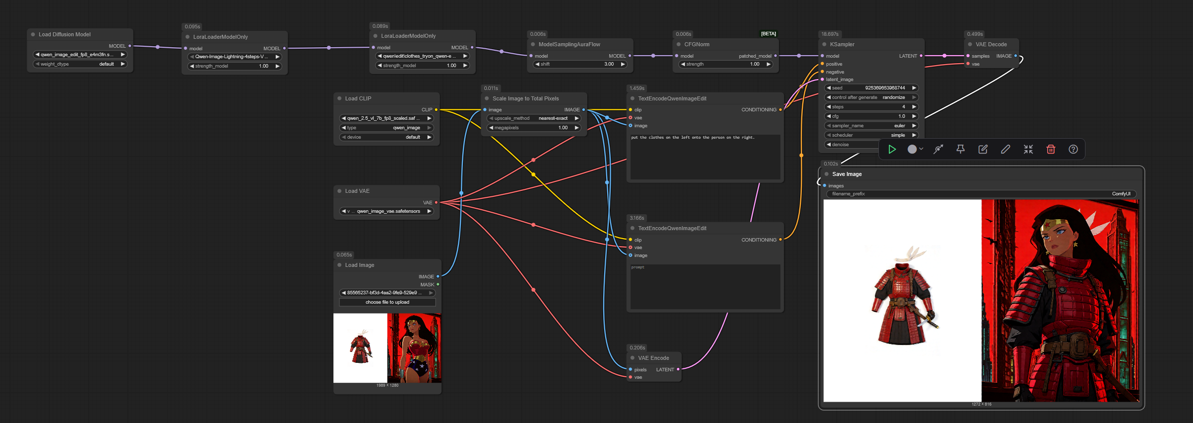 Official qwen edit workflow with lora support. Defaults set for Clothes Try On Lora but can be used for any lora