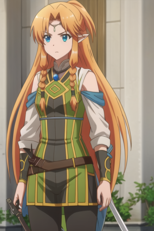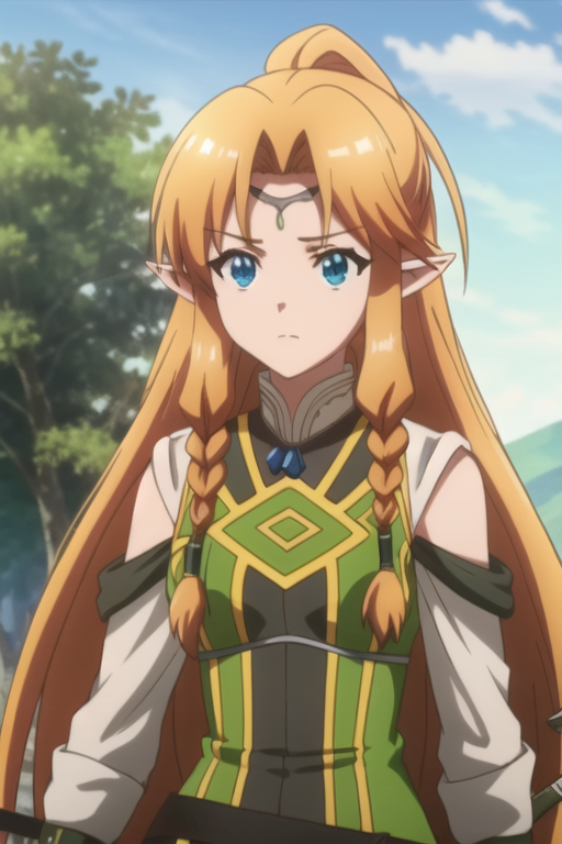 Trigger Words: miyura (isekai cheat magician), long hair, pointy ears, elf, circlet, blue eyes, orange hair