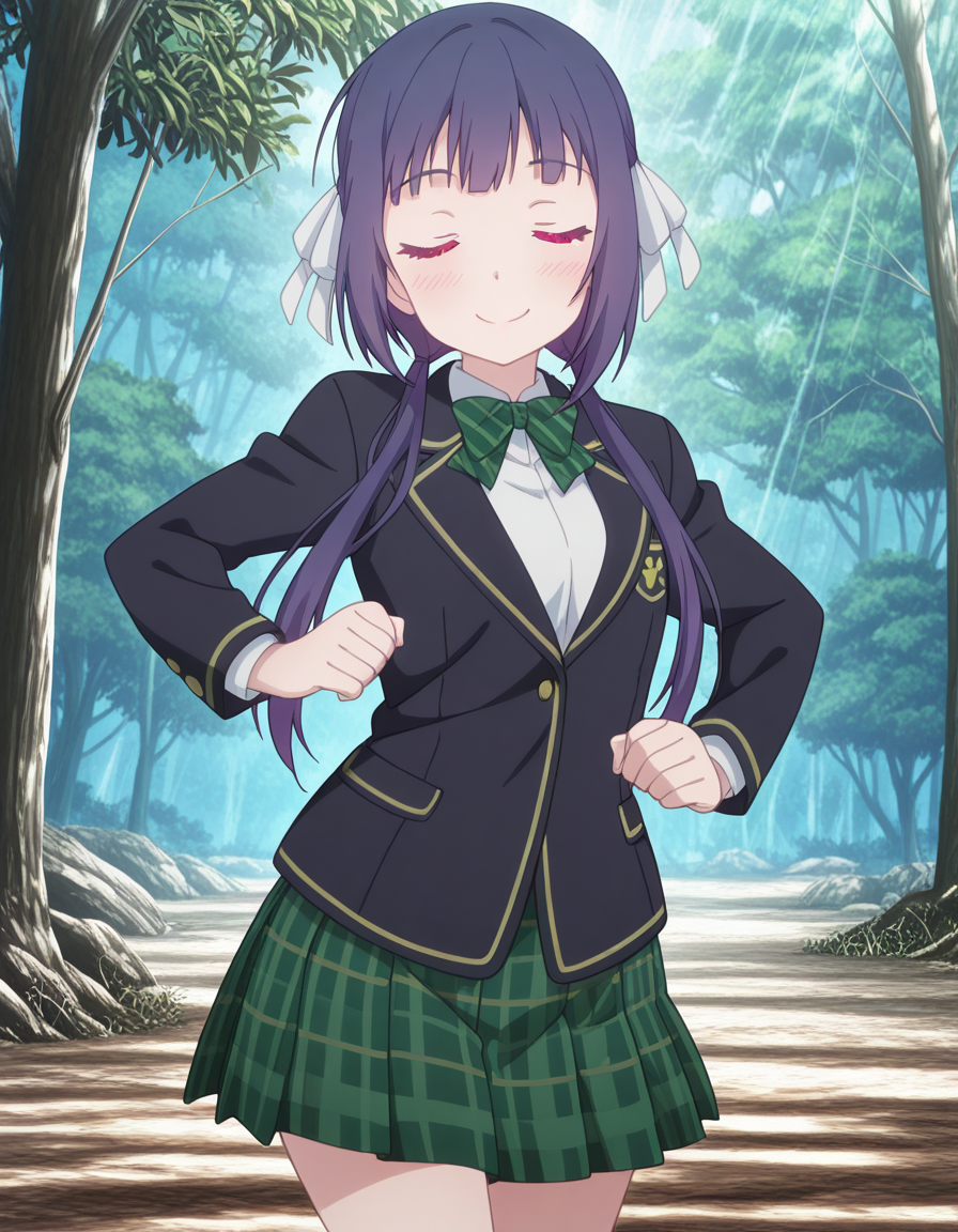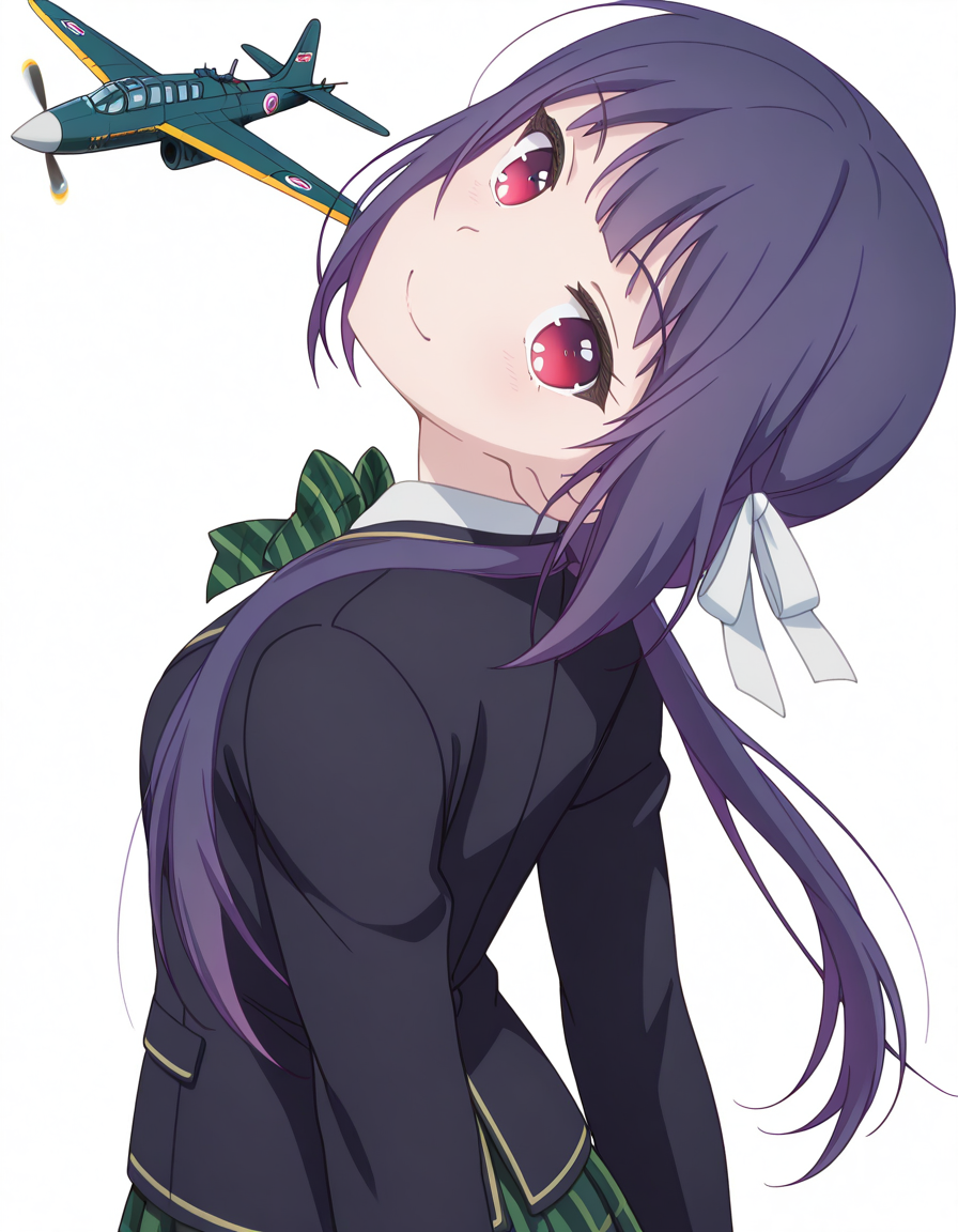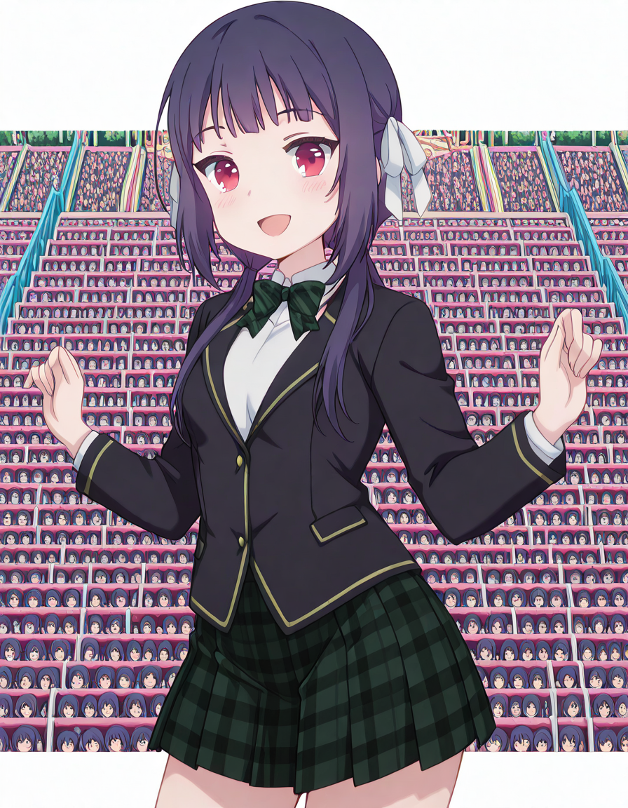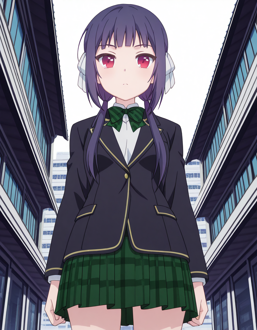 skirt, bow, ribbon, twintails, jacket, hair ribbon, bowtie, blazer, plaid, plaid skirt, plaid bowtie, pleated skirt, black blazer,