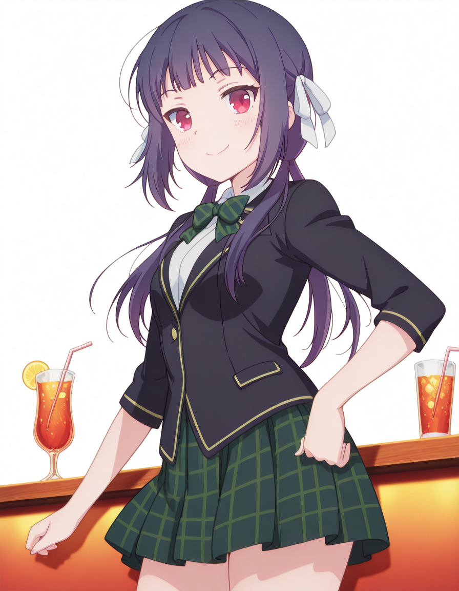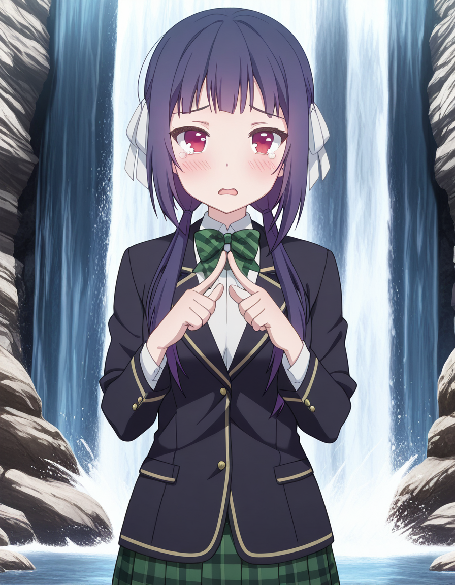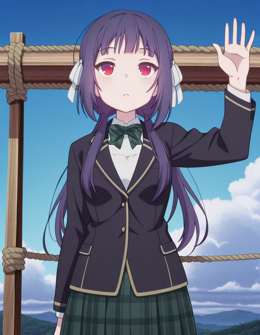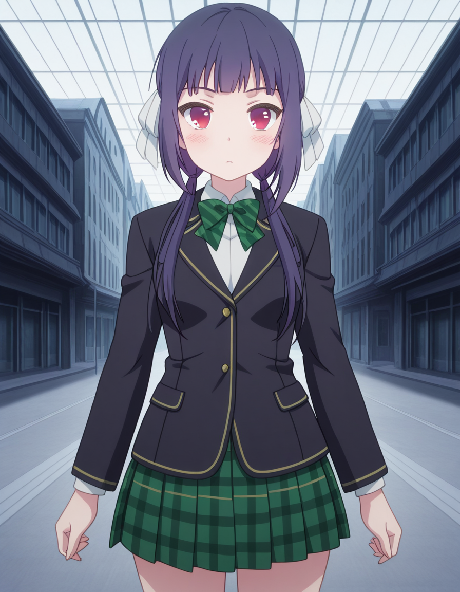 skirt, bow, ribbon, twintails, jacket, hair ribbon, bowtie, blazer, plaid, plaid skirt, plaid bowtie, pleated skirt, black blazer,