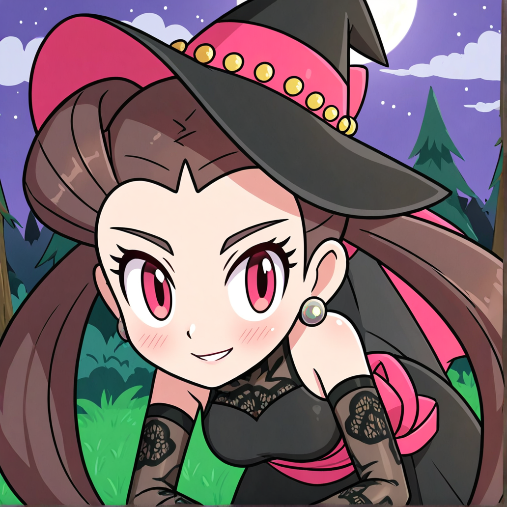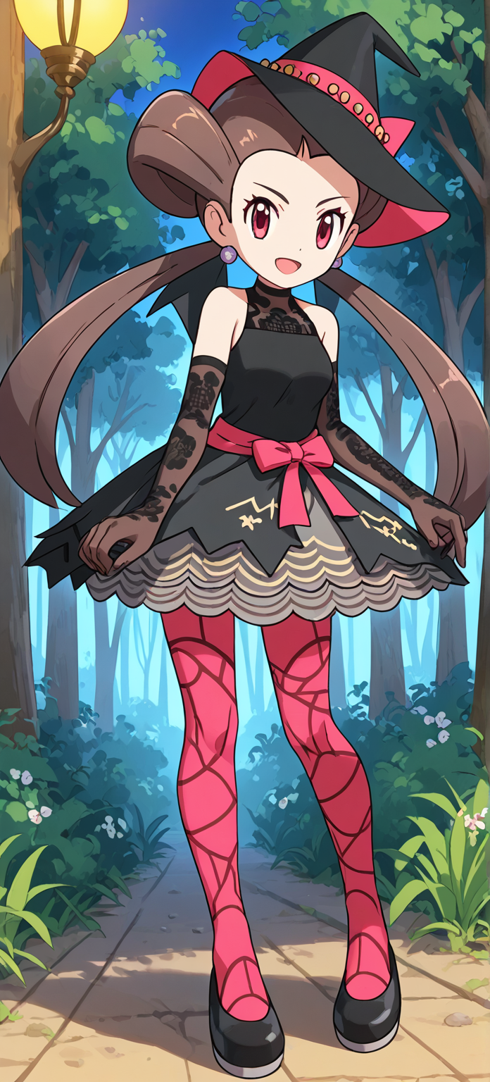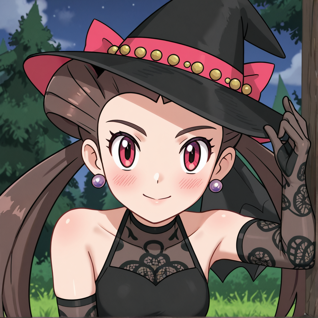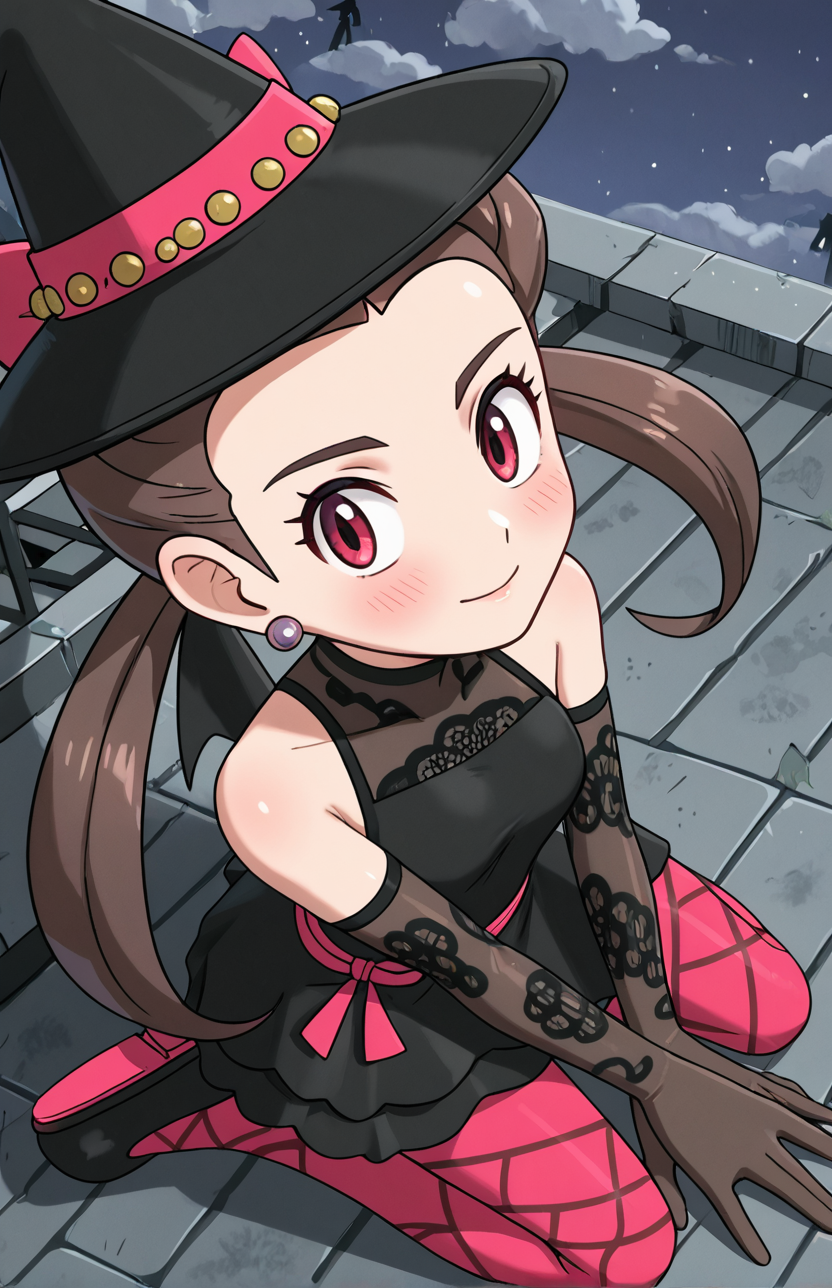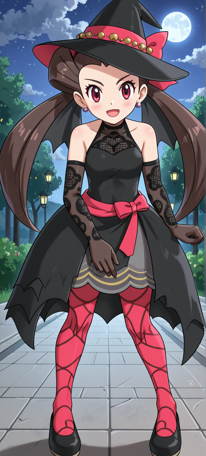 froxanne, aged up, roxanne \(pokemon\), brown hair, red eyes, long hair, twintails, black headwear