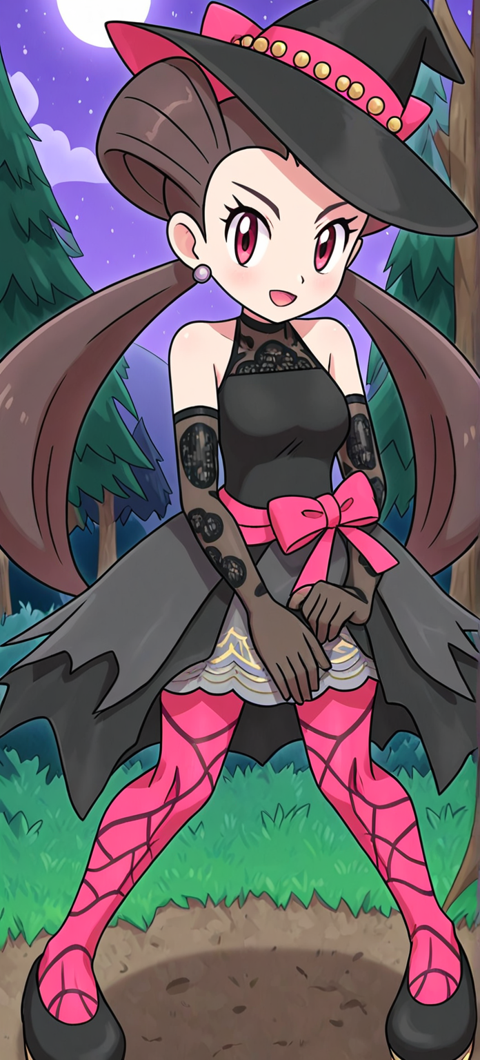 witch hat, tilted headwear, hat bow, pink bow, purple earrings, elbow gloves, black gloves, black dress, medium dress, halter dress, sleeveless, pink pantyhose, print pantyhose, shoes, black footwear, colored shoe soles