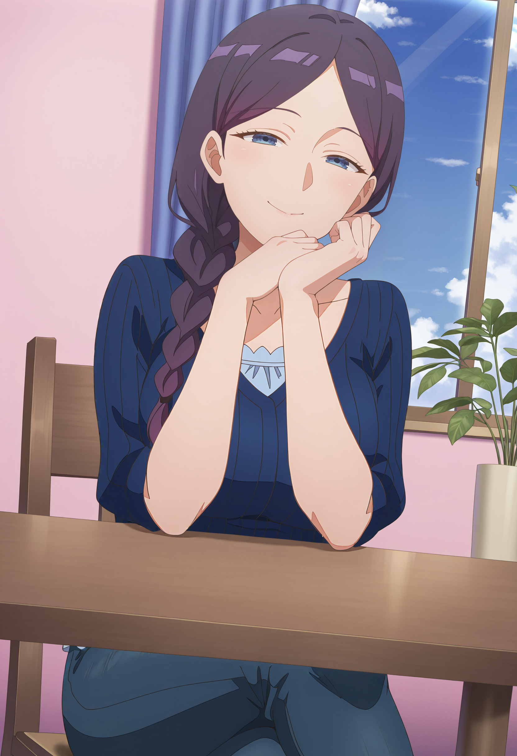 WatariMio, blue eyes, purple hair, long hair, single braid, hair over shoulder, parted bangs — Add "mature female" if you want to accentuate those features