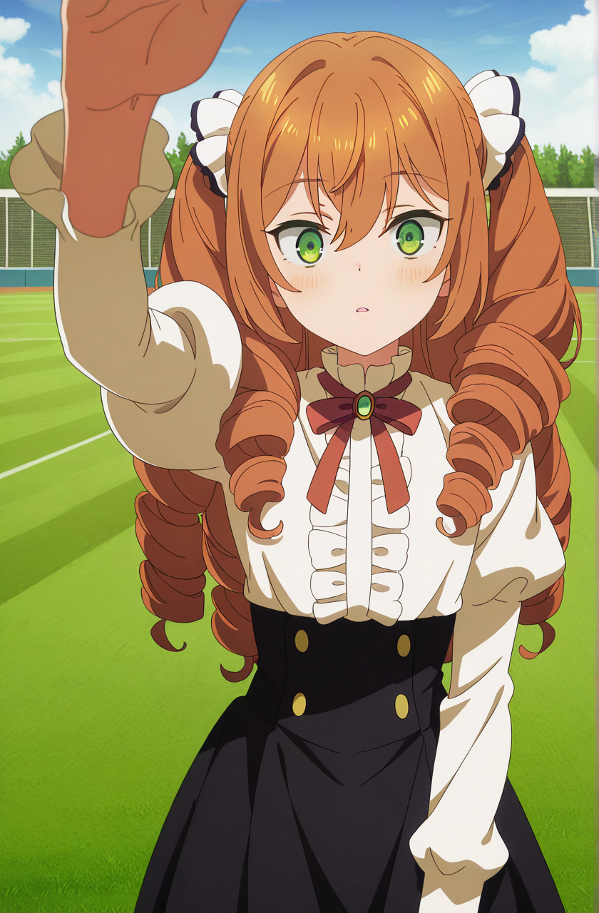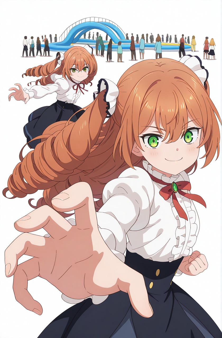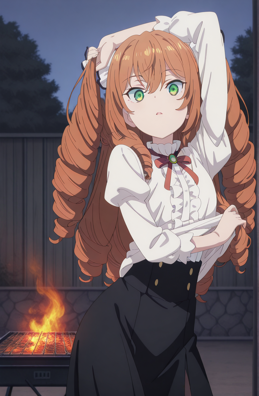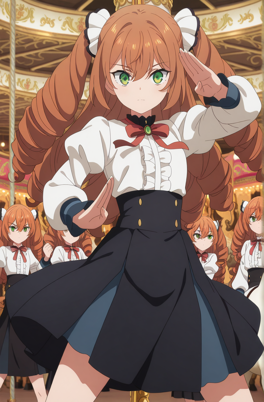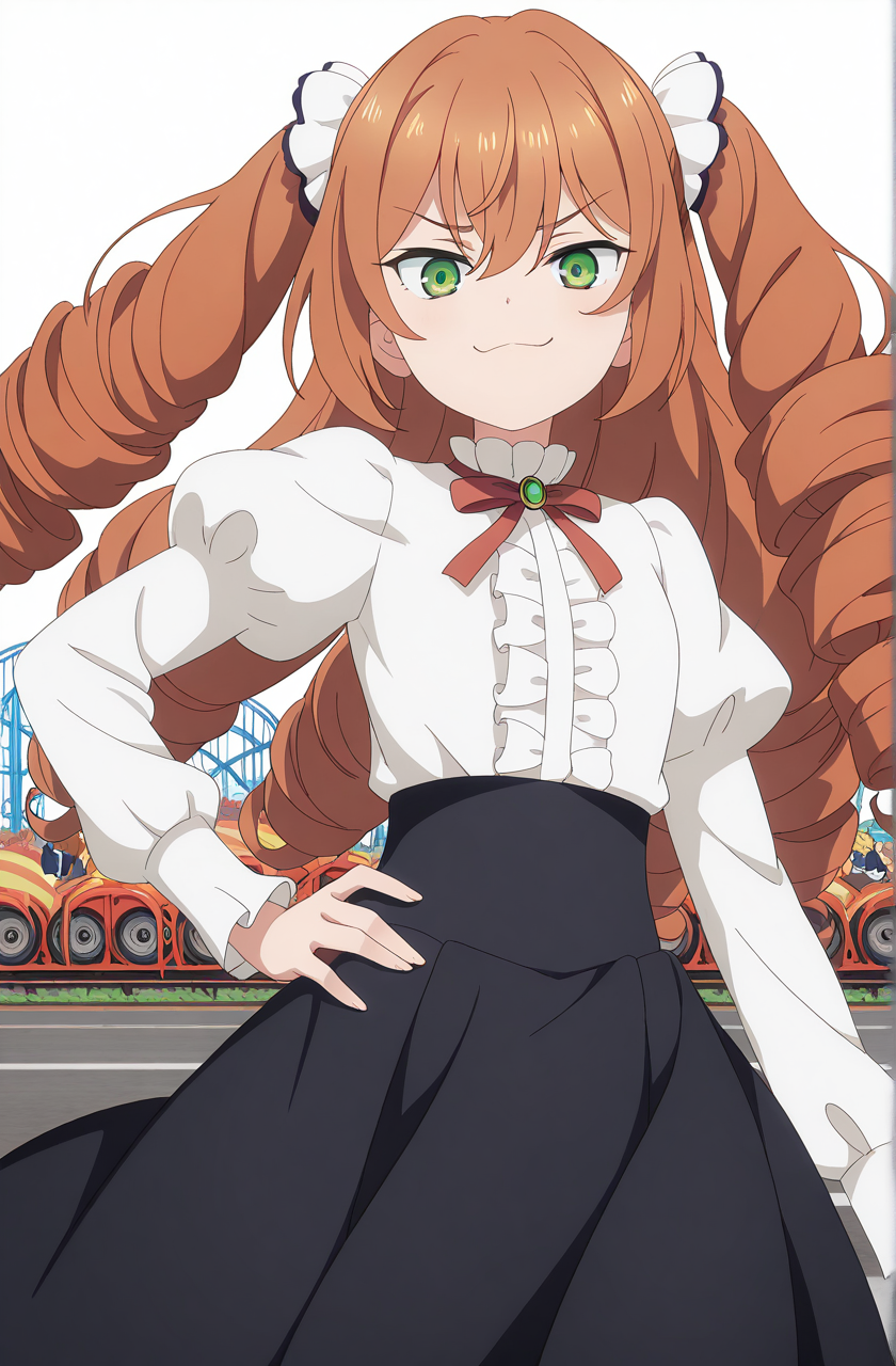 isabelle norton, long hair, brown hair, hair between eyes, twintails, green eyes, orange hair, drill hair, twin drills, anime screencap