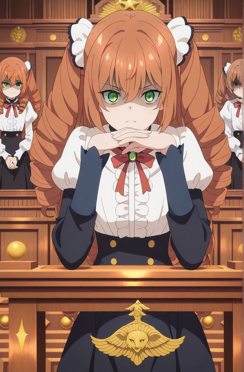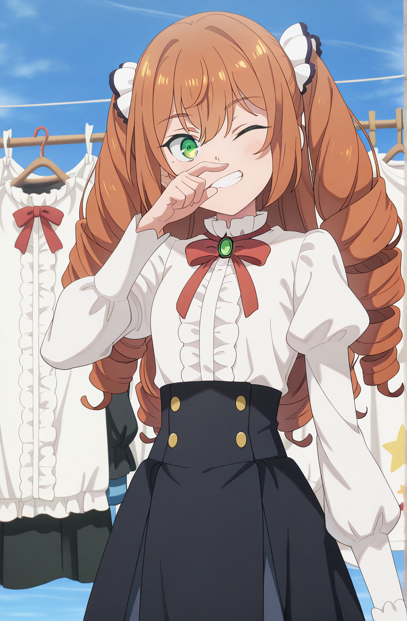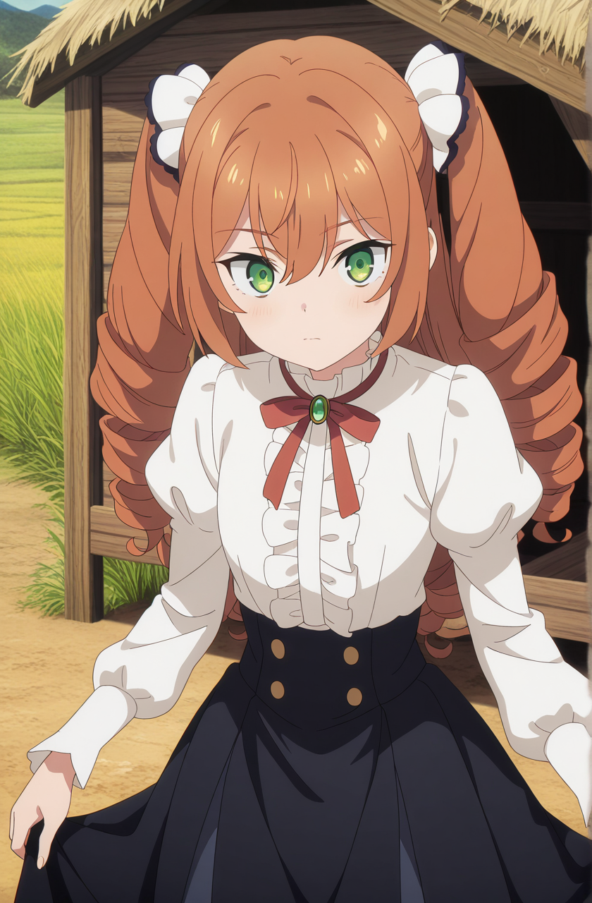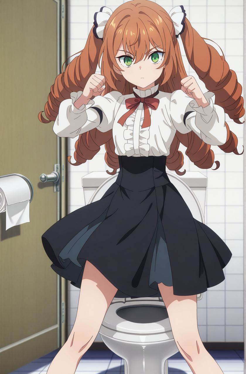 isabelle norton, long hair, brown hair, hair between eyes, twintails, green eyes, orange hair, drill hair, twin drills, anime screencap