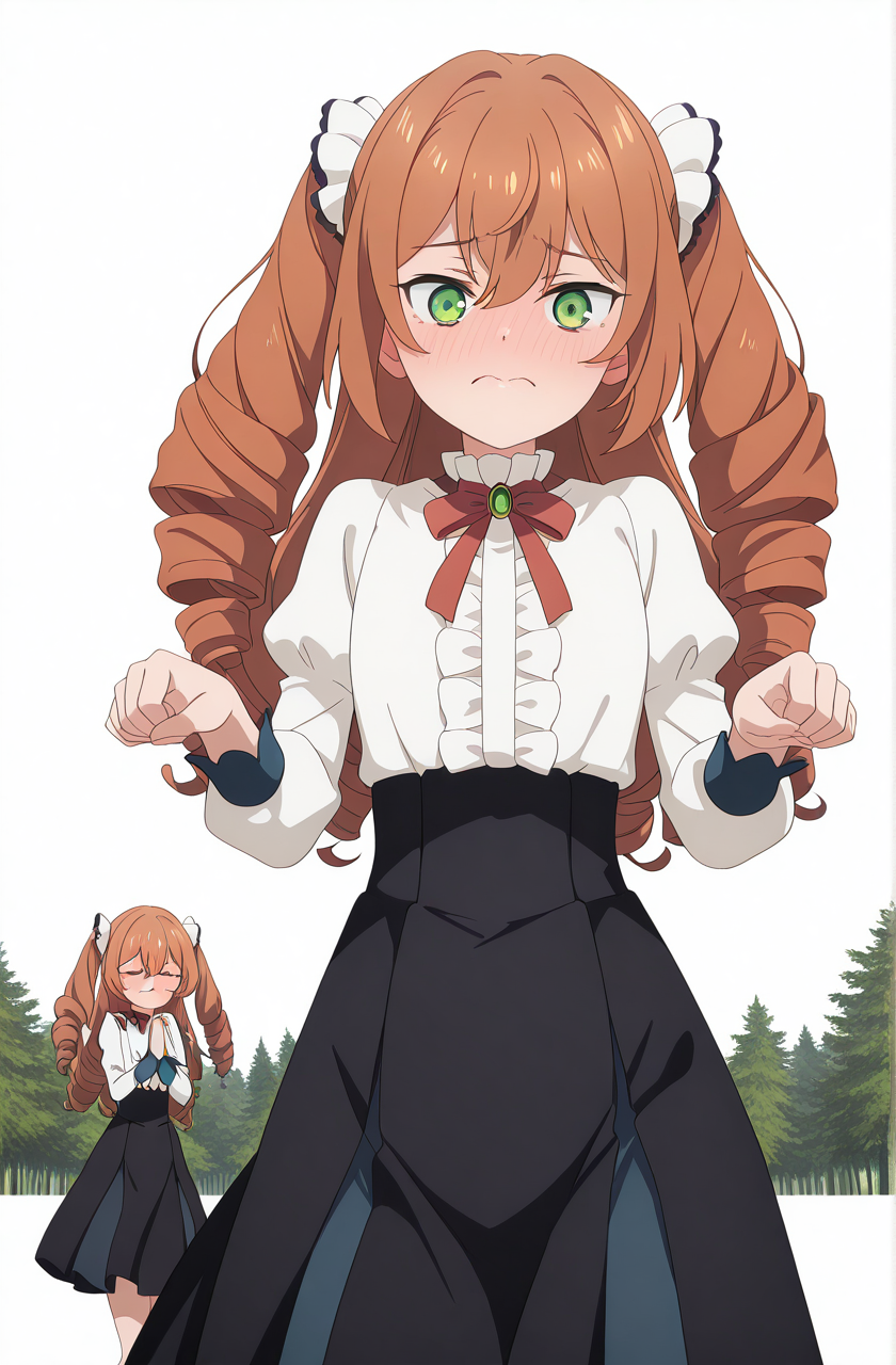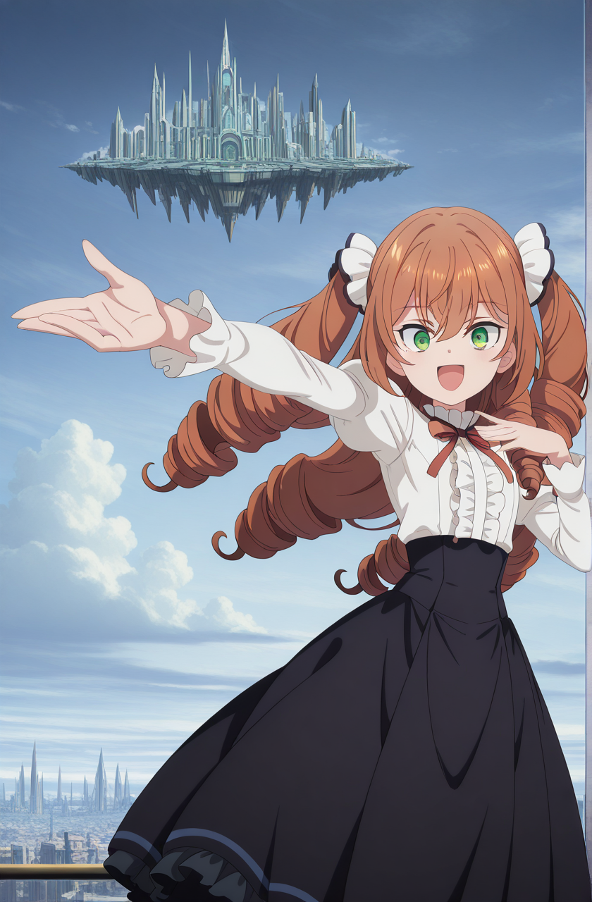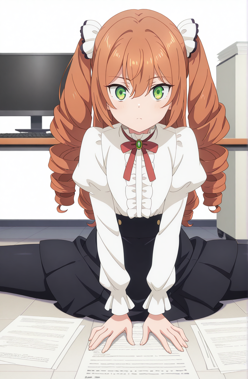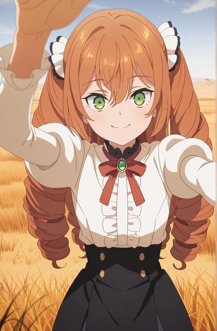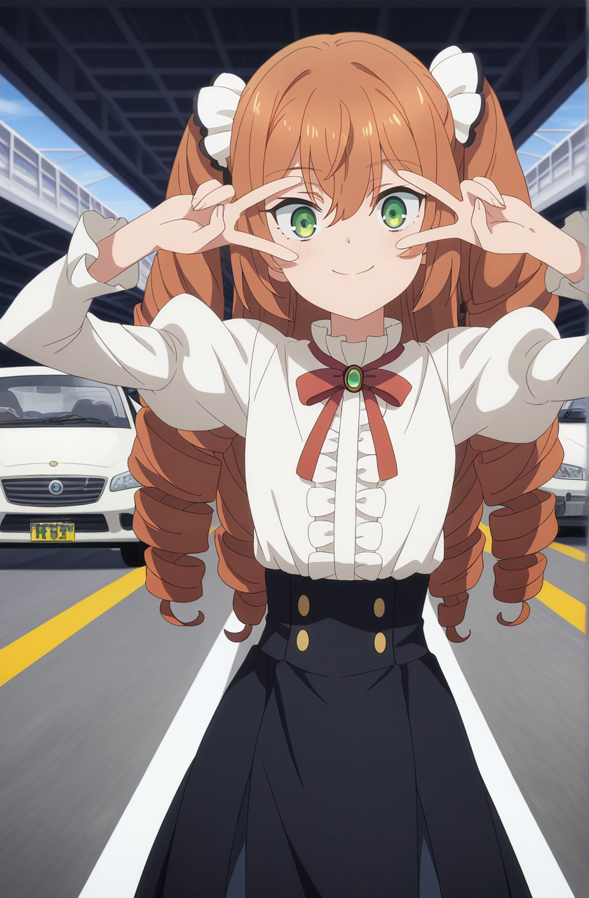 isabelle norton, long hair, brown hair, hair between eyes, twintails, green eyes, orange hair, drill hair, twin drills, anime screencap