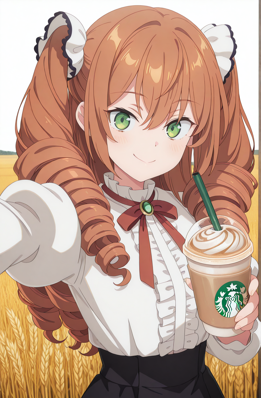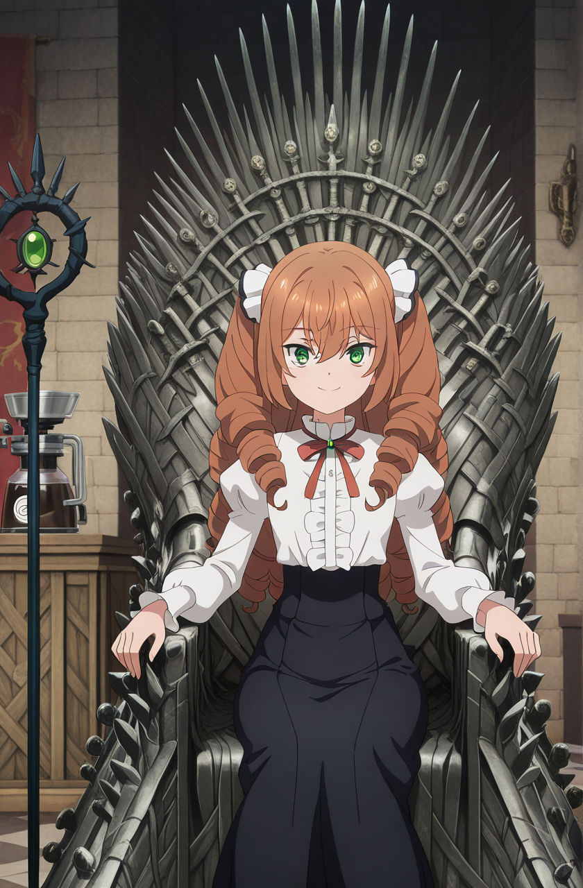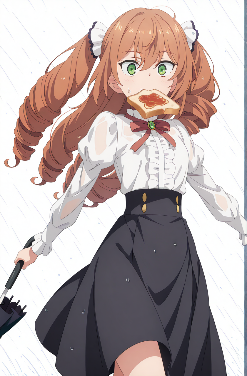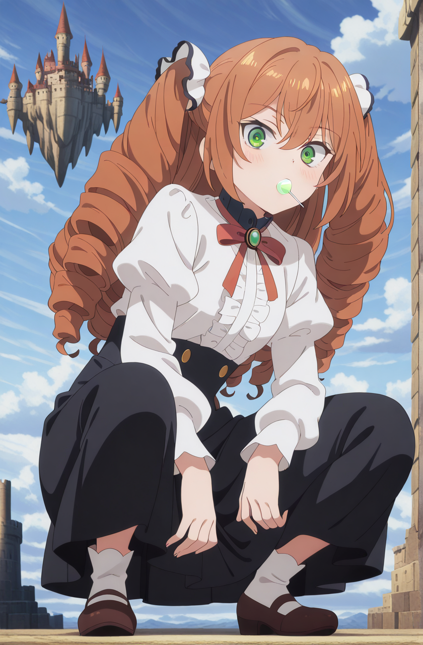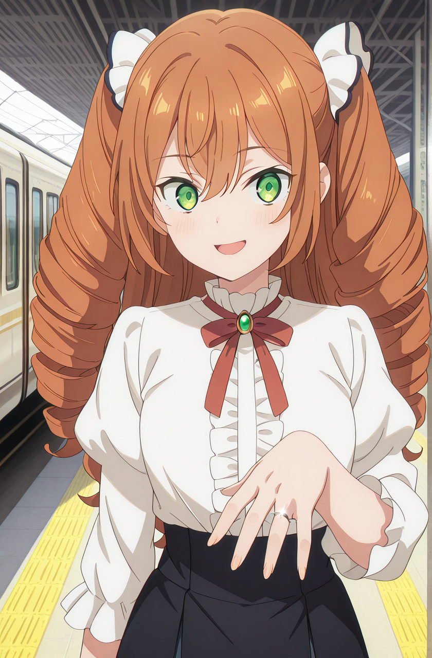 isabelle norton, long hair, brown hair, hair between eyes, twintails, green eyes, orange hair, drill hair, twin drills, anime screencap