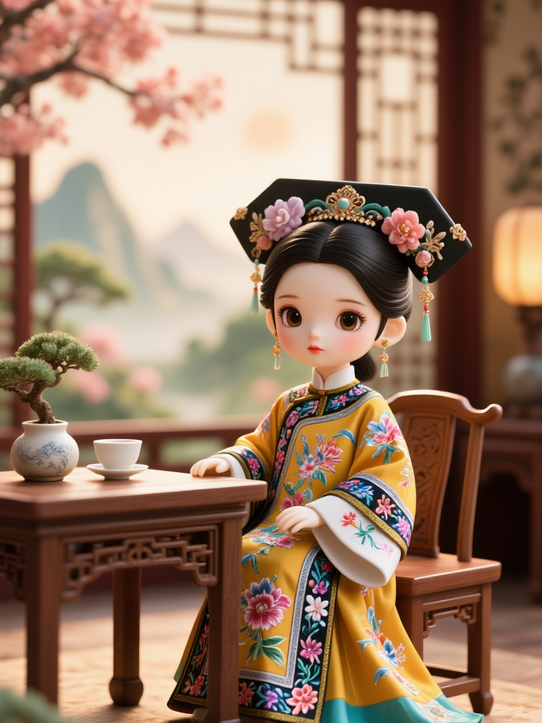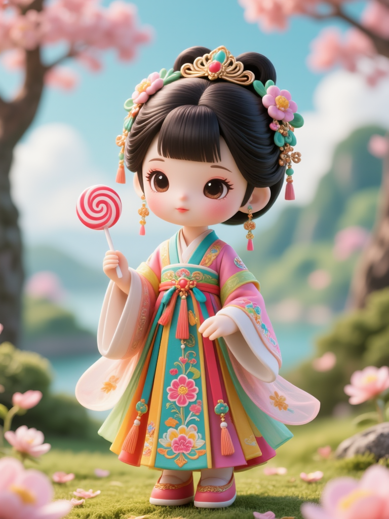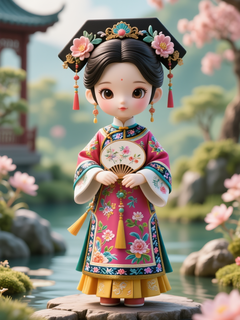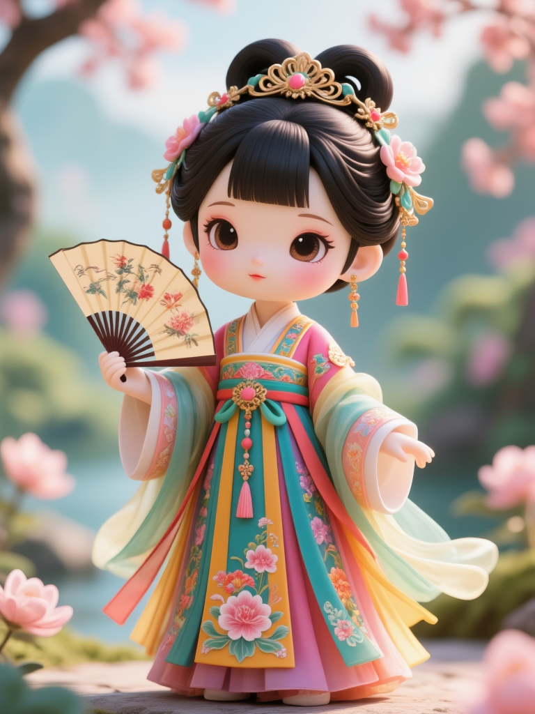 a photo-realistic, 3d rendering shoot from a front camera angle about a cute, chinese-style doll dressed in traditional clothing with floral patterns and accessories, standing in a serene garden setting with a blurred background of greenery and a pagoda in the distance, the image also shows a tranquil pond with water lilies and rocks in the foreground, on the middle of the image, a 1girl, who appears to be a young girl, standing with a gentle smile, wearing a colorful traditional chinese dress with intricate floral patterns in shades of pink, blue, yellow, and gold, and a black headpiece adorned with flowers and tassels, she has black hair styled in a traditional updo with pink flowers, brown eyes, and is looking directly at the viewer with a closed mouth expression, she is wearing a pair of earrings and holding a hand fan in her hands, the background is a lush, green garden with cherry blossom trees and a small pond, adding to the serene and peaceful atmosphere of the scene,