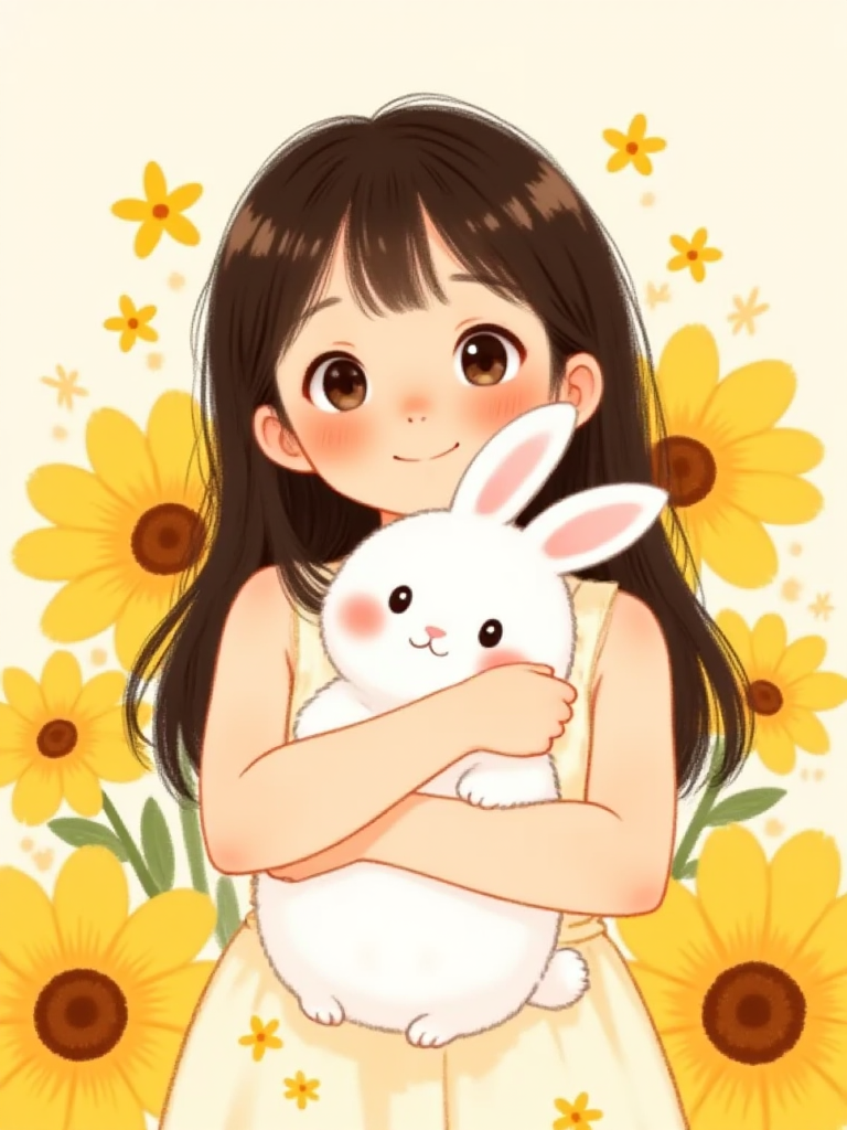 the image depicts a cute girl with long hair sitting on a smiling crescent moon, she is holding a star, surrounded by a starry night sky and fluffy clouds, two stars hang from strings above her