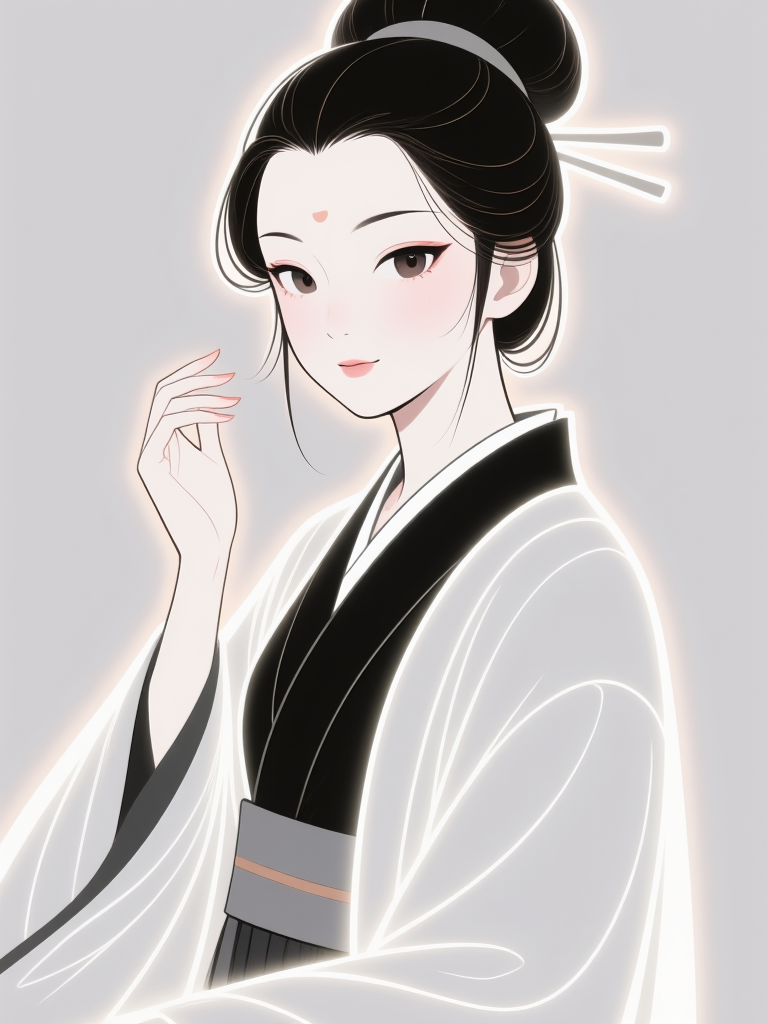 a digital illustration shoot from a portrait camera angle about a serene and elegant japanese woman in a traditional kimono, standing in the middle of the image, facing the viewer with a calm and gentle expression, the woman, who appears to be a young adult, has long, dark hair styled in a single hair bun with a hair stick tied in it, and is wearing a white katana with a black obi, which is draped elegantly around her body, her eyes are a striking brown color, and she has a subtle smile on her face, the background is a simple gradient of light gray, and the image has a soft, ethereal glow around her, creating a sense of calmness and serenity, she is holding her hand up, with her right hand resting on her hip, and her left hand gently touching her hair, the image also features a subtle white mark on her forehead, adding a touch of elegance to her overall appearance,