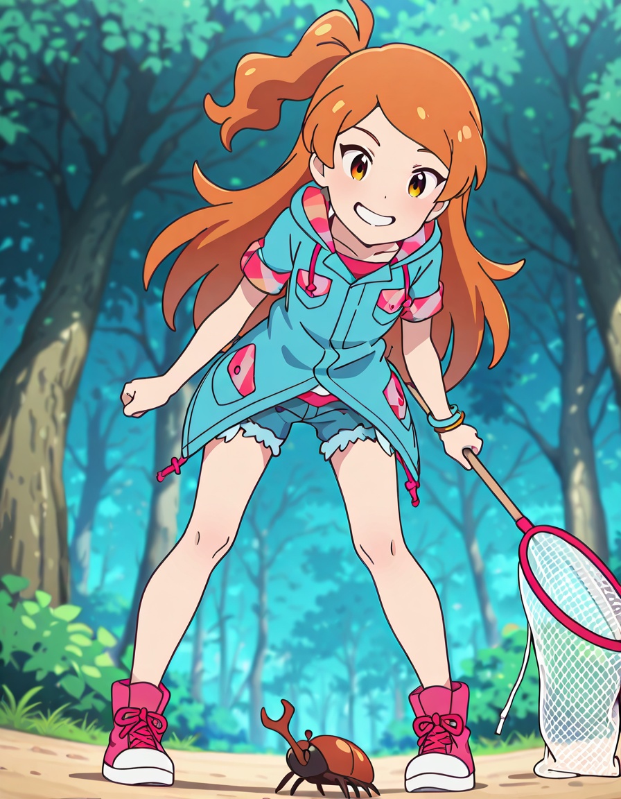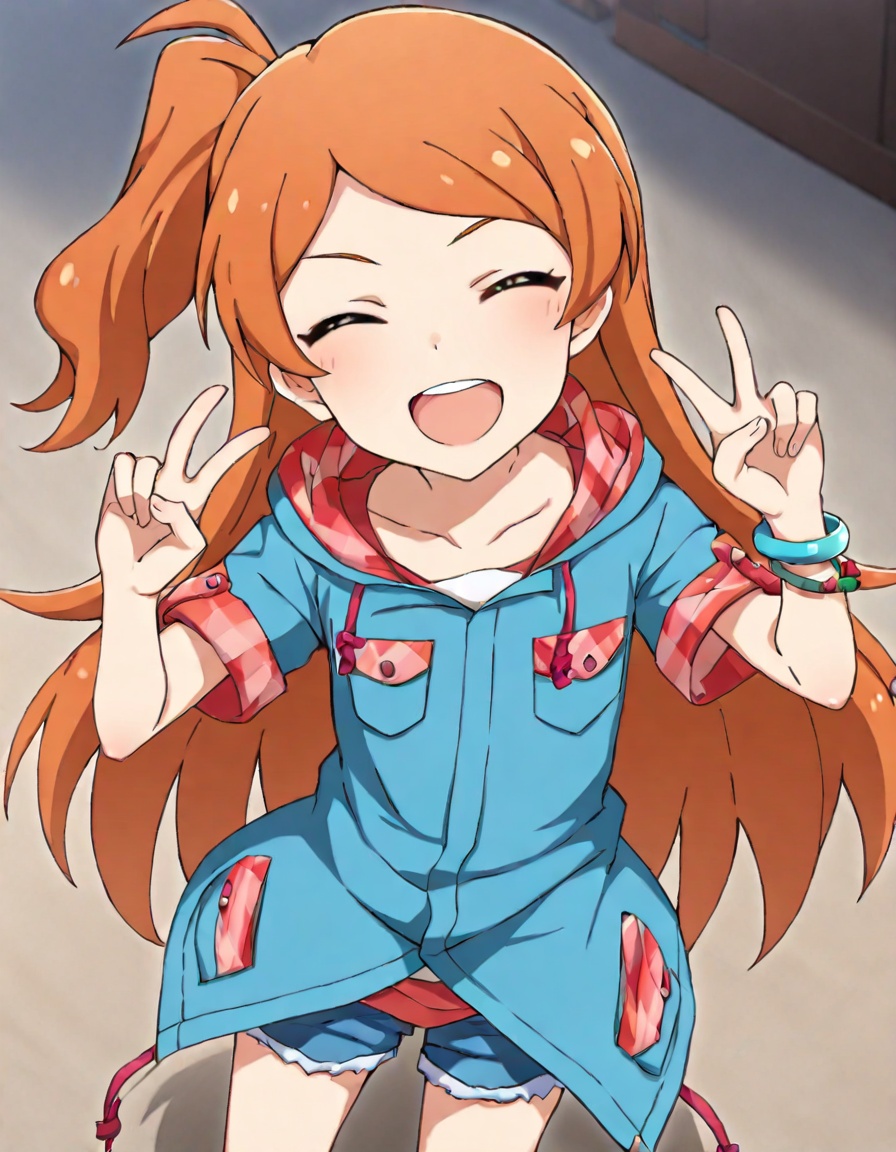 IMtamOG, long hair, one side up, orange hair, orange eyes, blue jacket, hooded jacket, short sleeves, pocket, bracelet, denim shorts, short shorts, sneakers, pink footwear,