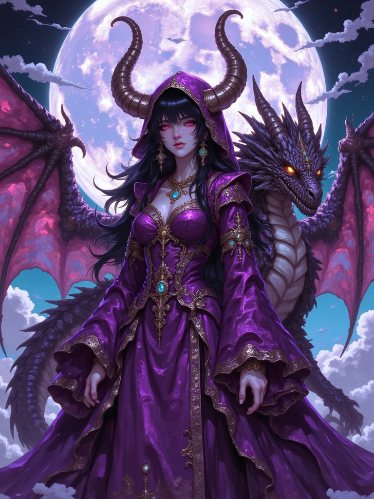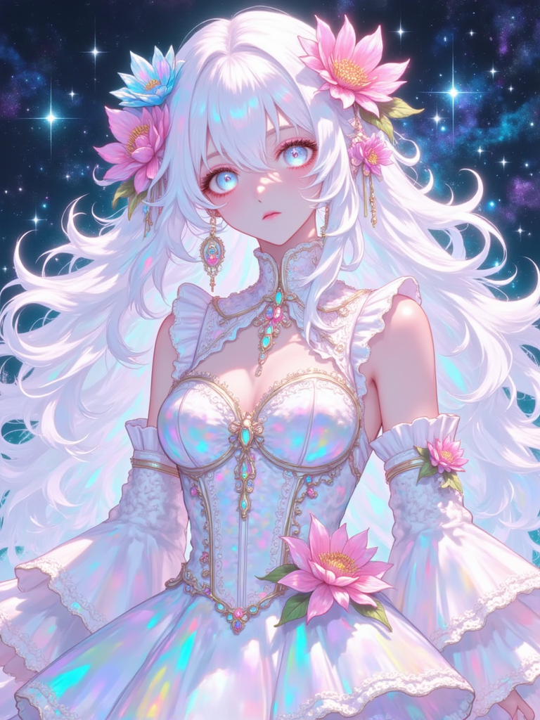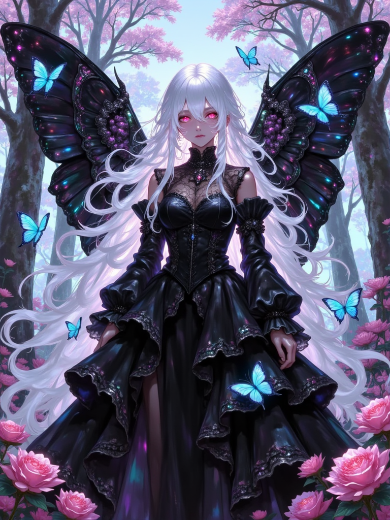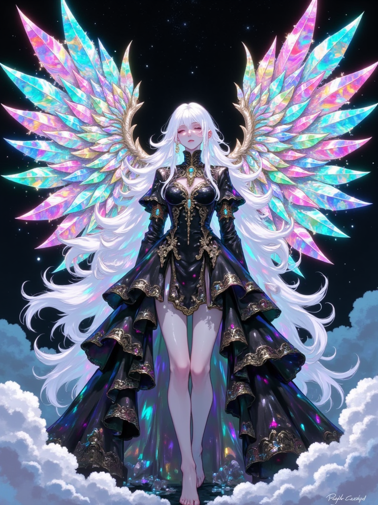 A digital illustration shoot from a frontal camera angle about a mystical female figure with large, multicolored wings adorned with sparkling crystals, standing in the middle of the image. the image also shows a dark, starry sky with clouds in the background. on the middle, a woman with long, flowing white hair and pale skin appears to be standing confidently, with her full body facing the viewer. she has a serene expression and is wearing a black, ornate dress with intricate details and a high neckline. her wings are adorned with a multitude of vibrant, iridescent colors, including blues, greens, pinks, purples, and pinks. she is barefoot and has no clothing or accessories on. her body is slim, and she is standing with her feet out of frame. her hair is styled in long hair, and her eyes are closed, giving a sense of serenity to the scene.