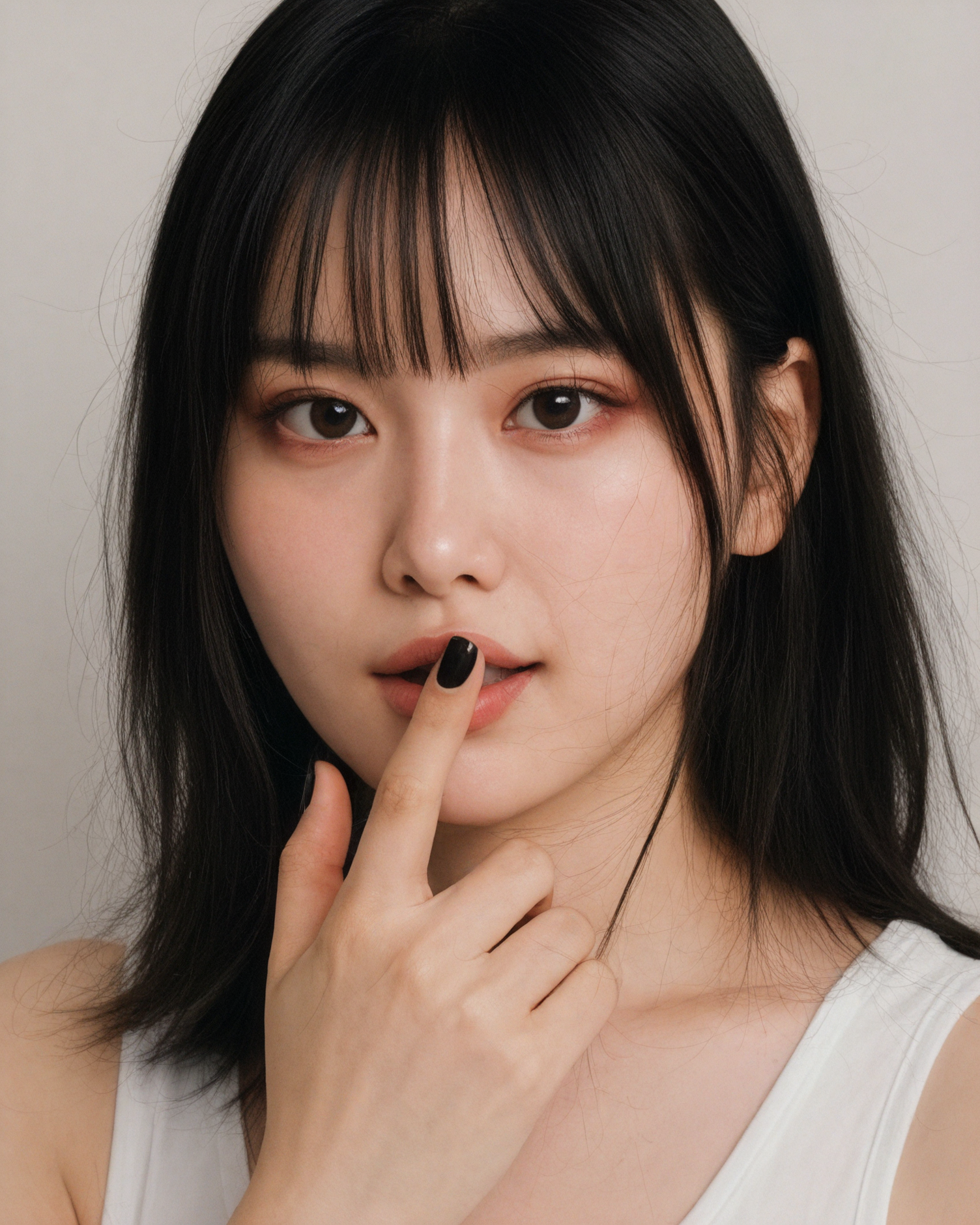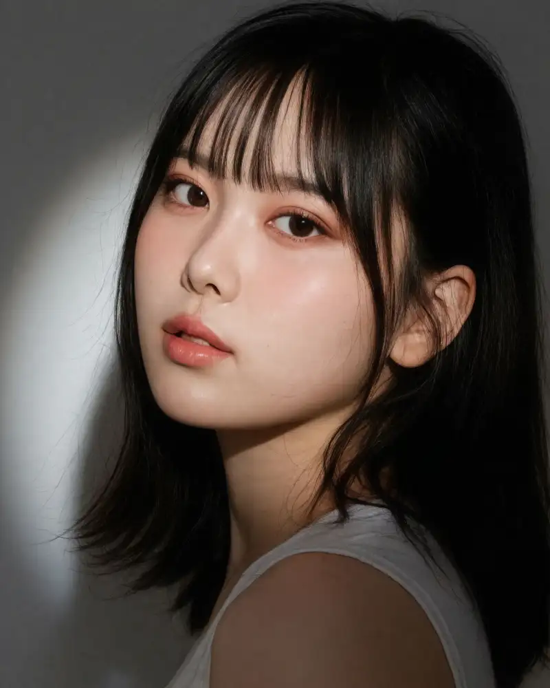 gimme_char, asian girl, wispy bangs, strandĀ ofĀ hairĀ onĀ theĀ sideĀ ofĀ herĀ face, black hair, straight hair, natural makeup, professoinal makeup, orange eyeshadow, blushing