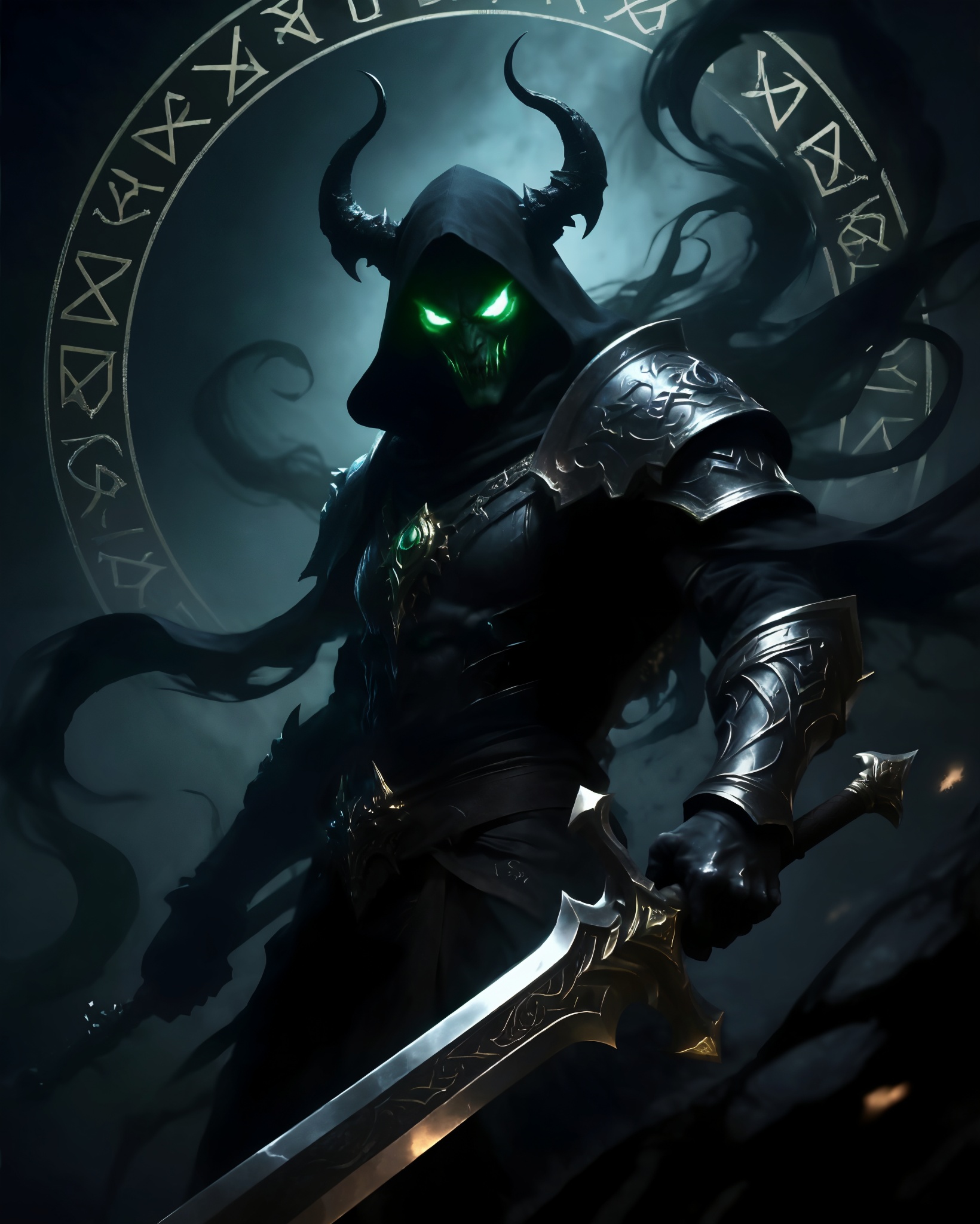 A towering figure looms in the shadows, clad in jagged plates of dark armor that drink in the surrounding light. A heavy hood shrouds its face, but piercing through the veil are two glowing green eyes, cold and unrelenting. Beneath the hood, a skull-like visage emerges, twisted by arcane corruption, with great curved horns curling upward like the crown of a fallen king.