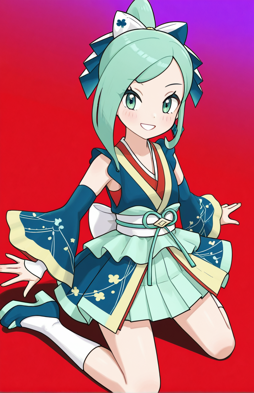 hair ornament, hair bow, earrings, japanese clothes, blue kimono, detached sleeves, wide sleeves, long sleeves, obi, fingerless gloves, white gloves, ring, pleated skirt, aqua skirt, white socks, kneehighs, bobby socks, sandals, platform heels, blue footwear