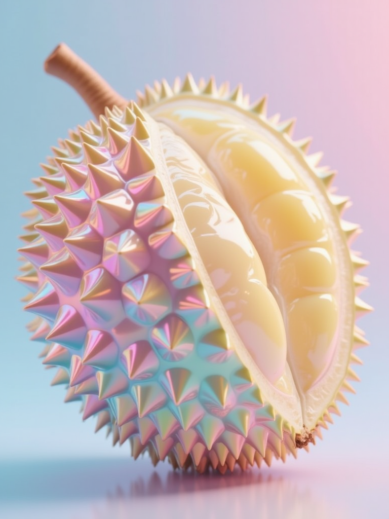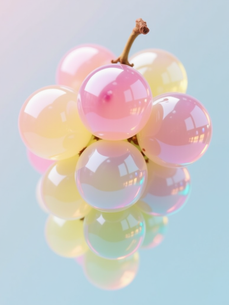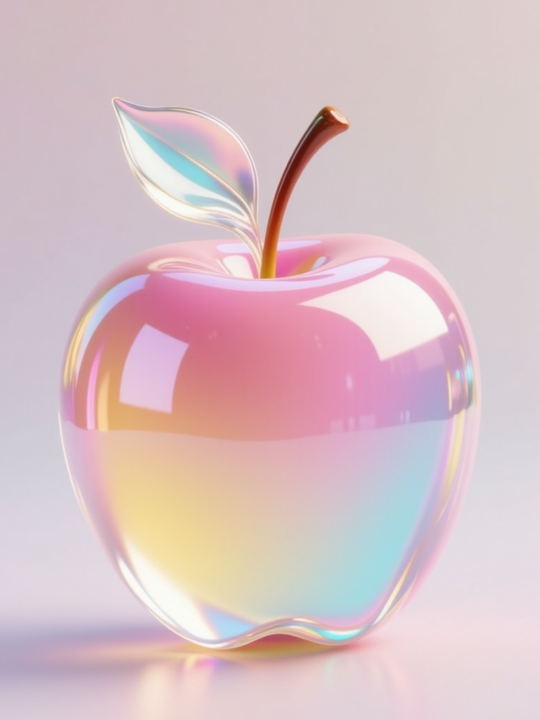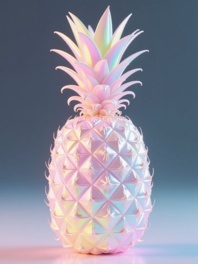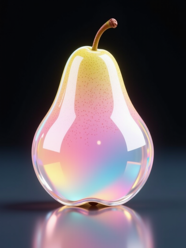 the image depicts a pear with a glossy, iridescent surface, the pear is set against a dark background, and its skin reflects various colors, including pink, blue, and yellow, the stem of the pear is visible at the top, and the overall appearance is vibrant and visually striking