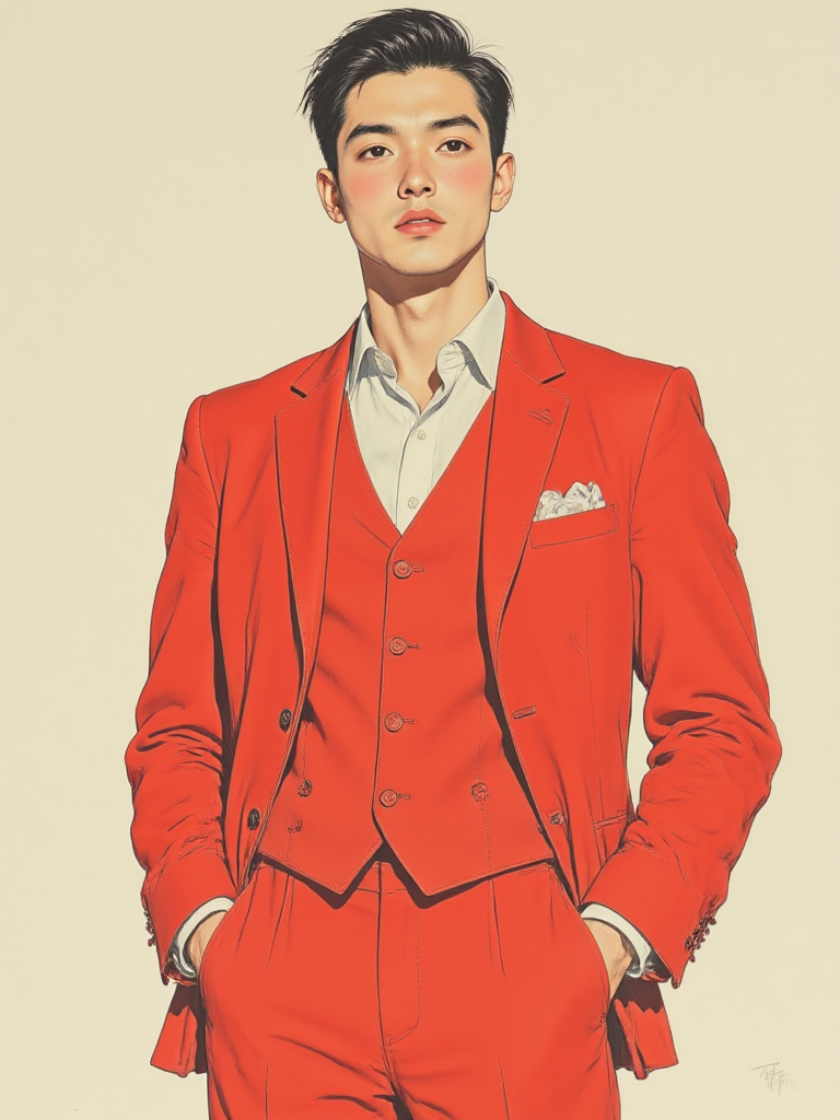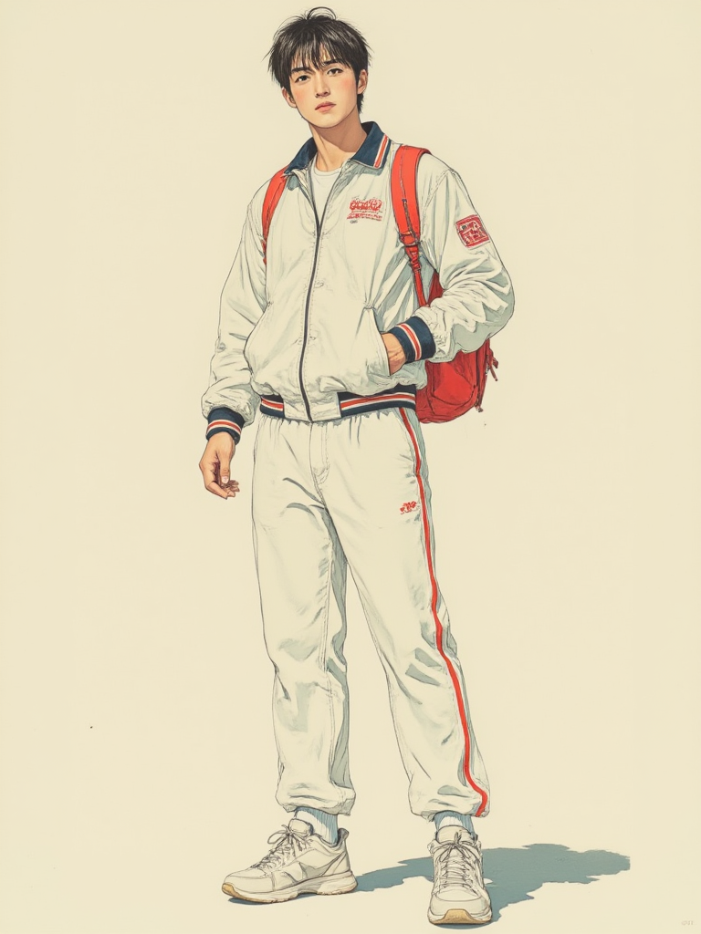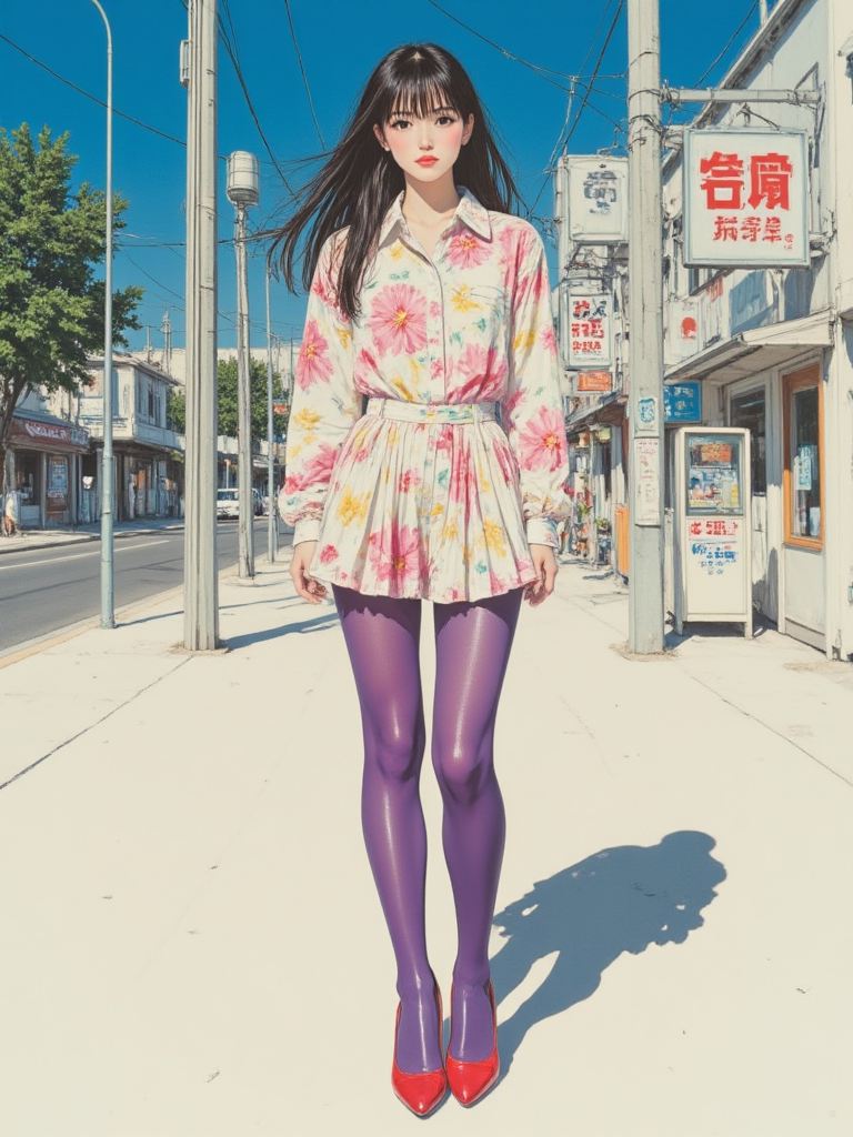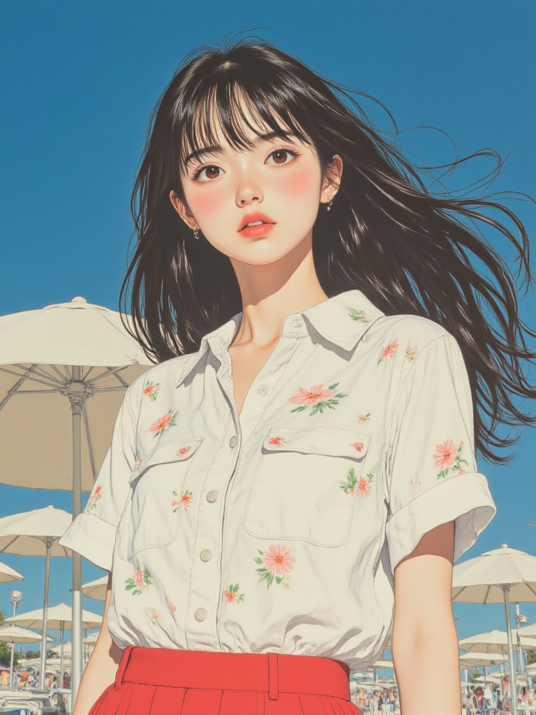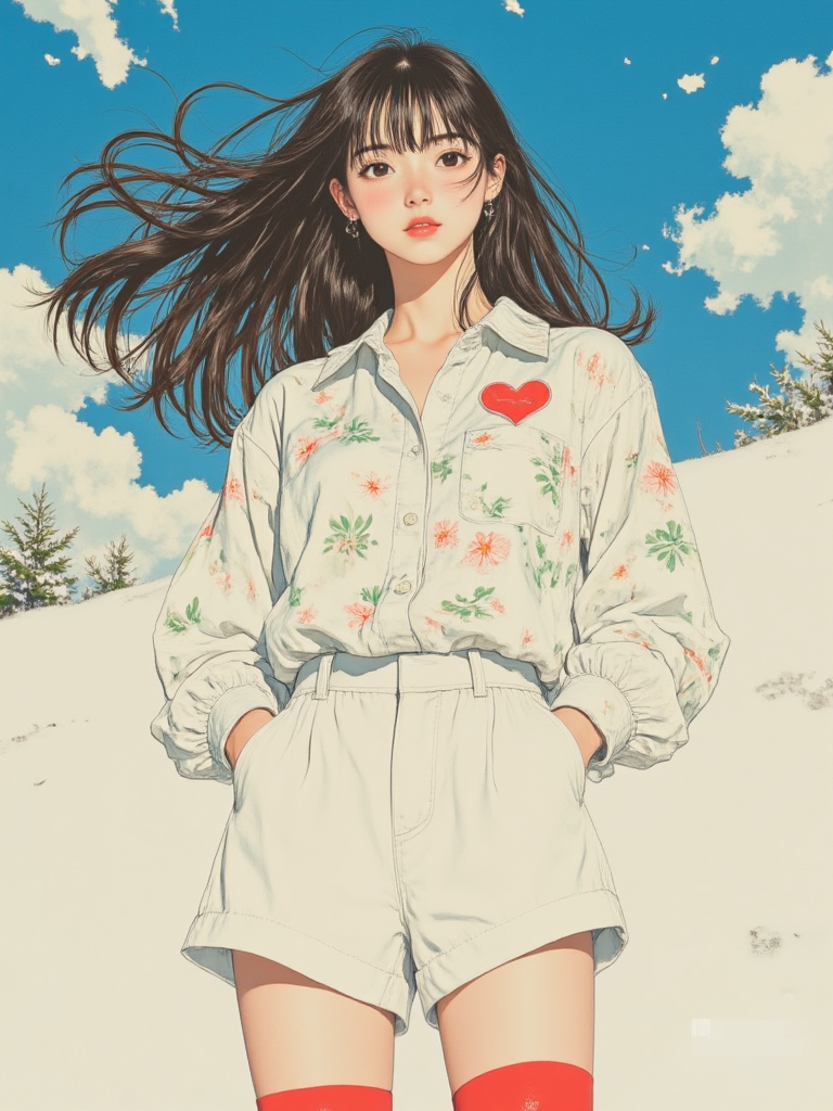 Vintage illustration, a digital illustration shoot from a front camera angle about a young woman with long, flowing black hair wearing a floral shirt and white shorts, standing confidently against a bright blue sky with fluffy white clouds, the image also shows a playful and casual vibe, on the middle of the image, a 20-year-old asian woman appears to be looking directly at the viewer with a neutral expression, she has a slim body and is wearing a white floral shirt with a red heart patch on the chest, along with white high-waisted shorts and red thigh-high socks, her hair is styled in loose waves and falls down her back, framing her face, she is wearing earrings and has parted lips, giving off a confident and relaxed vibe, the background is a simple, light-colored landscape with a few scattered white clouds, adding to the overall playful atmosphere,