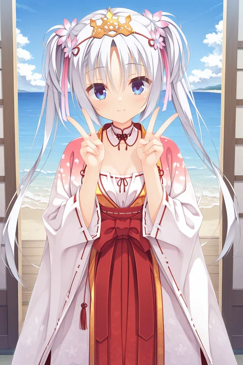 twintails,hair flower,gold crown,hair ribbon,pink ribbon,print kimono,miko,red hakama,wide sleeves,hakama skirt,long sleeves,detached collar,red ribbon,white collar,ribbon-trimmed collar,ribbon-trimmed sleeves,white kimono,pink kimono,floral print,gradient kimono,layered kimono,long kimono,gold trim,