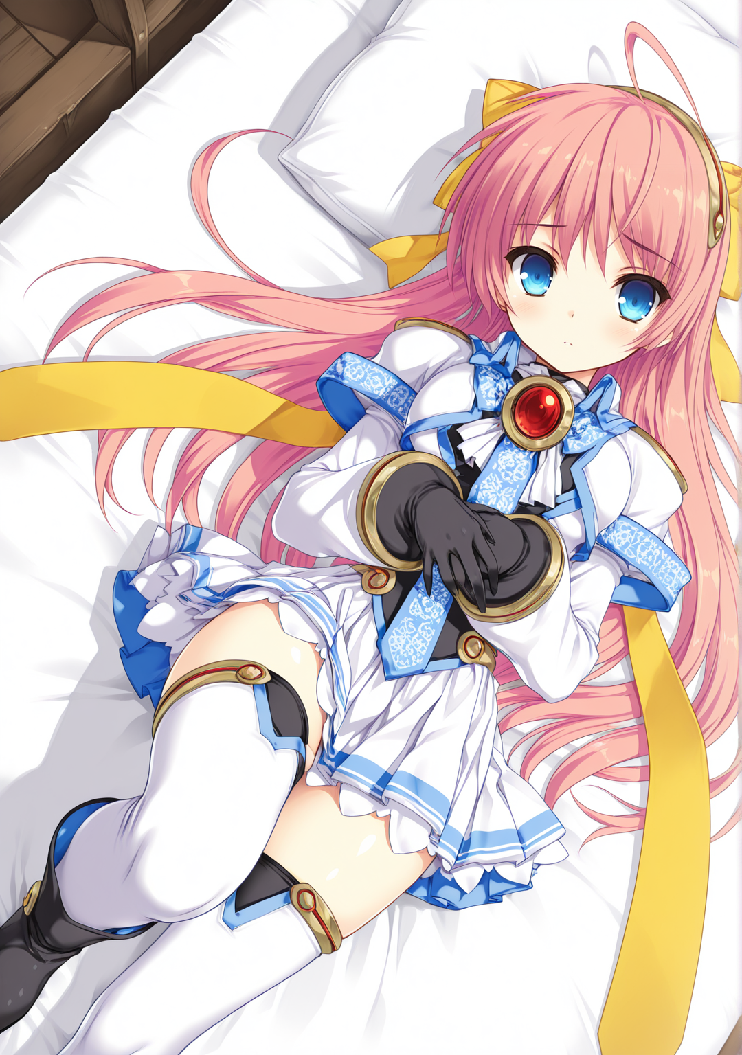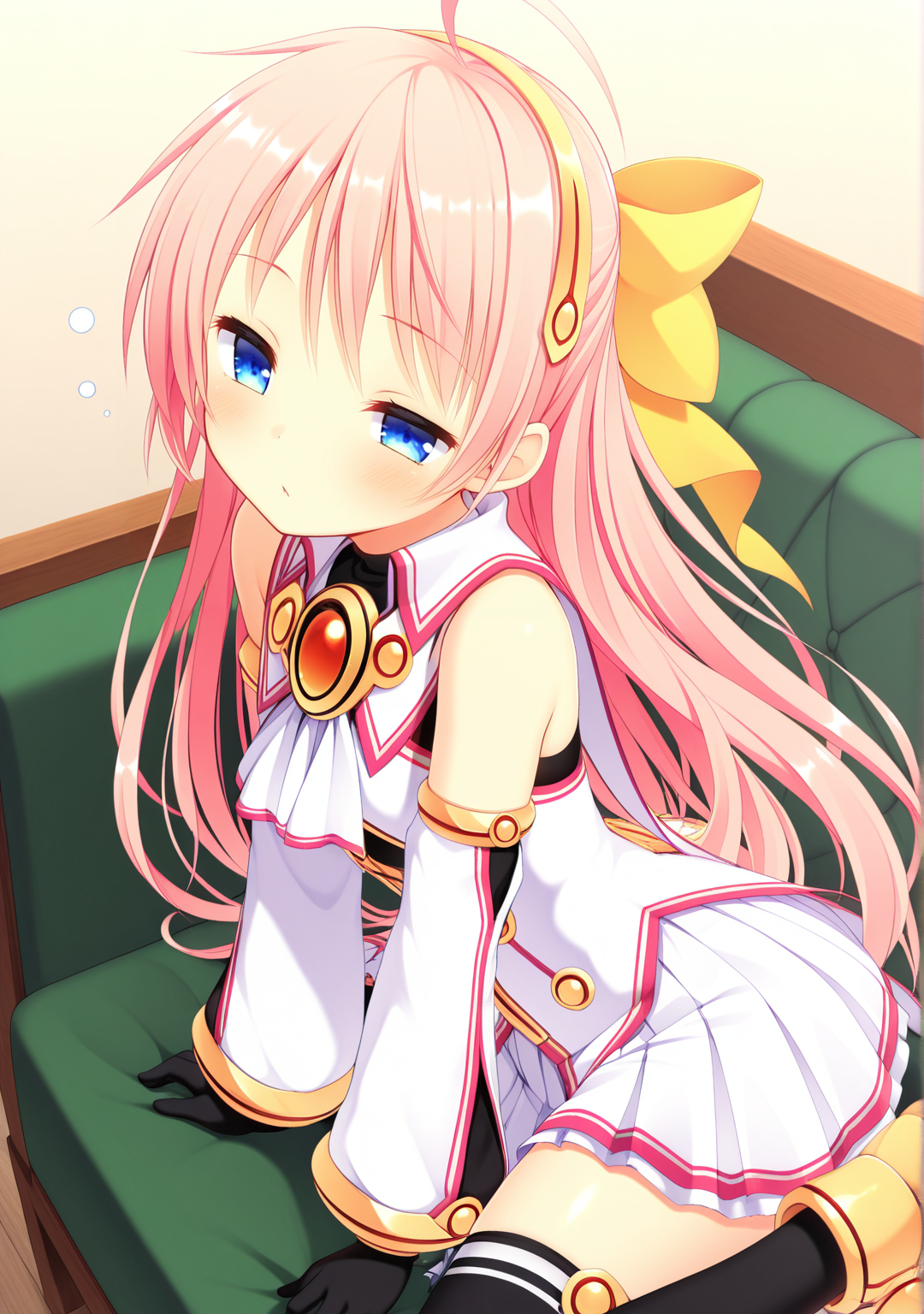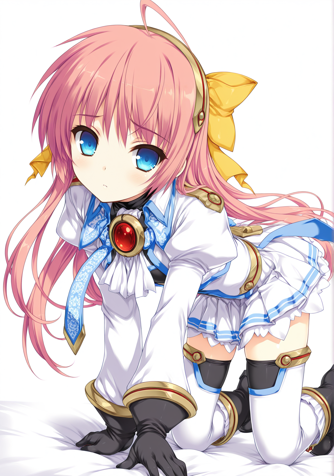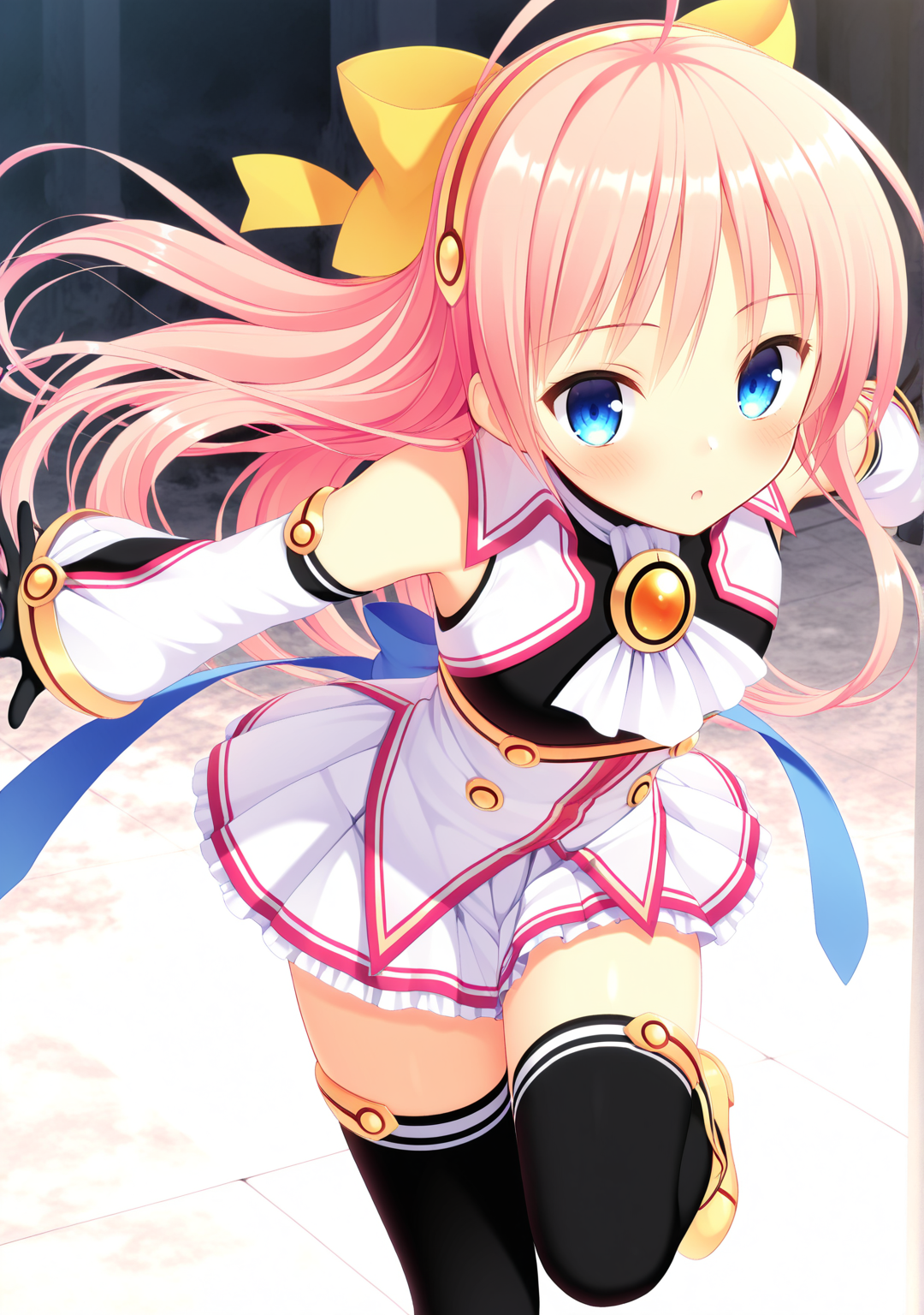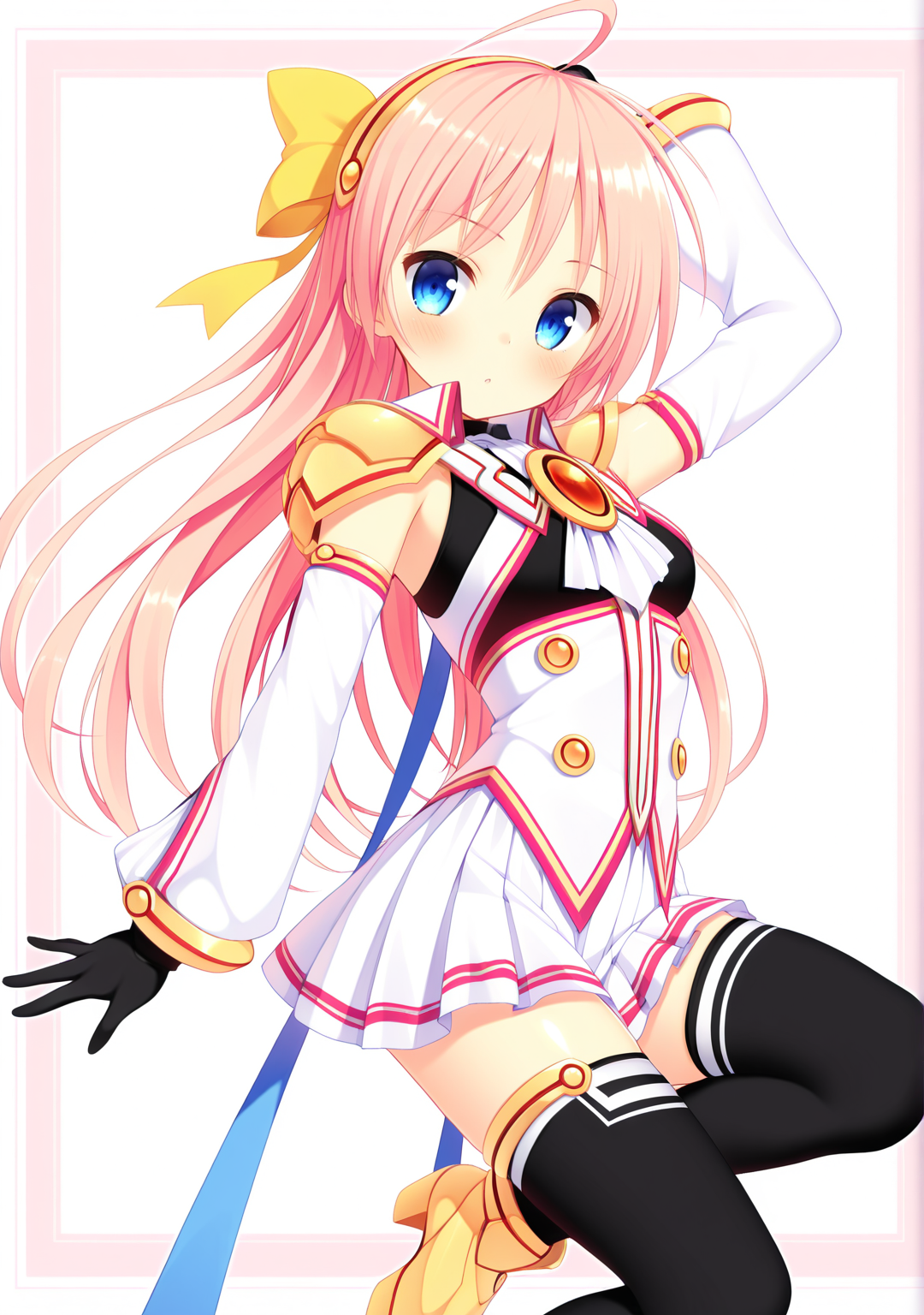 base(common):minasaka-arie,ahoge,pink hair,long hair,blue eyes,long sleeves,yellow bow,zettai ryouiki,hairband,hair bow,black gloves,brooch,jewelry,skirt,