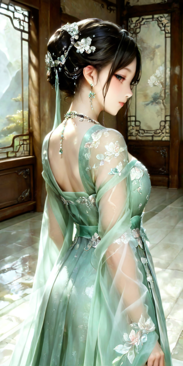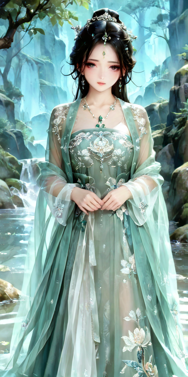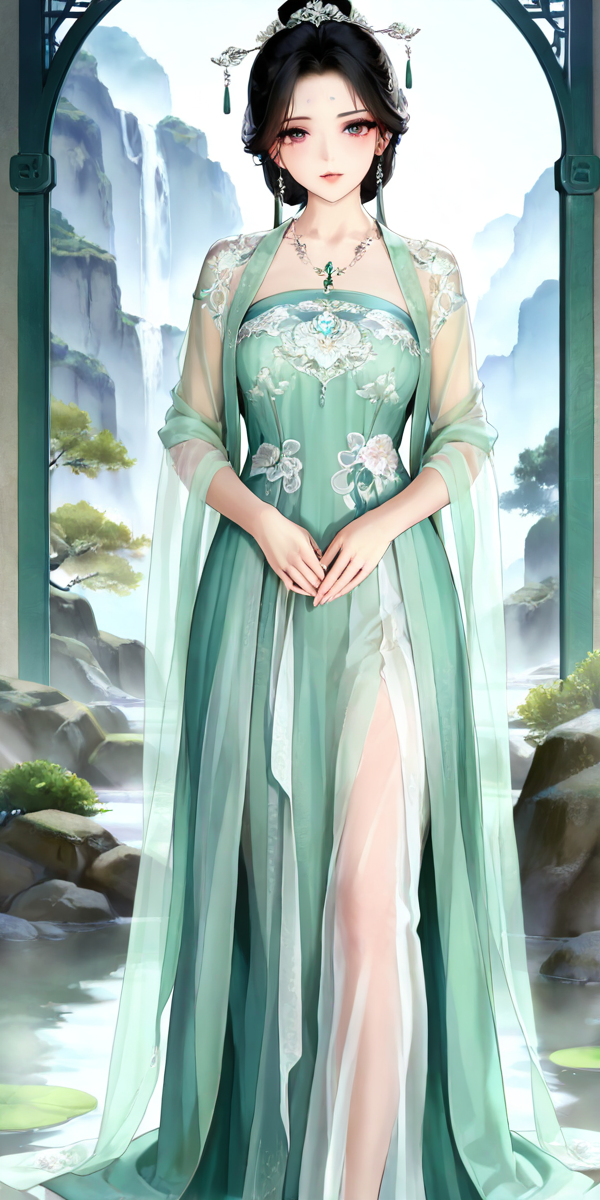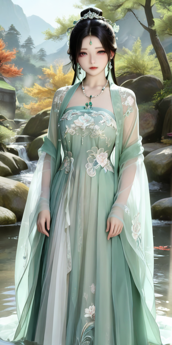 Prompt word: hanfu, dress, green dress, necklace, jewelry, see-through