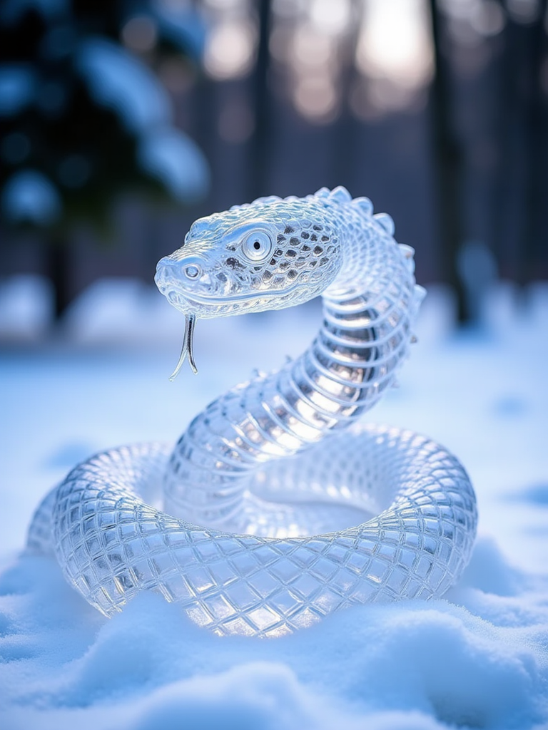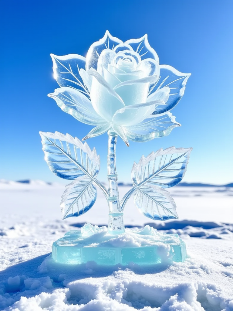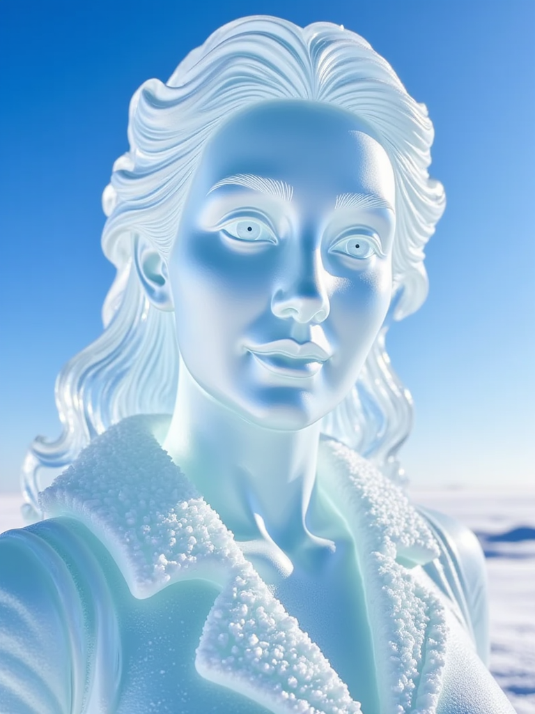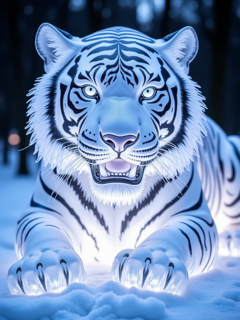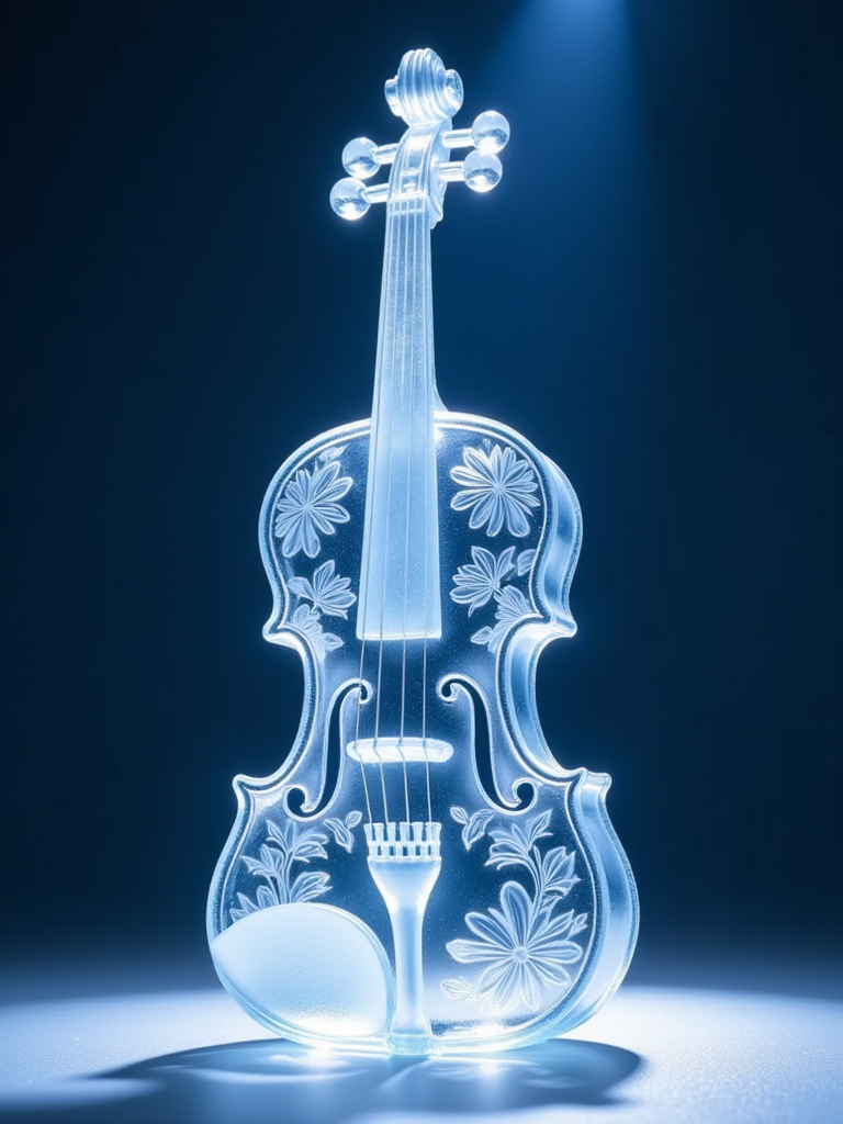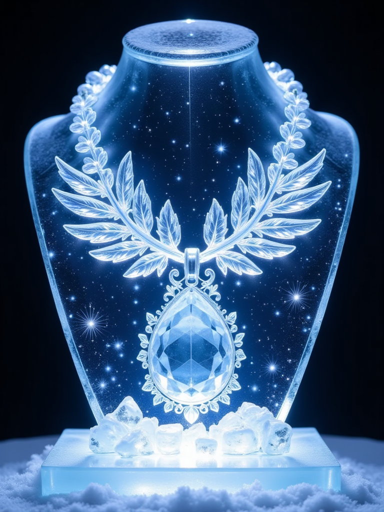 The ice sculpture displays an exquisitely intricate necklace. The necklace features a large symmetrical pendant, shaped like an inverted teardrop-cut diamond, set within a delicate frame composed of finely detailed transparent white gems and feather-like elements resembling angel wings. The gems emit a bright glow, presenting an ethereal luster. The overall background is a dark gradient blue, adorned with a pattern of twinkling stars.