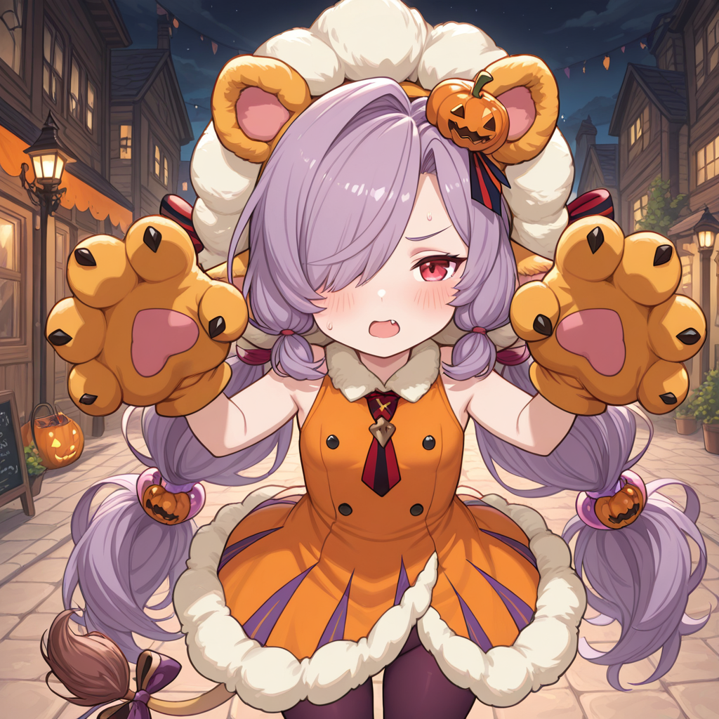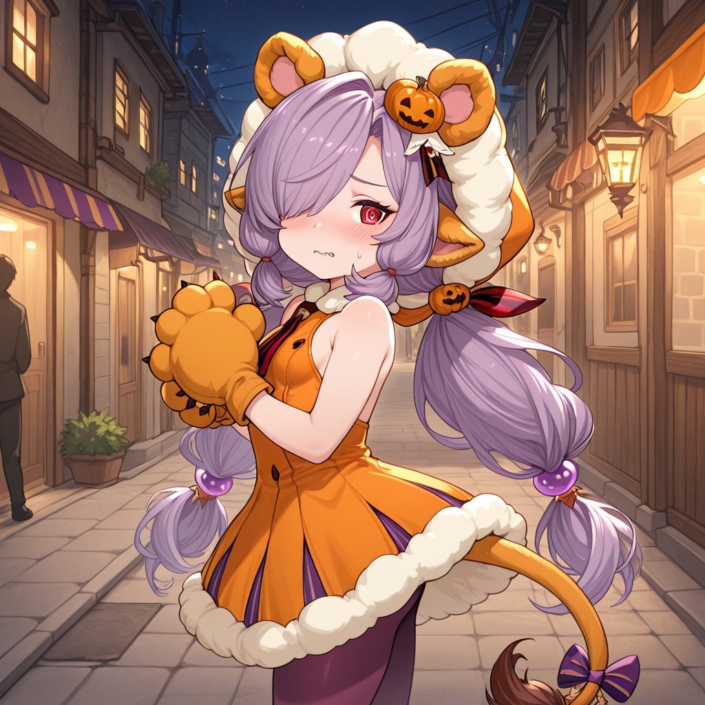 halnio, twintails, animal costume, orange dress, sleeveless dress, fur-trimmed dress, purple pantyhose, fake animal ears, lion ears, lion tail, tail bow, paw gloves, jack o' lantern hair accessory, orange boots,