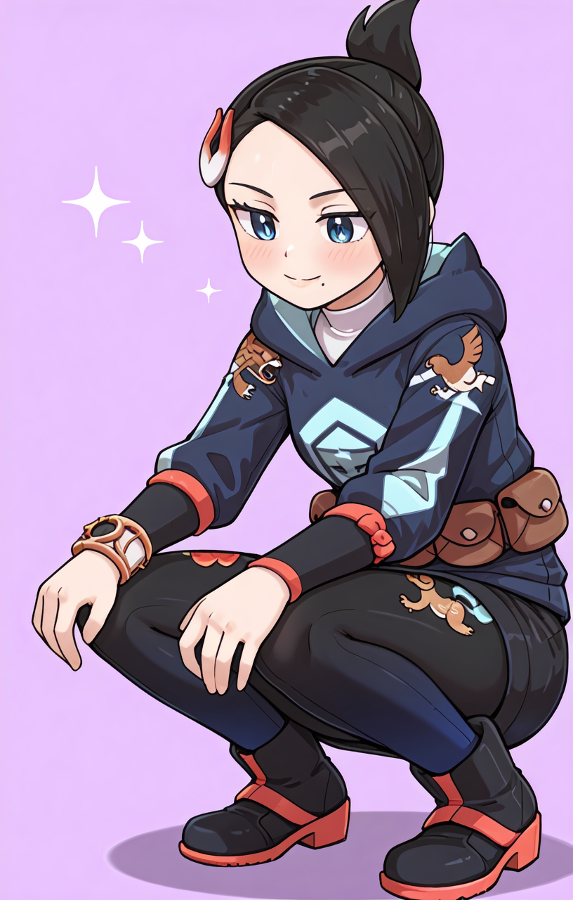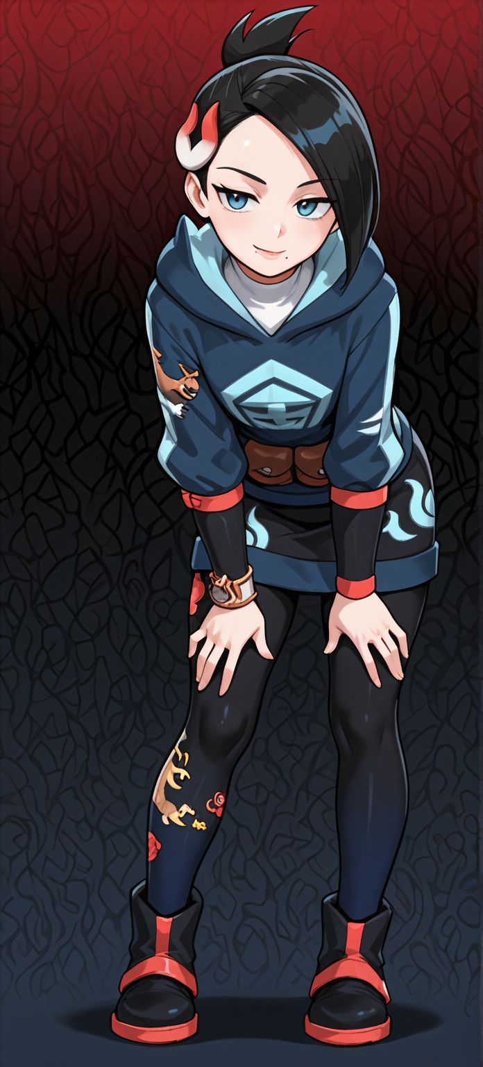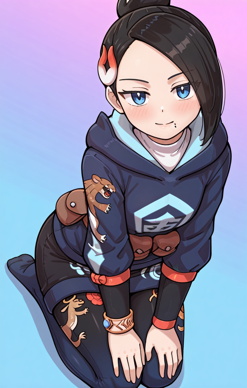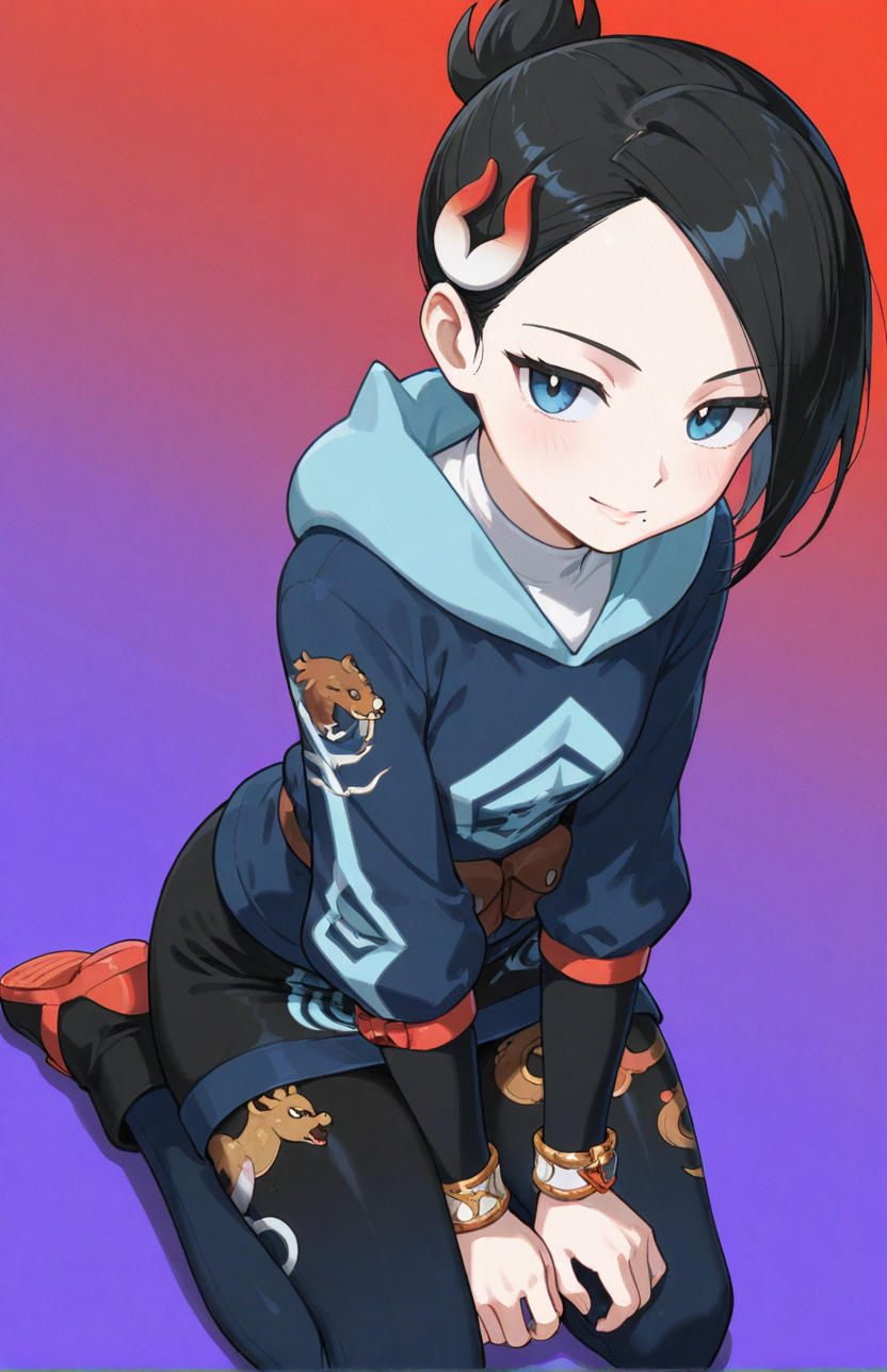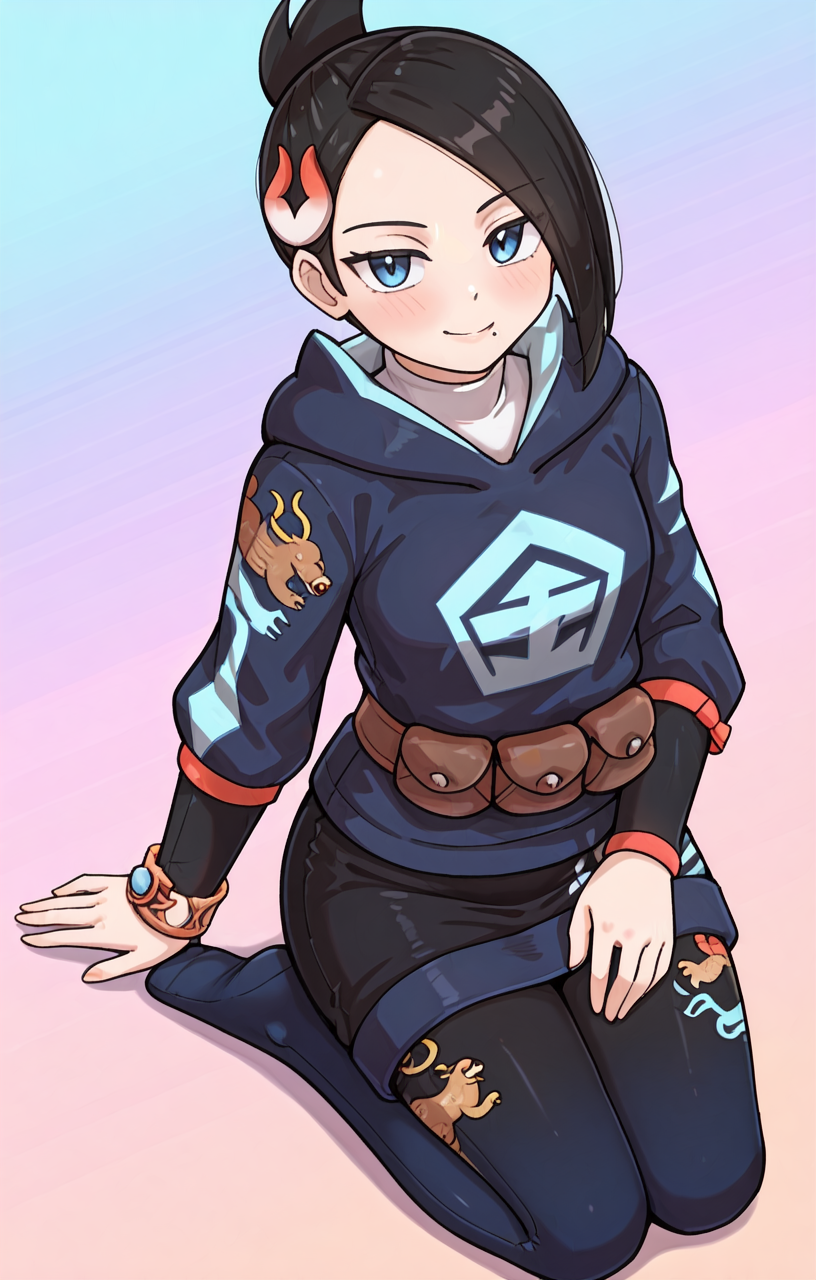 mai, mai \(pokemon\), black hair, blue eyes, short hair, mole under mouth, hair ornament, print hoodie, blue hoodie, character print, hood down, long sleeves, single bracelet, pouch, turtleneck shirt, white shirt, black skirt, print pantyhose, gradient legwear, black pantyhose, blue pantyhose, ankle boots, black footwear
