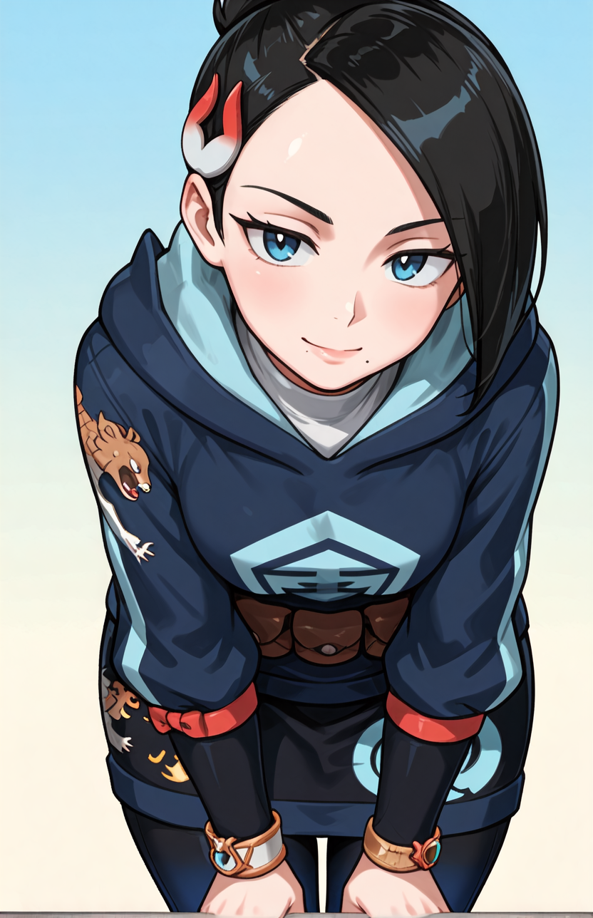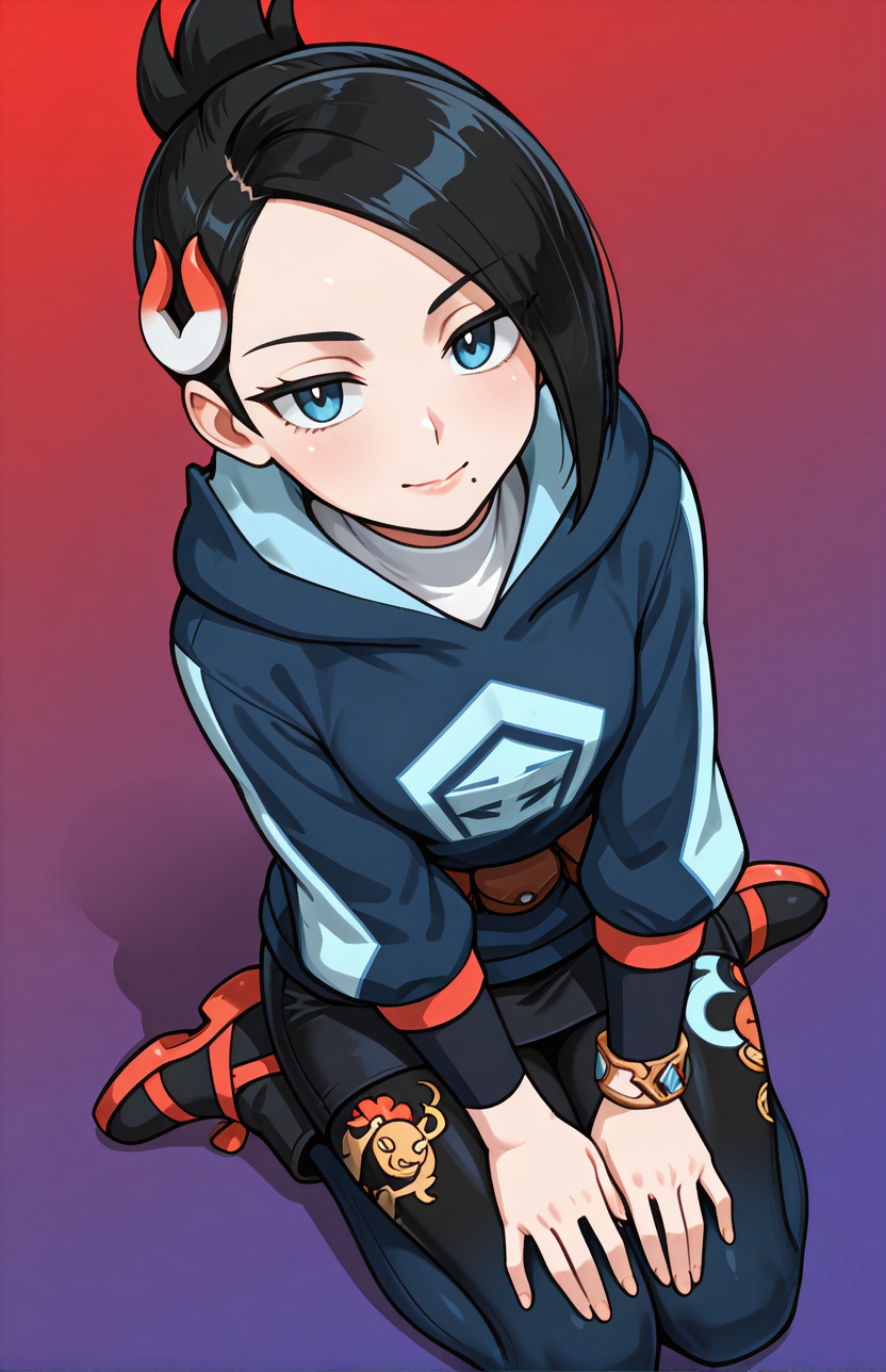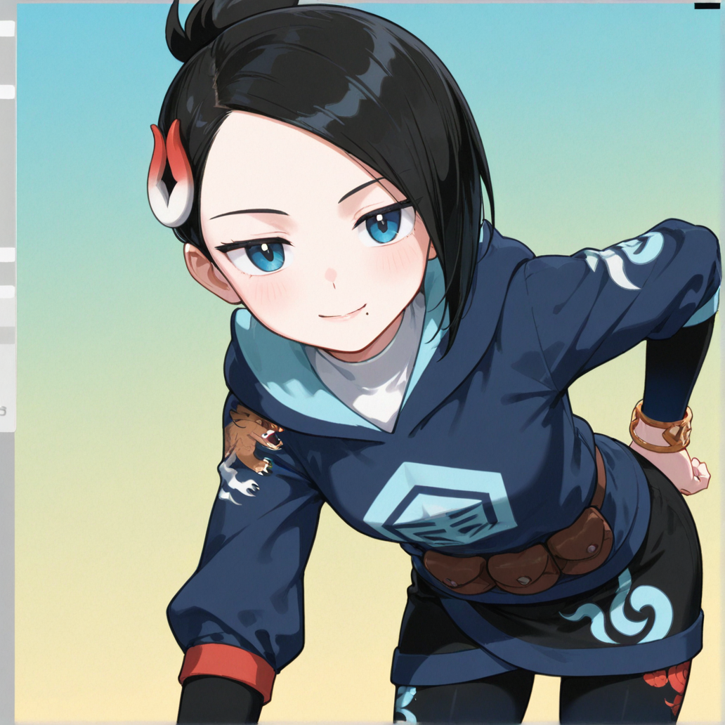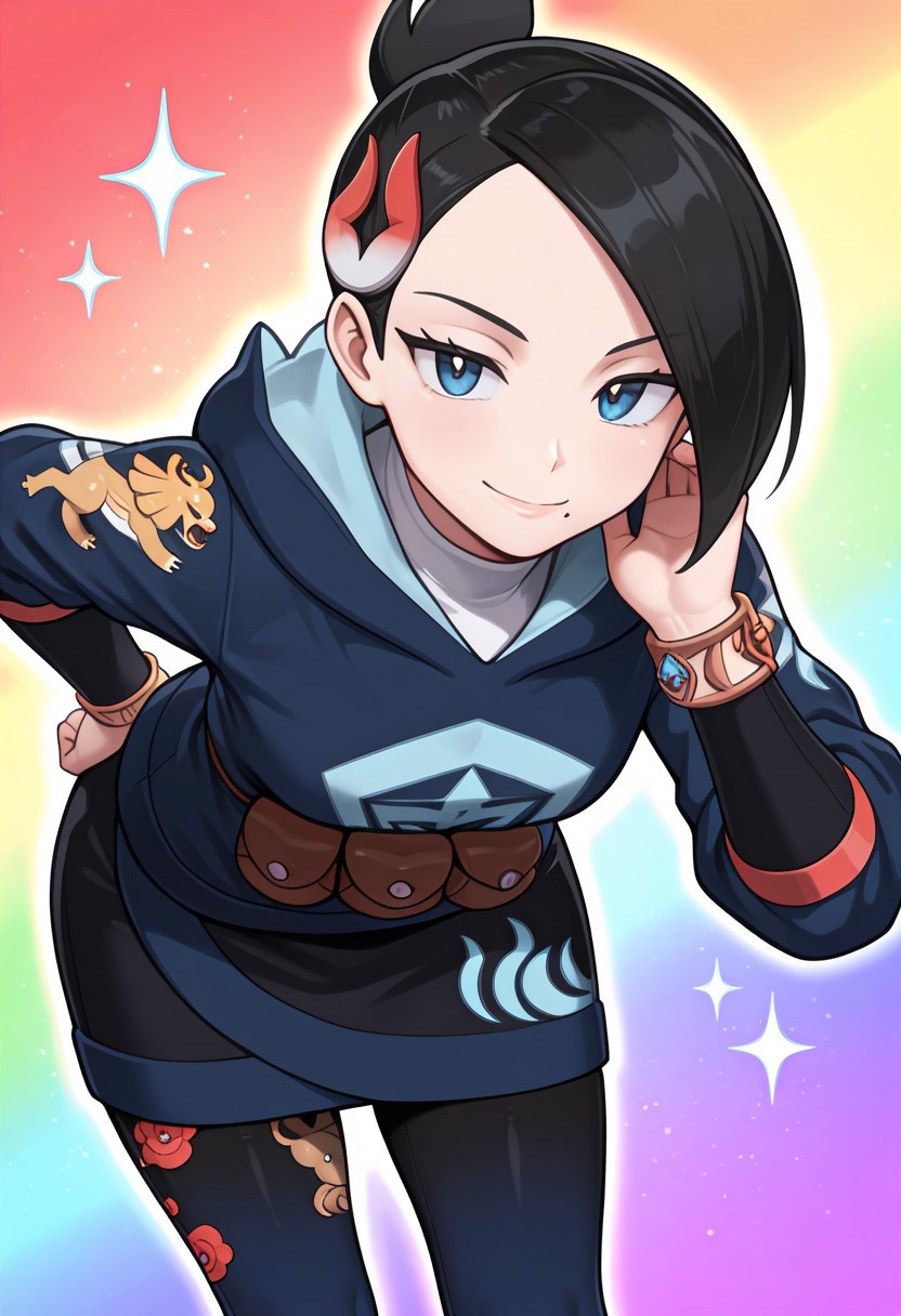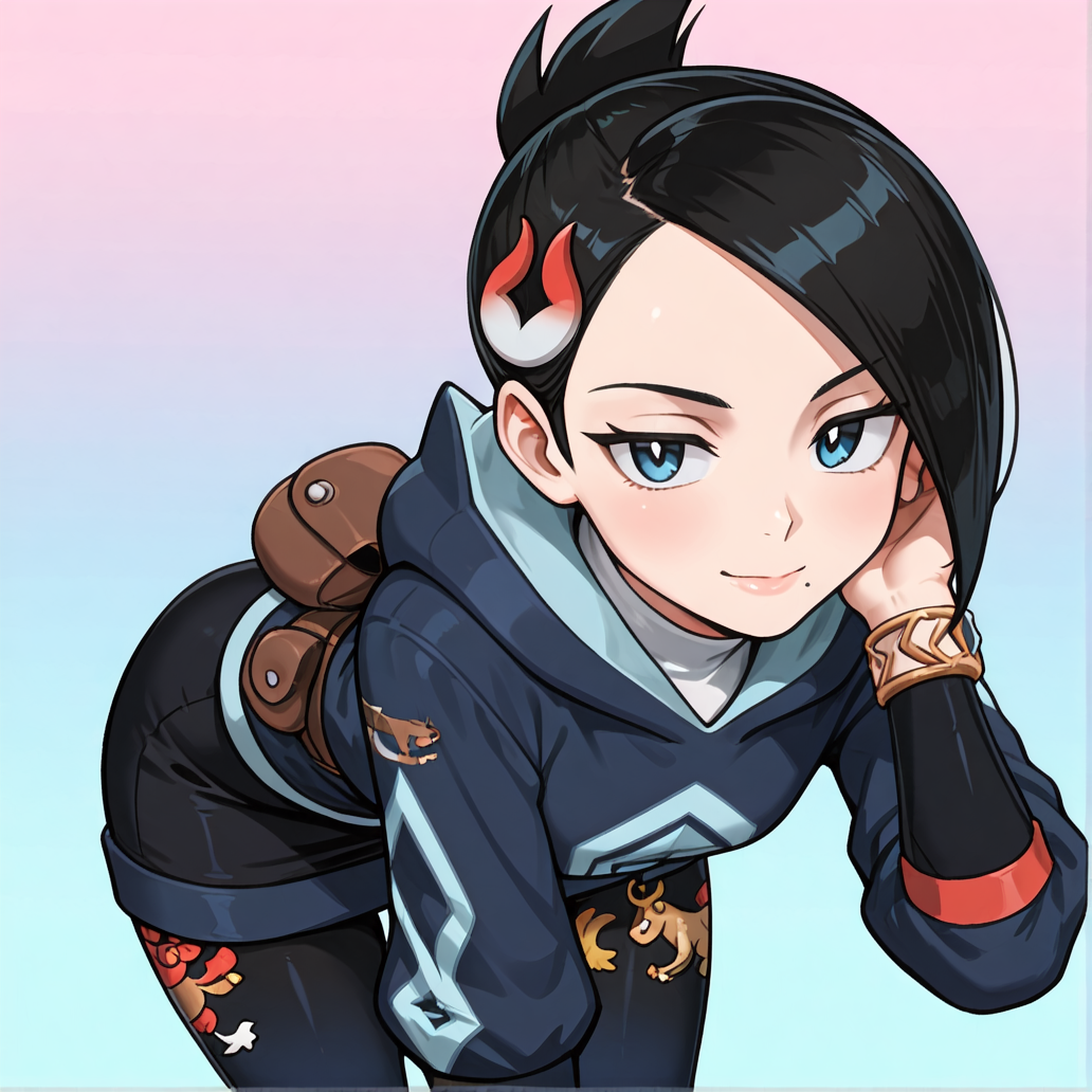 mai, mai \(pokemon\), black hair, blue eyes, short hair, mole under mouth, hair ornament, print hoodie, blue hoodie, character print, hood down, long sleeves, single bracelet, pouch, turtleneck shirt, white shirt, black skirt, print pantyhose, gradient legwear, black pantyhose, blue pantyhose, ankle boots, black footwear