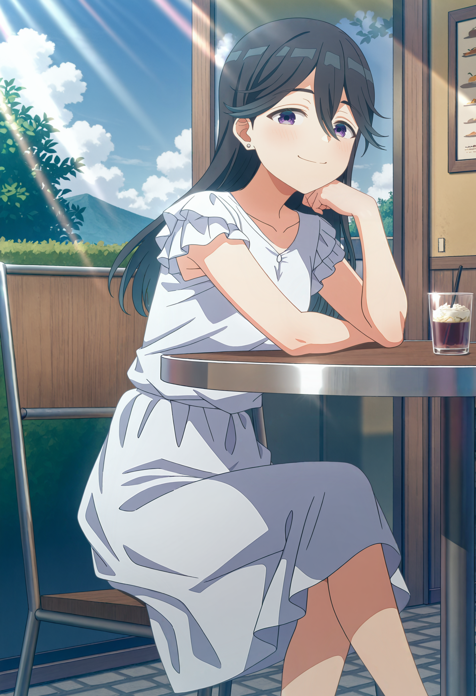 WatariYayoi, purple eyes, black hair, long hair, purple hair bow, ponytail, double parted bangs — Replace "purple hair bow, ponytail" with "hair down" for alternative hair style