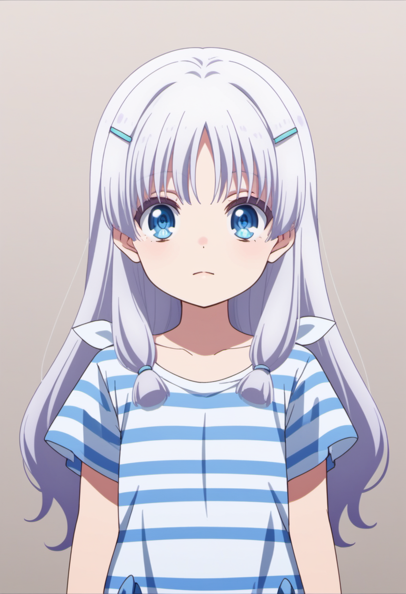 When she is a child: naruse shiroha, long hair, white hair, blue eyes, child