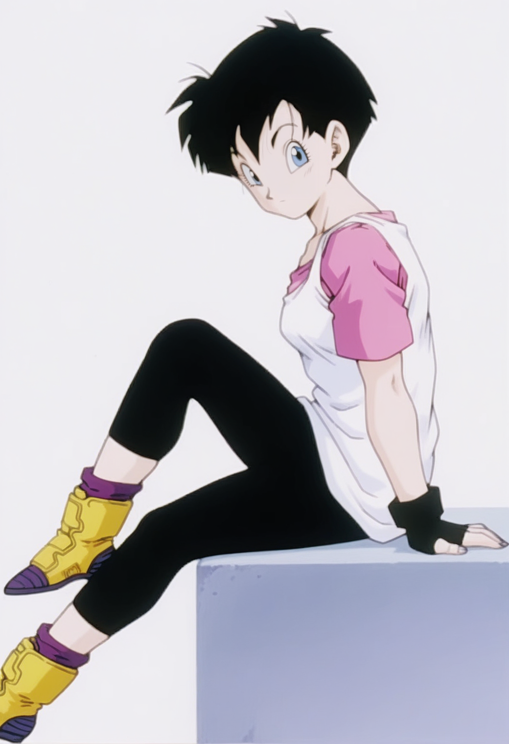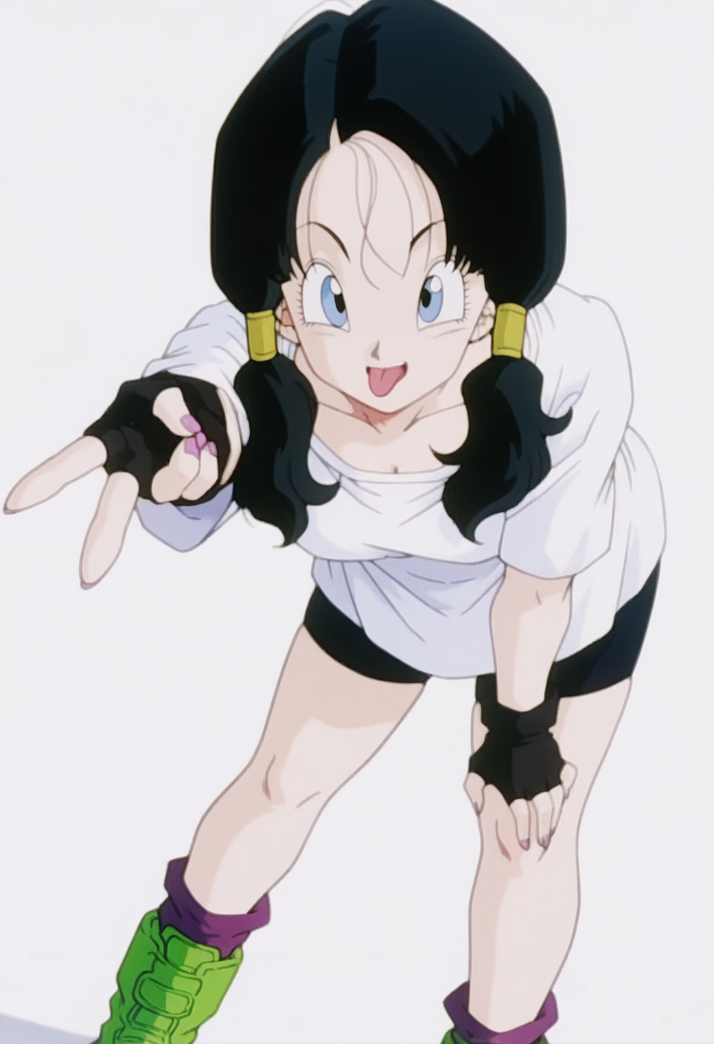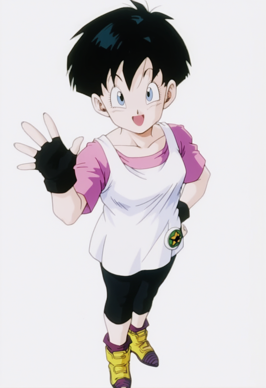 short hair, white tank top, pink undershirt, black gloves, fingerless gloves, leggings, yellow footwear,