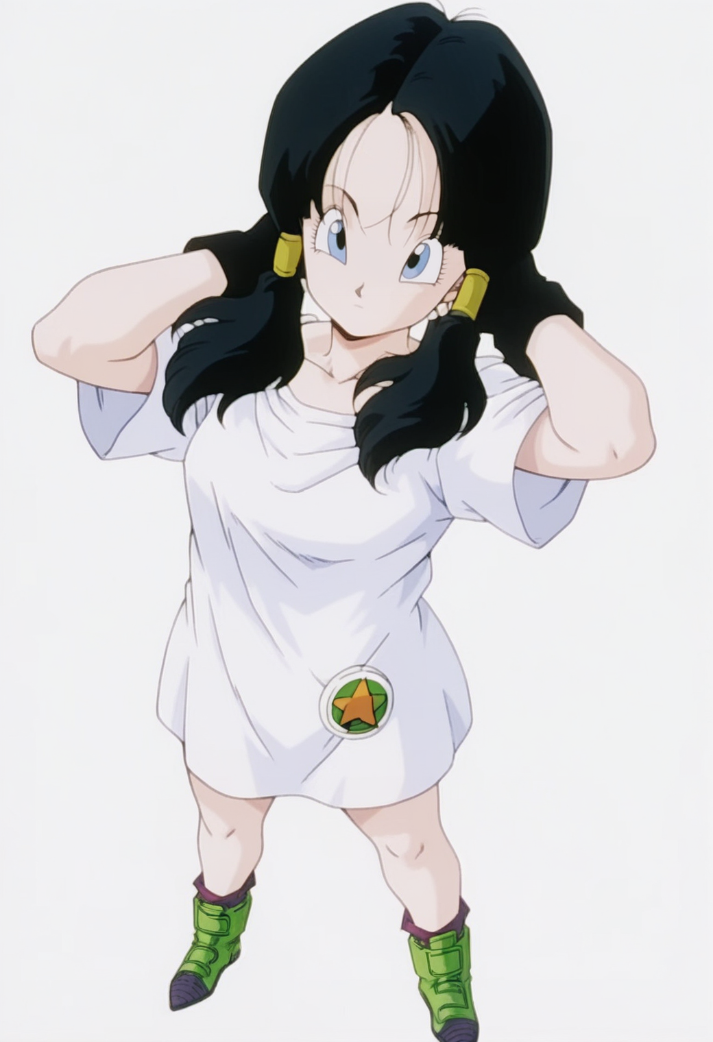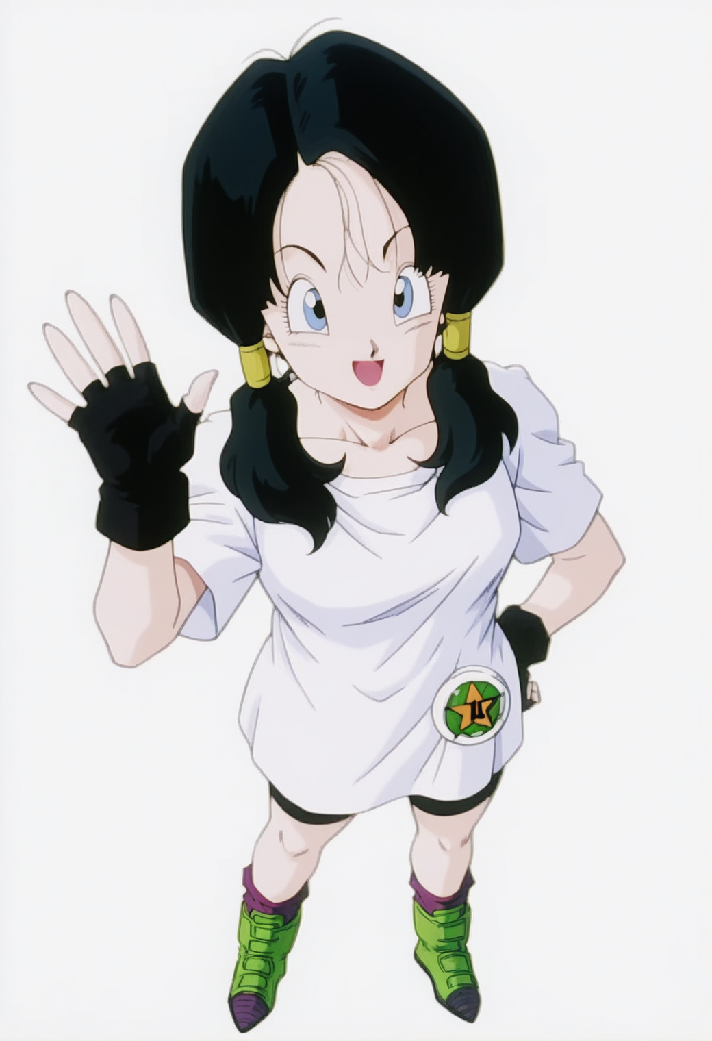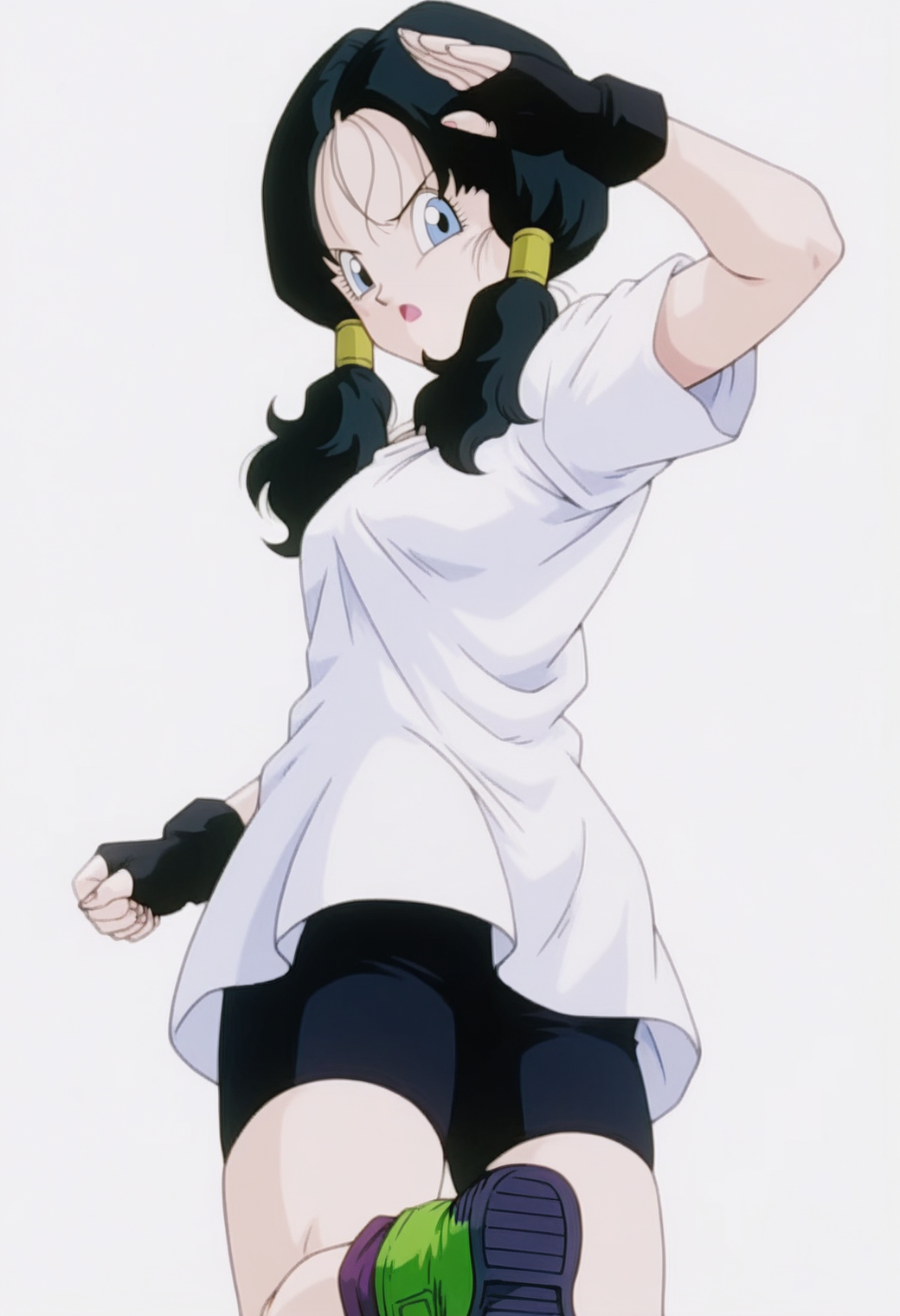 long hair, low twintails, hair tubes, white shirt, bike shorts, fingerless gloves, black gloves, green footwear,