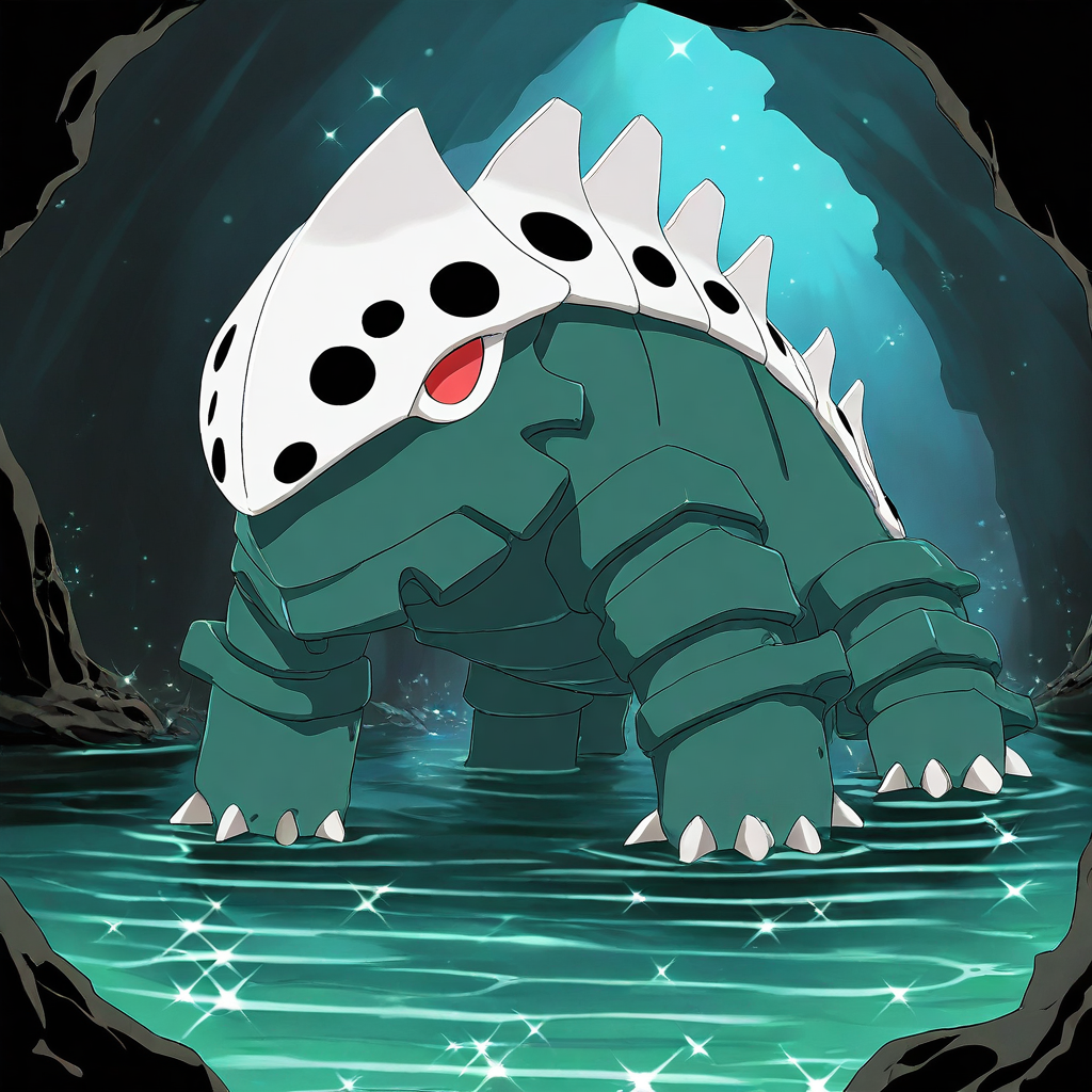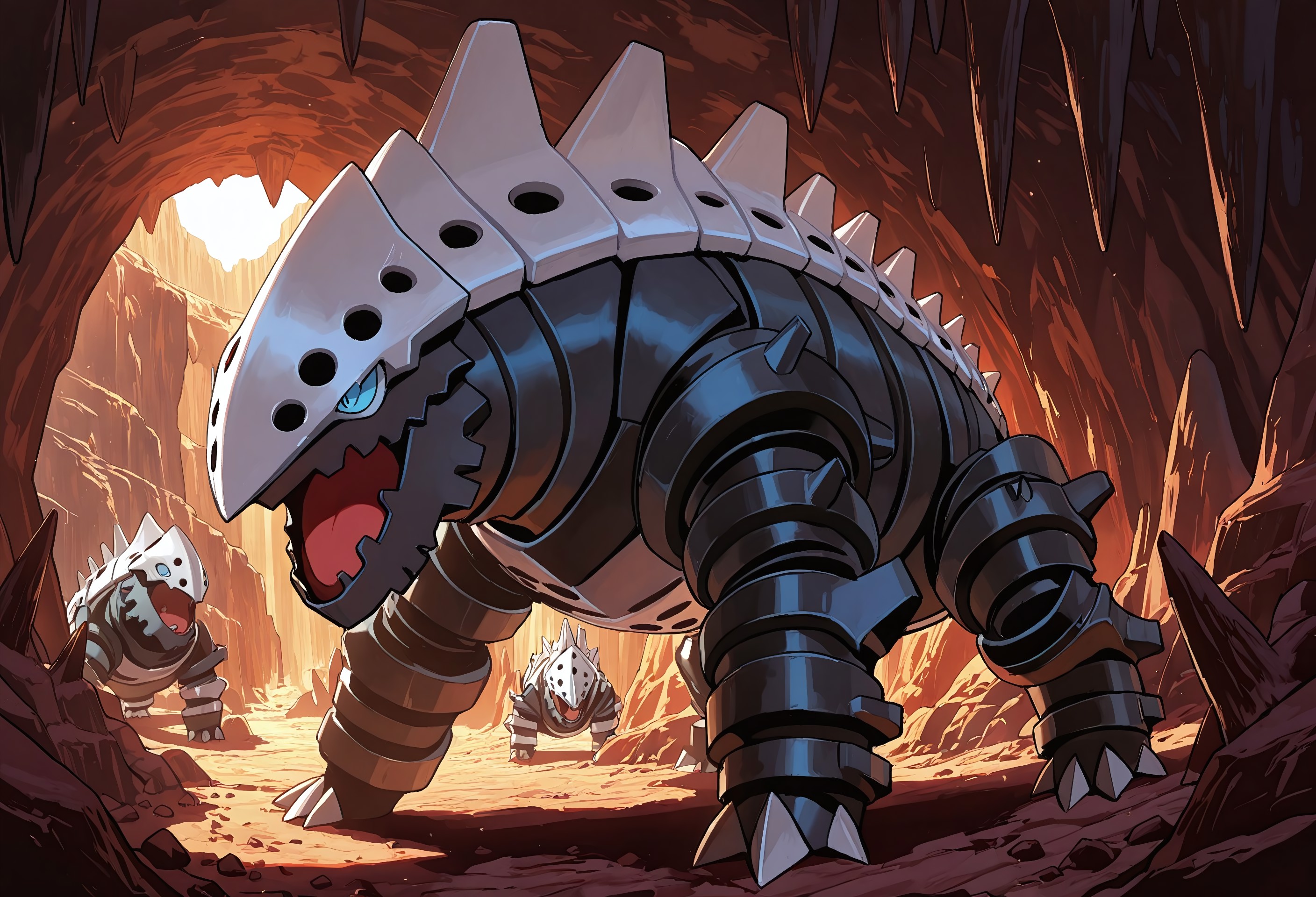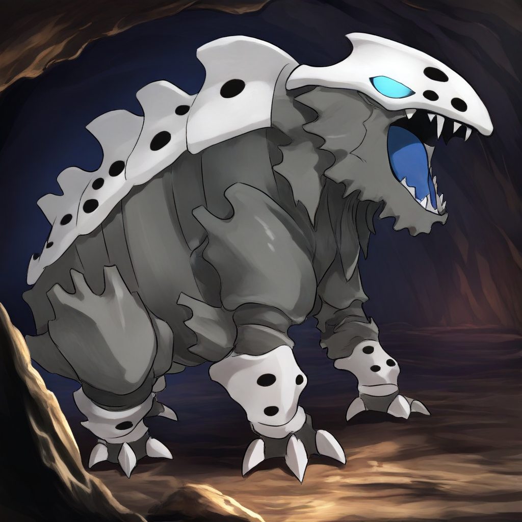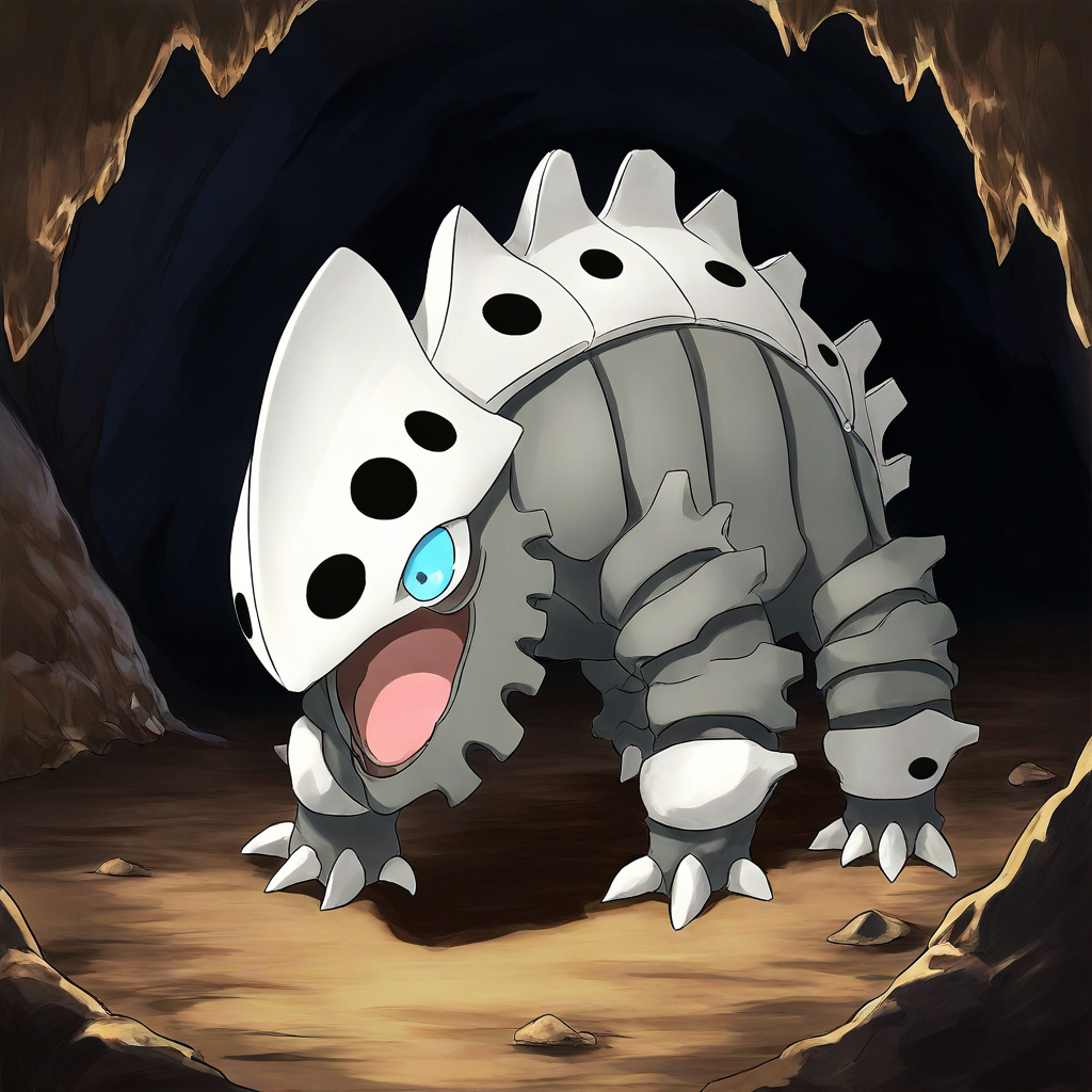 Lairon_pkmn, gray skin, blue eyes, white armor, black dots on armor