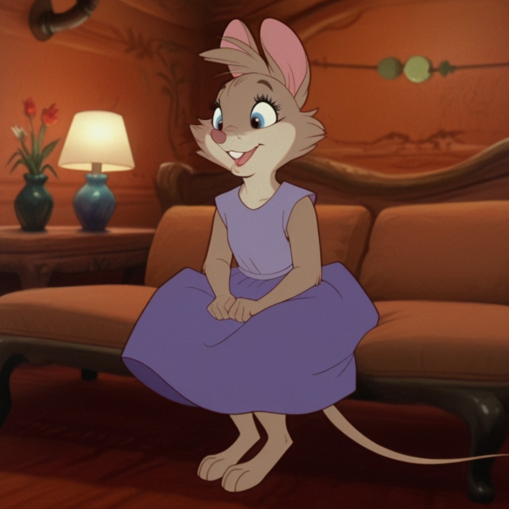 TrsBrsbyil, semi-anthro, female-mouse, buck teeth, brown fur,short hair, whiskers, blue eyes, pink hairbow, purple sleeveless dress