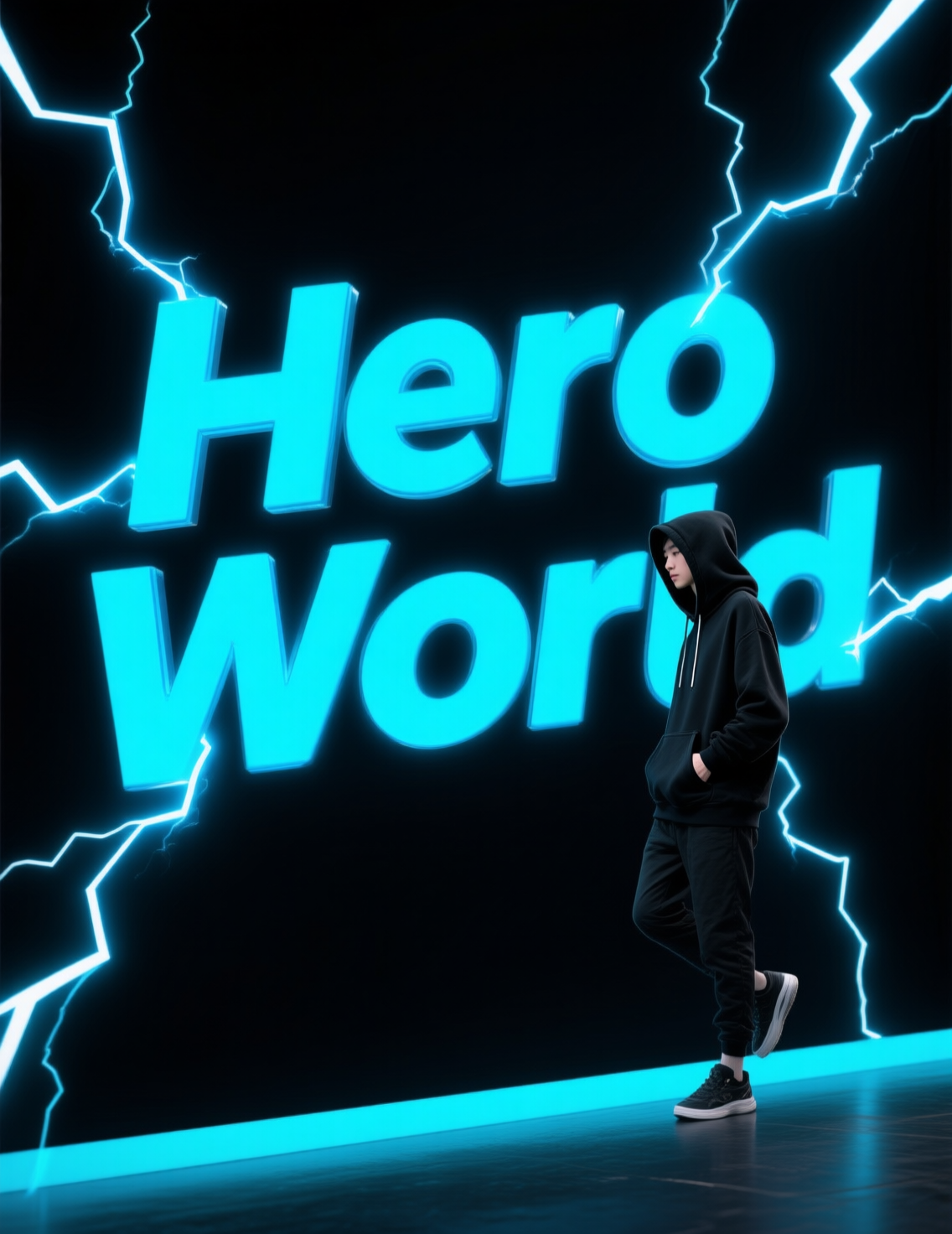 In the scene,a person wearing a black hoodie with the hood on,has one hand in the pocket and the other leg slightly raised,appearing casual yet cool,standing next to the large word "Hero World" The word has a black background with bright blue lightning surrounding its edges. The lightning resembles lively lines,as if there is energy flowing through them. Against the dark background,it becomes more eye-catching,full of technological and dynamic feelings. The overall atmosphere creates a cool cyberpunk style,as if the figure forms a mysterious and trendy scene,demonstrating unique personality and avant-garde style.,