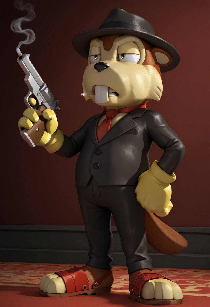 Fastidious Beaver, brown fur, yellow eyes, yellow muzzle, yellow chest fur, buck teeth, dark brown tail, red bow tie, yellow gloves, red sandals