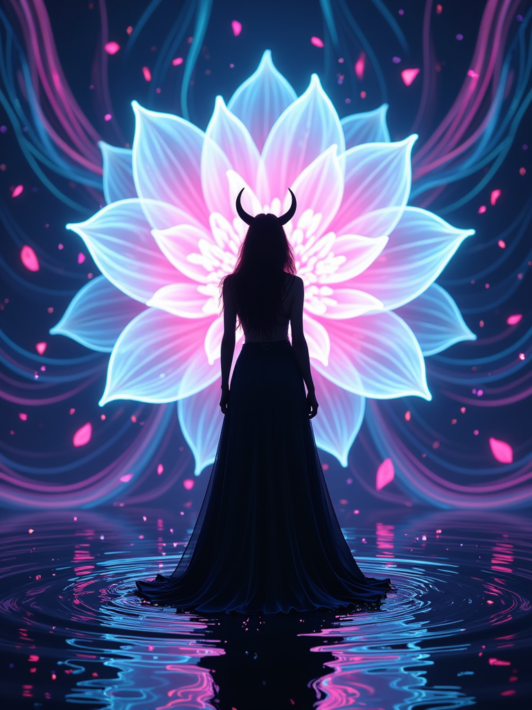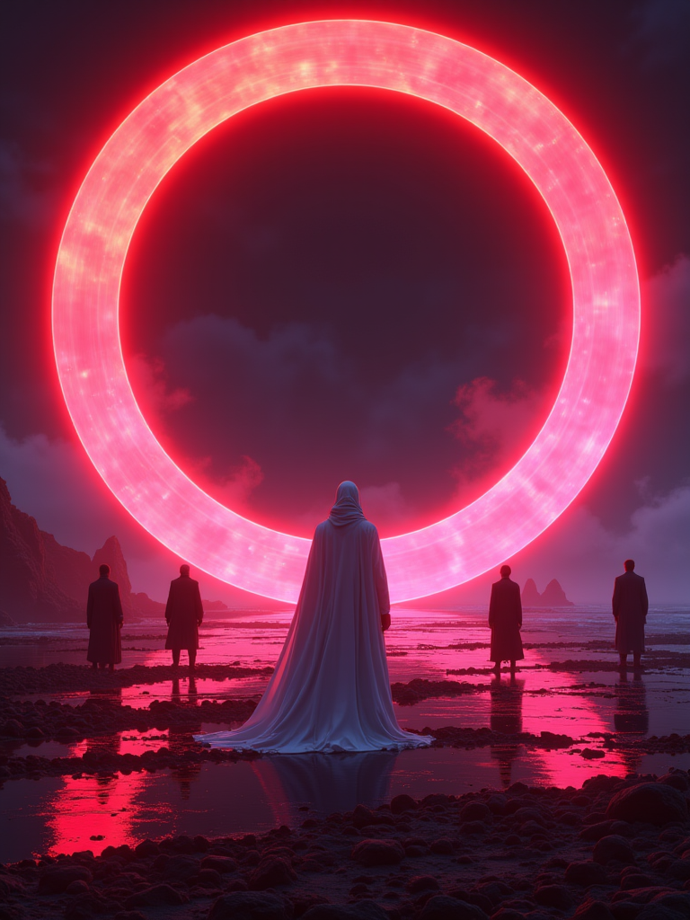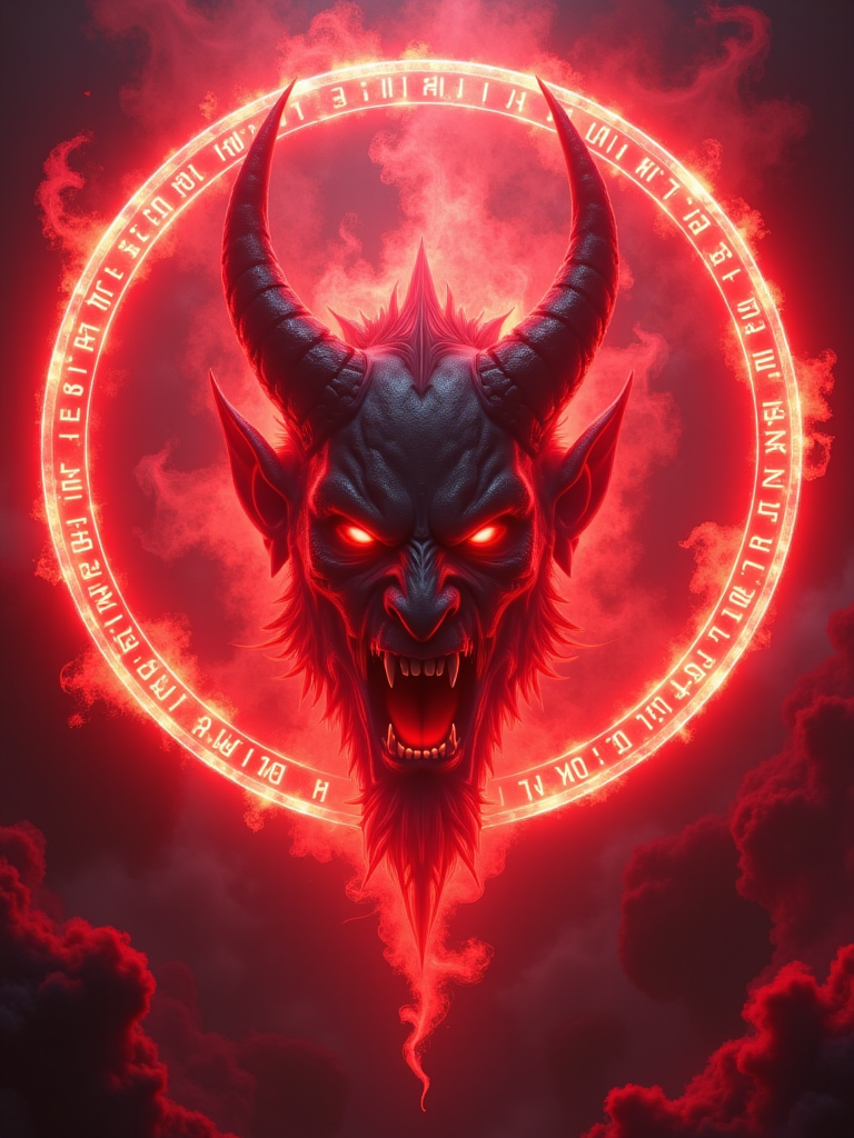 Concept art, a massive devil head composed of pure shadow and red energy, roaring in a void. Its form is defined and amplified by an equally massive red halo, ringed with glowing hot runes. The devil head seems to be born from the halo, or the halo is the source of its power. Smoky energy, glow effect, evil, mysterious, powerful. Stylized by Android Jones and Beeple.