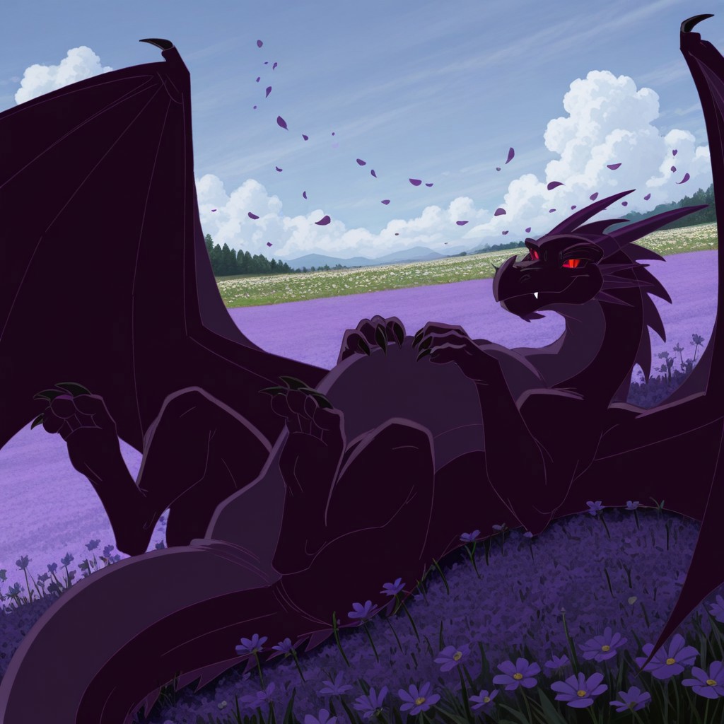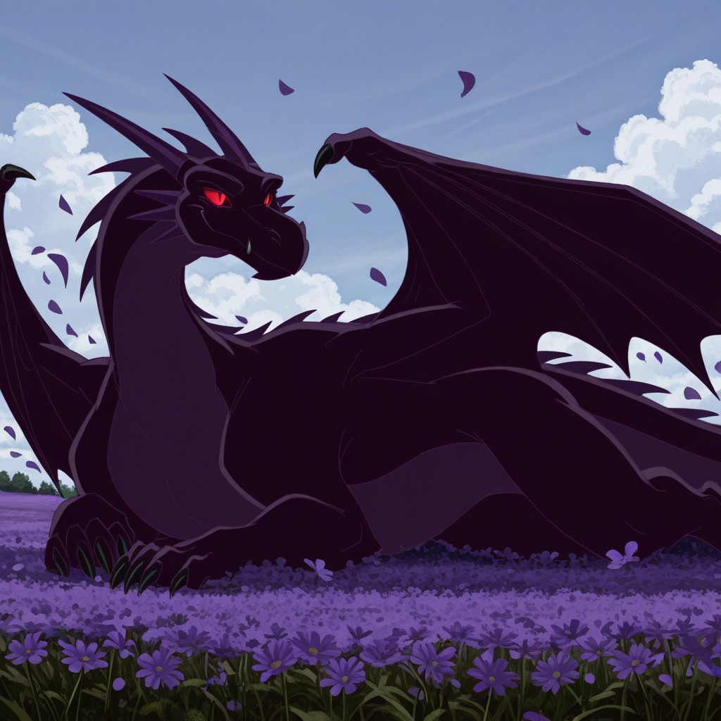 Glasburgh Dragon, dragon, dark purple body, purple belly, purple horns, purple spines, black claws, glowing red eyes