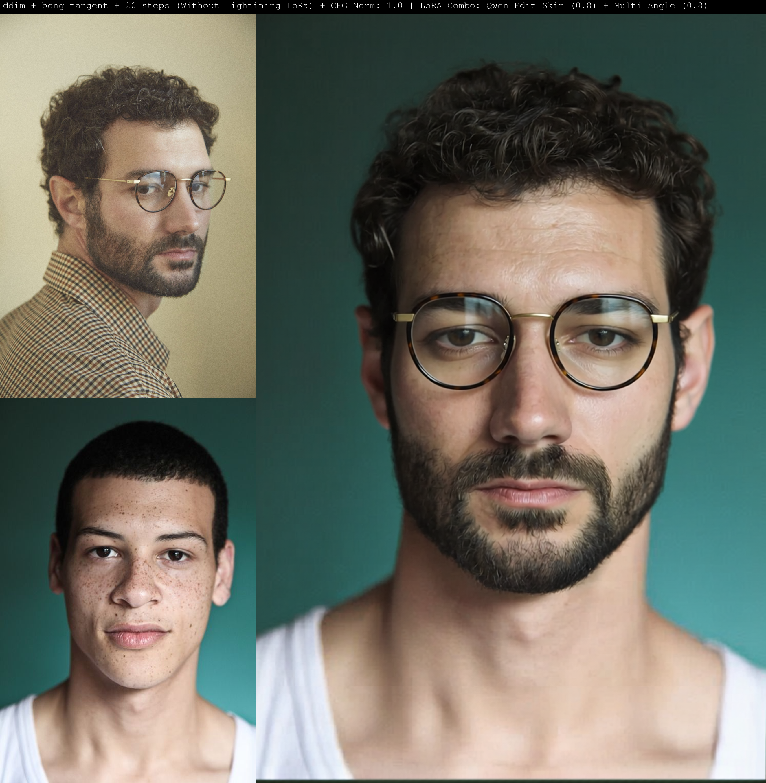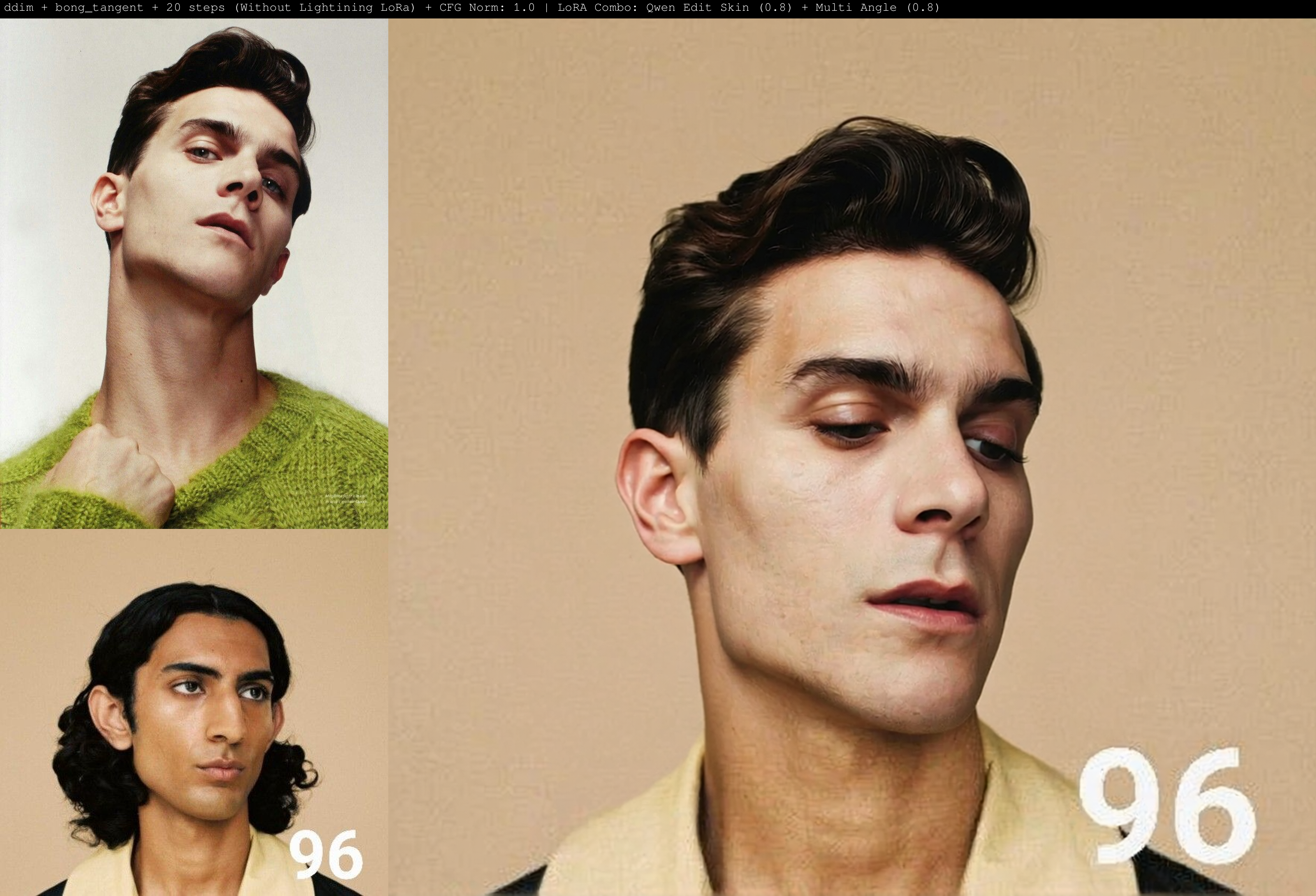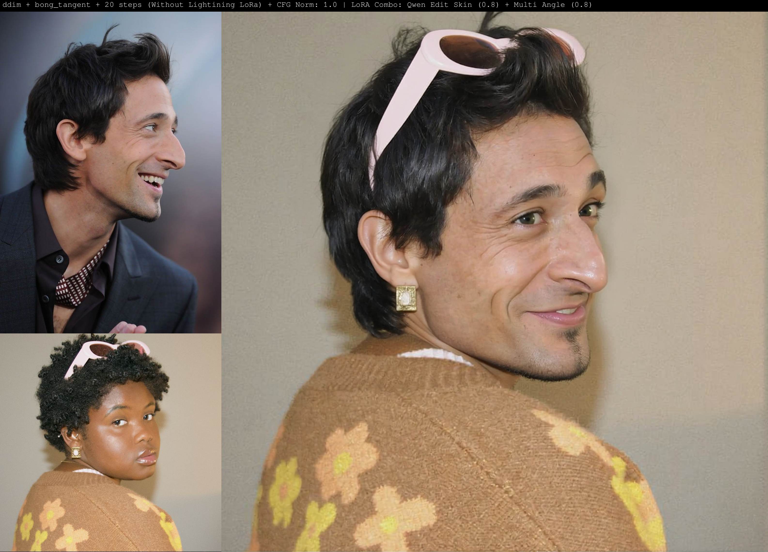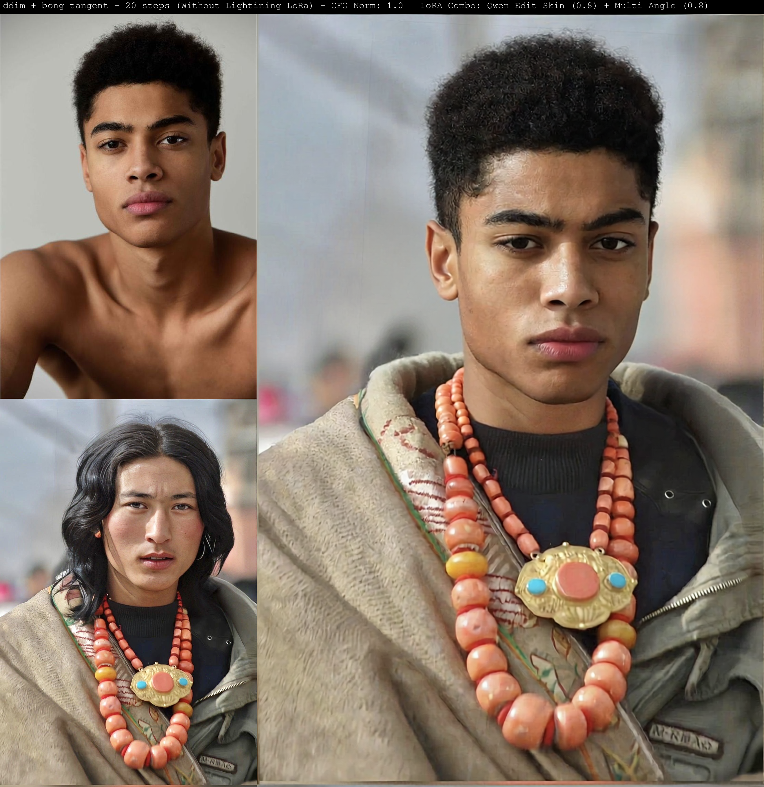 Lightning LoRA: may produce plastic-like skin, especially when mixed with other Qwen-based LoRAs.