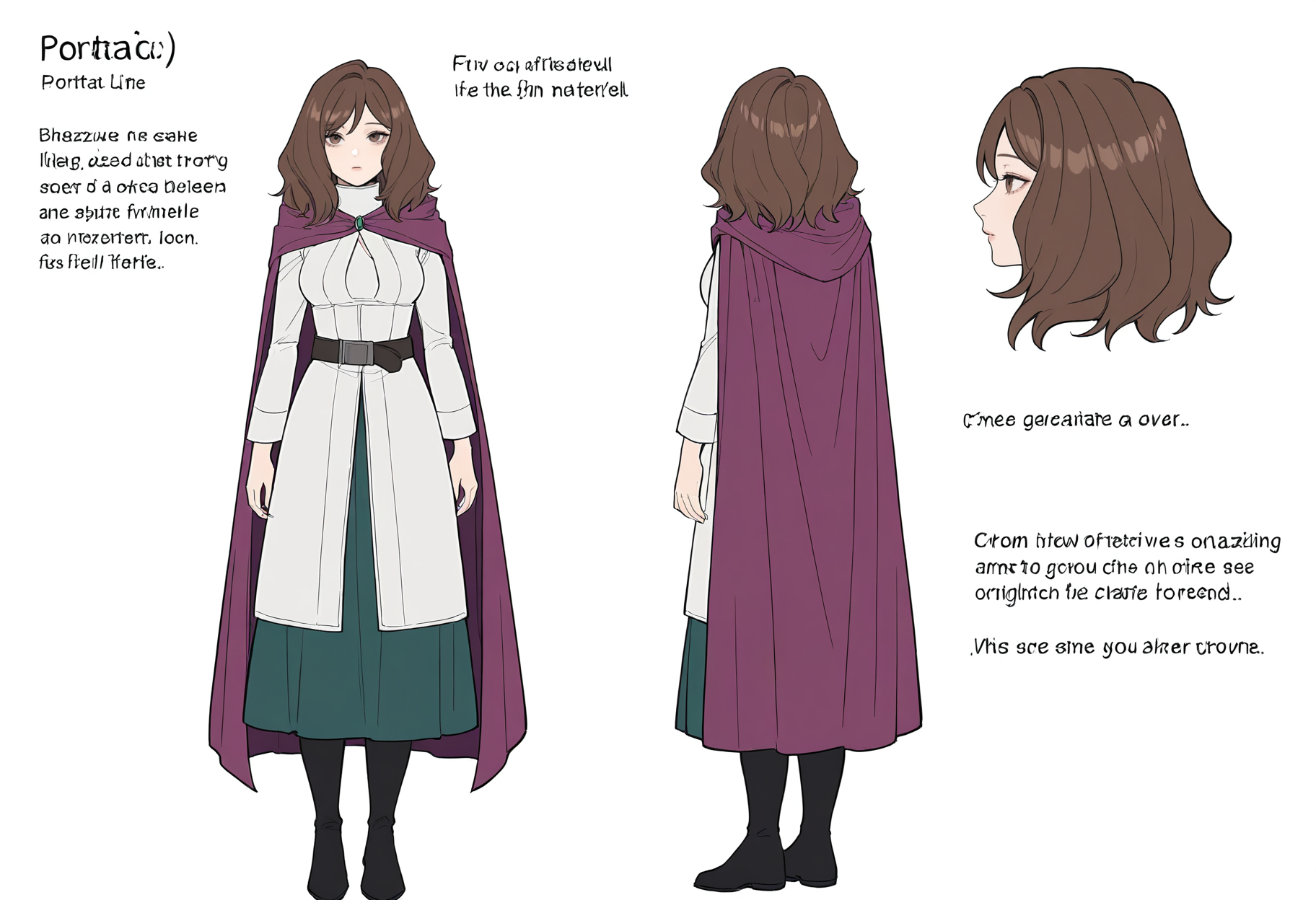 boots,dress,cape,black footwear,long sleeves,green skirt,skirt,cloak,belt,breasts,purple cape,white dress,robe