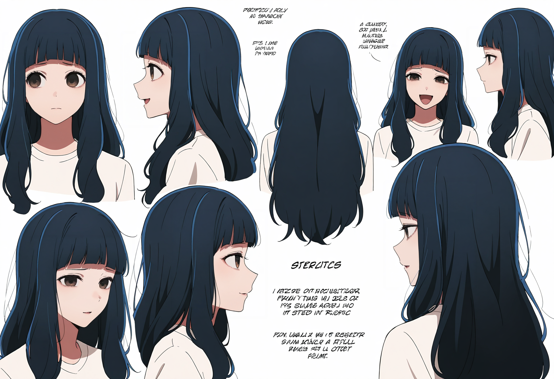 1girl,black eyes,brown eyes,black hair,blue hair,long hair,bangs,blunt bangs
