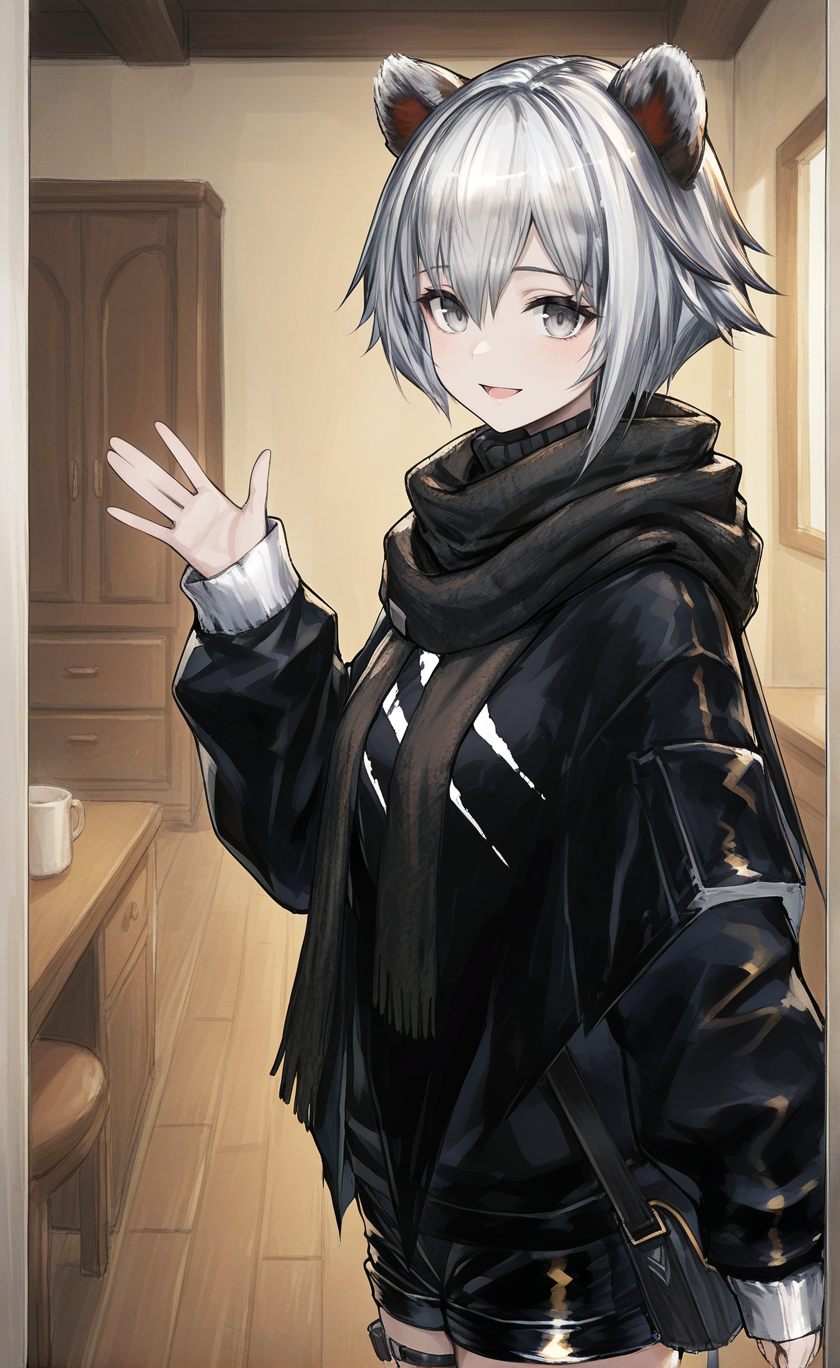 best quality,masterpiece,arknitsm1sh,(arknights,pale skin:0.8),1girl,solo, grey hair, short hair, hair between eyes, grey eyes,animal ears, bear ears,black jacket, jacket, long sleeves, sleeves past wrists, black scarf, black shorts, short shorts, shorts, thigh strap, living room,smile,looking at viewer,sensitive, <lora:ArknightsMisha:1>