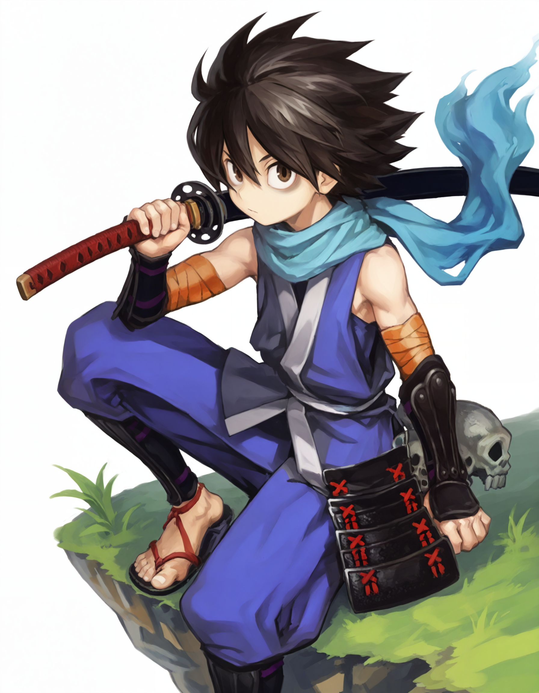 kisukeom,1boy,male focus,solo,black hair,brown eyes,blue scarf,bare shoulders,japanese clothes,dark blue shirt,shirt under shirt,bandaged arm,black gauntlets,kurokote,skull,kusazuri,dark blue pants,baggy pants,gaiters,sandals,
