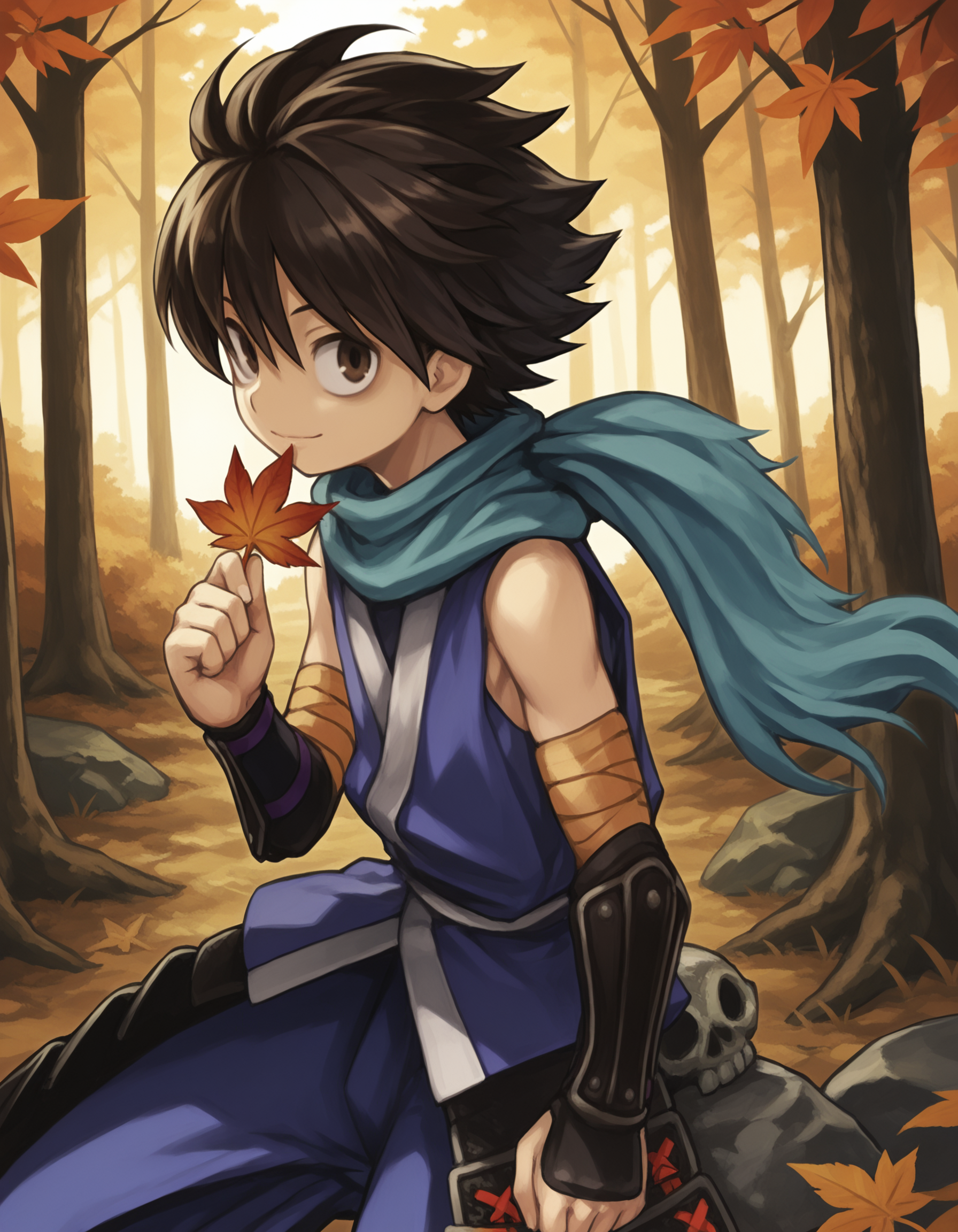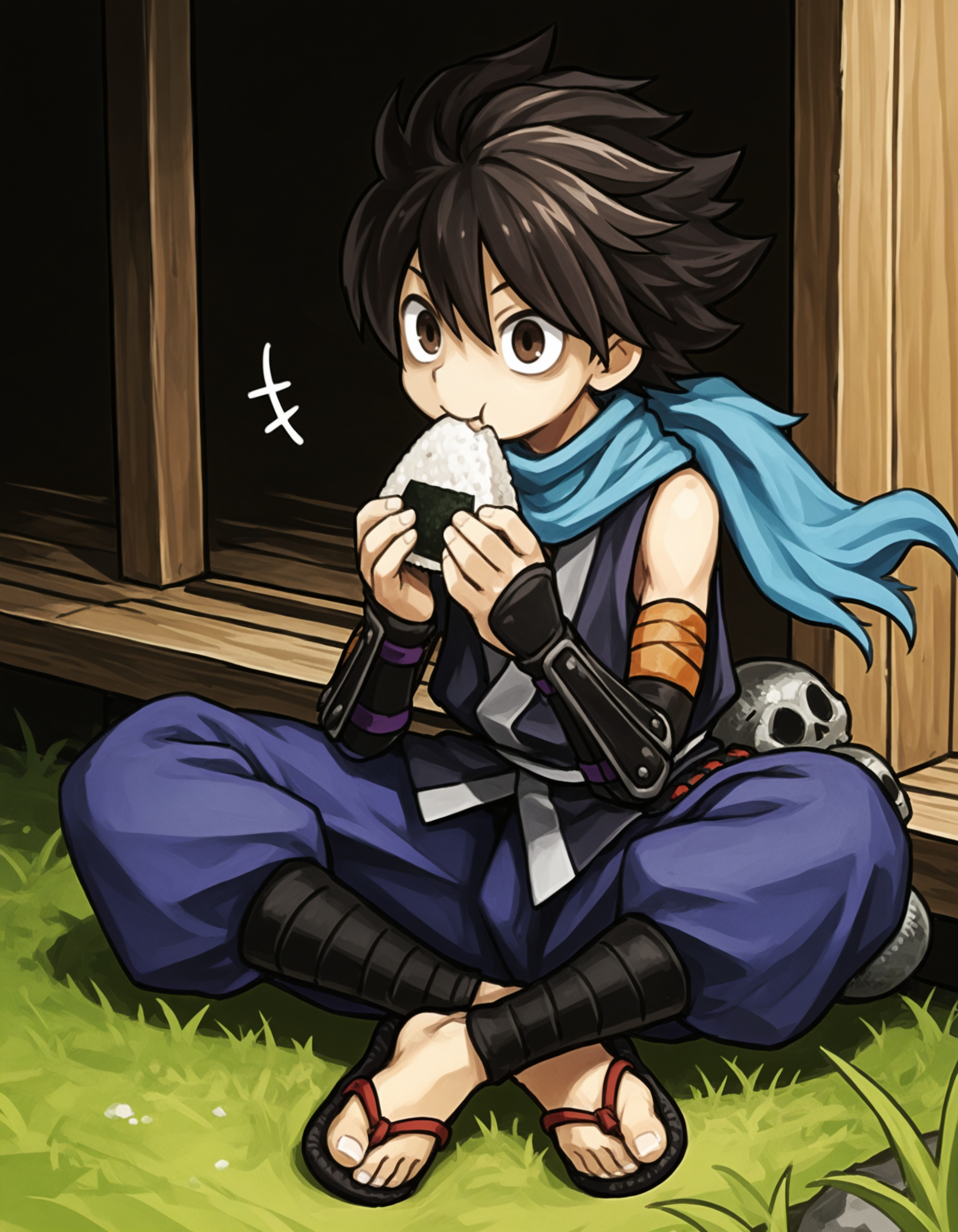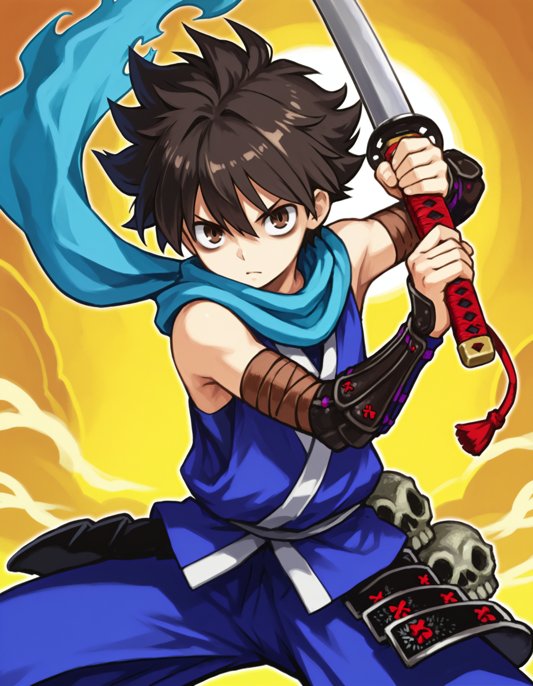kisukeom,1boy,male focus,solo,black hair,brown eyes,blue scarf,bare shoulders,japanese clothes,dark blue shirt,shirt under shirt,bandaged arm,black gauntlets,kurokote,skull,kusazuri,dark blue pants,baggy pants,gaiters,sandals,