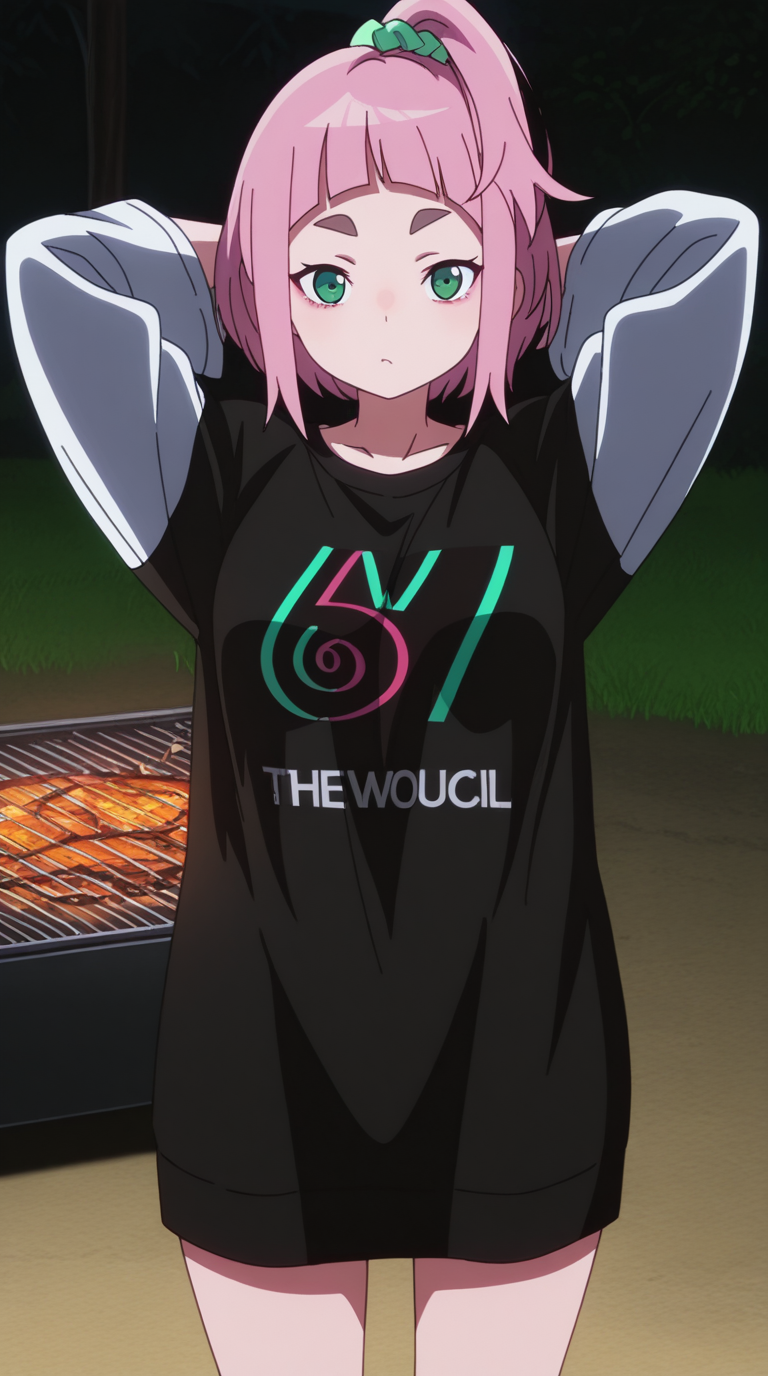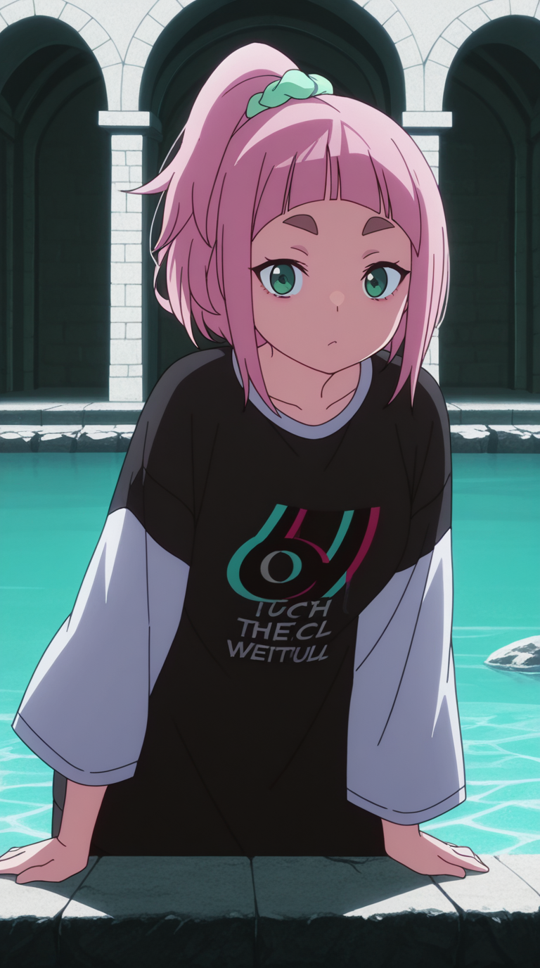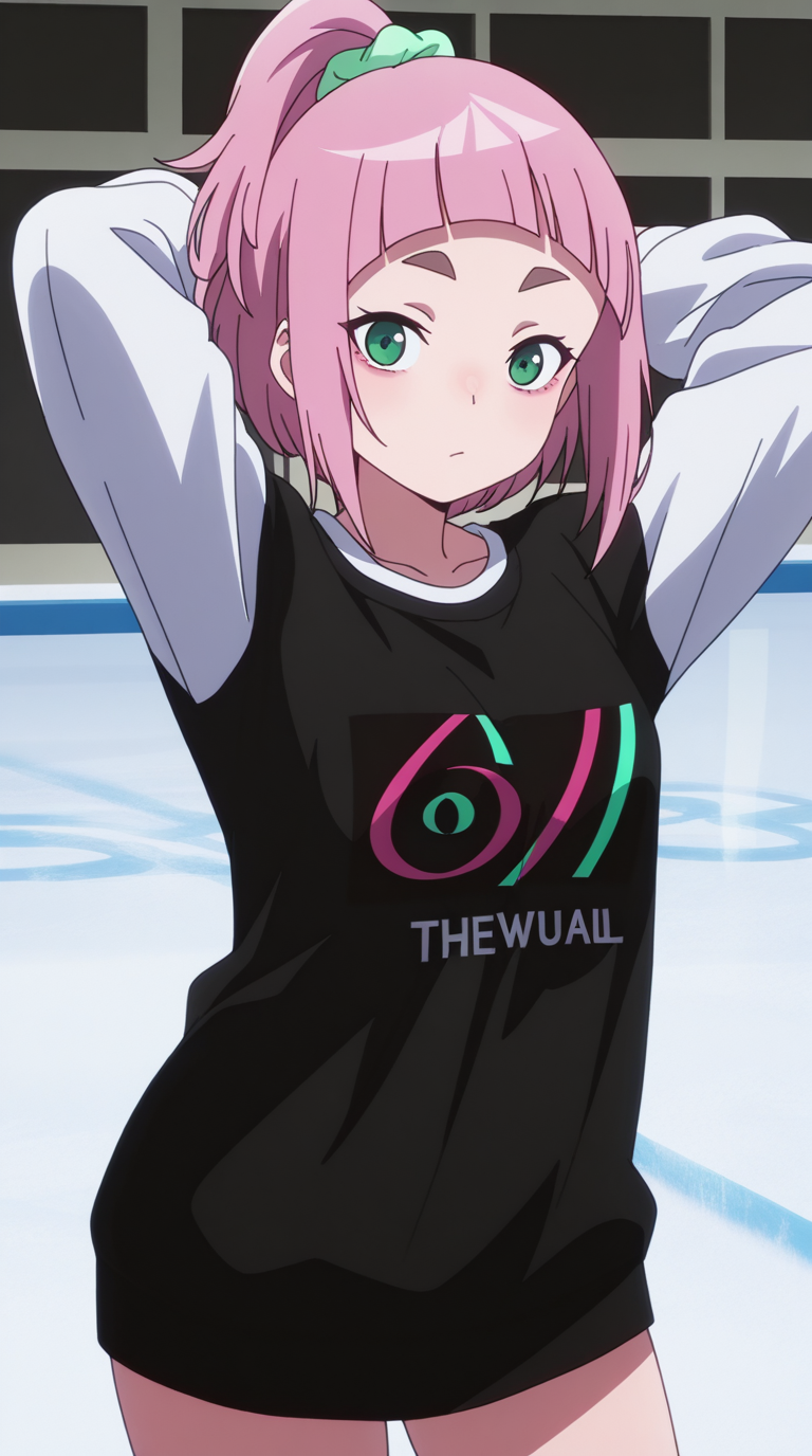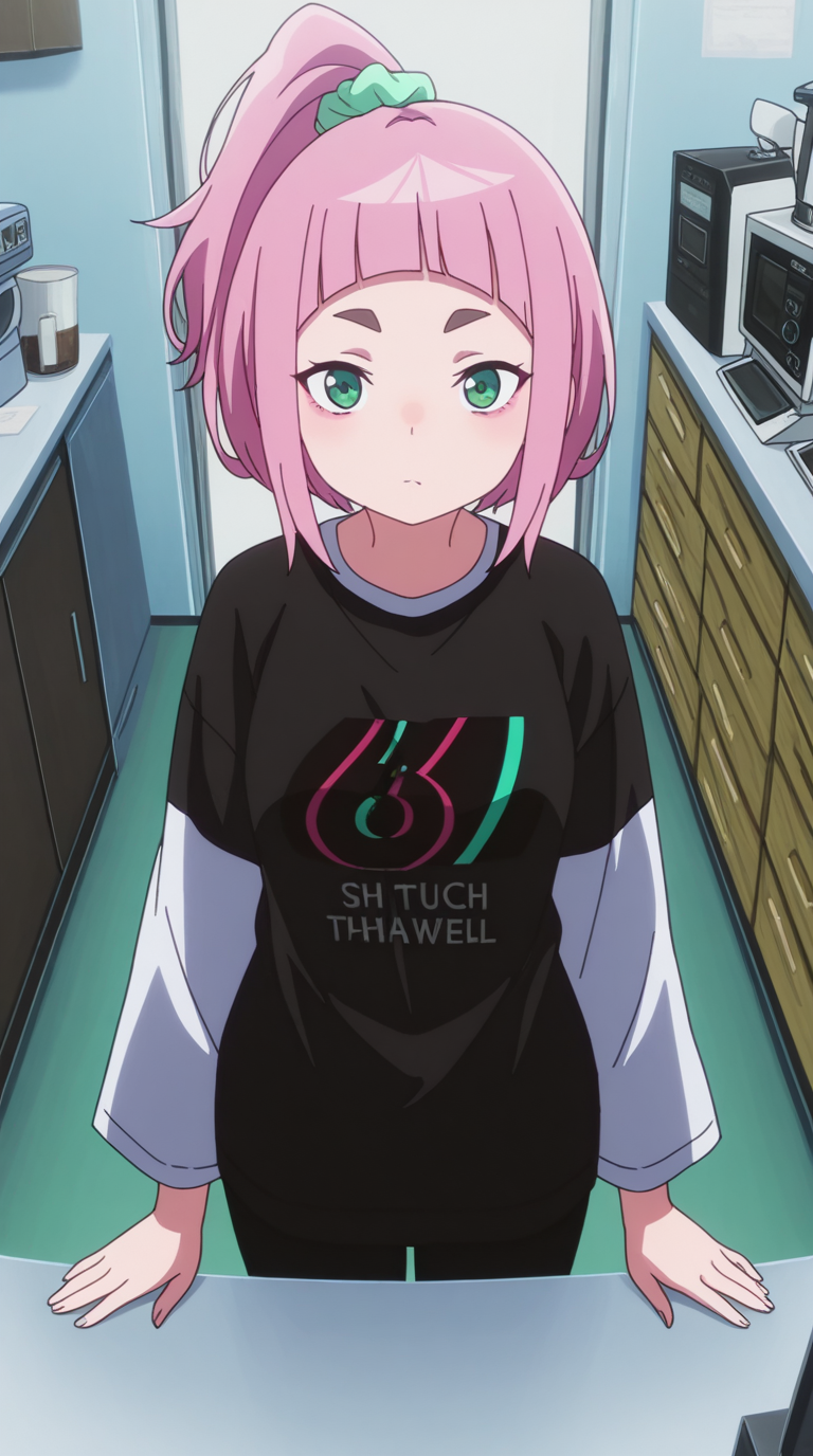 kiui watase, short hair, bangs, hair ornament, green eyes, pink hair, thick eyebrows, hair scrunchie, scrunchie, ponytail, blunt bangs, mature female, small breasts, anime screencap