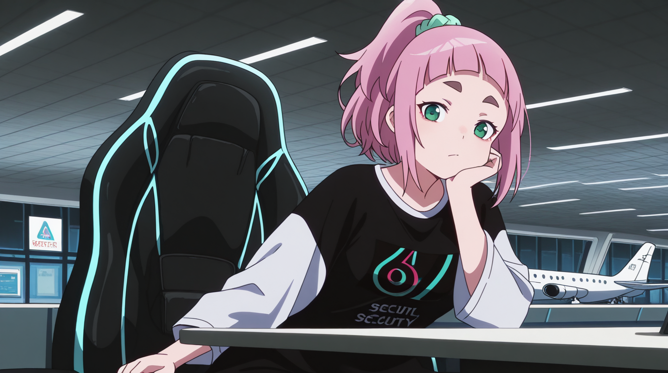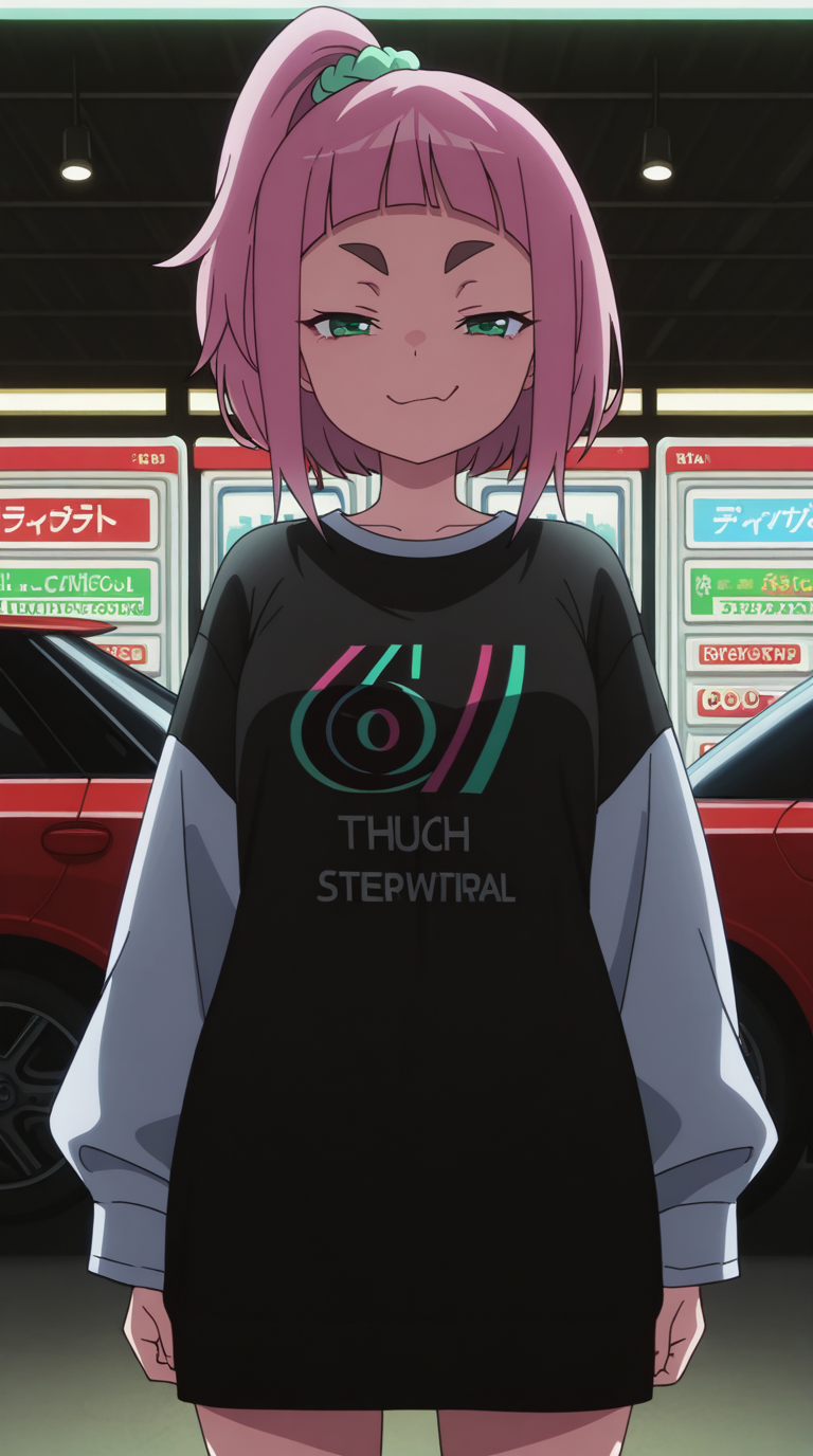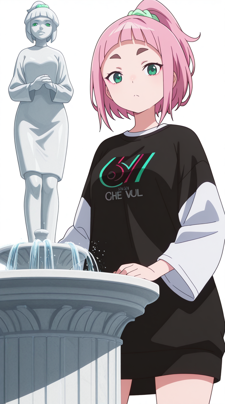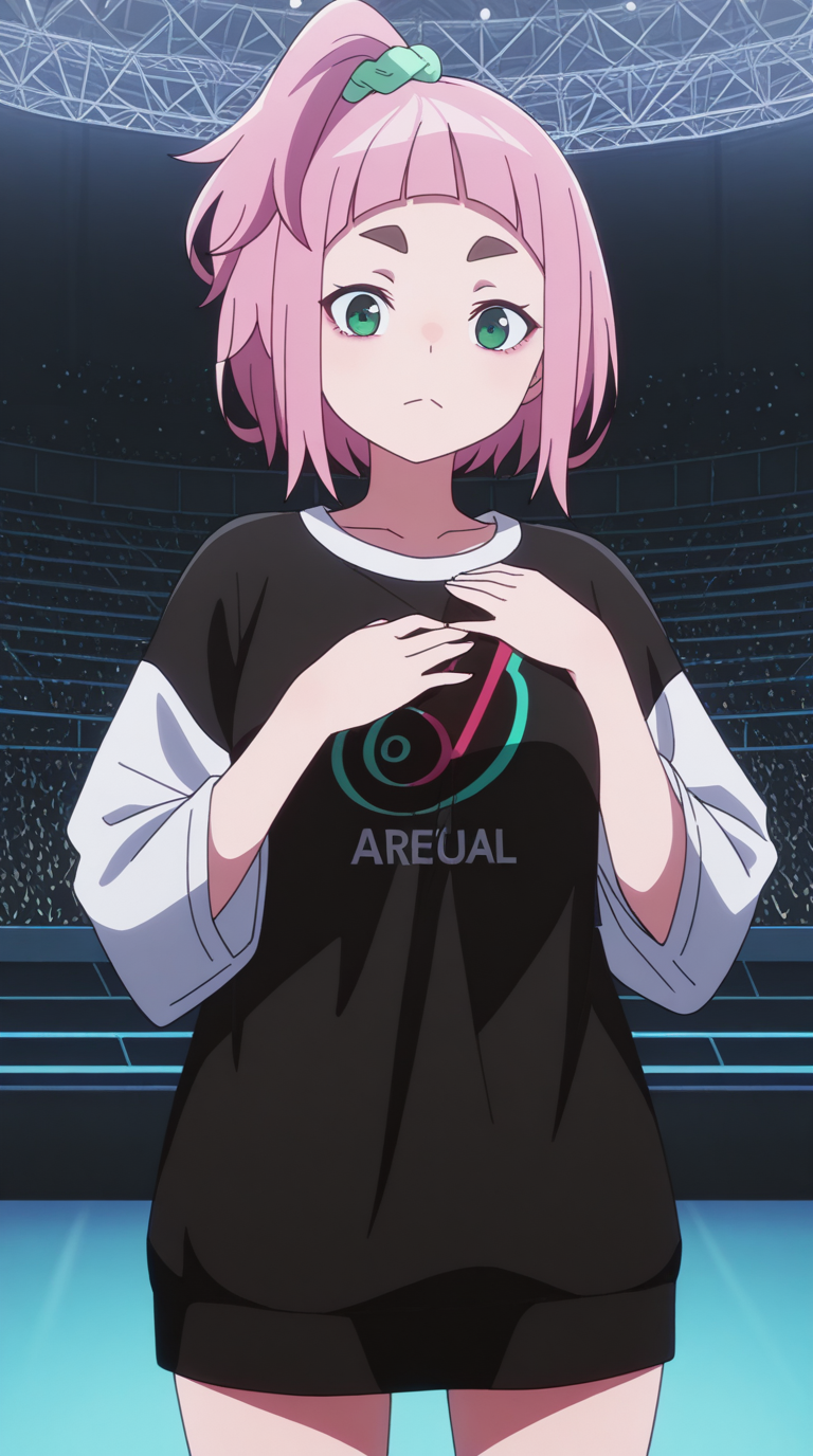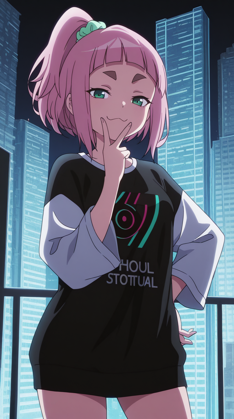 kiui watase, short hair, bangs, hair ornament, green eyes, pink hair, thick eyebrows, hair scrunchie, scrunchie, ponytail, blunt bangs, mature female, small breasts, anime screencap