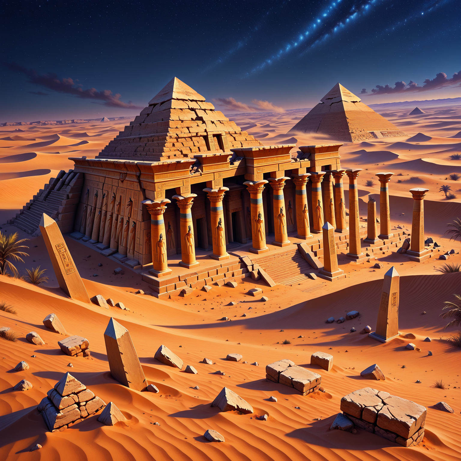 🌌✨ Under the endless moonless sky, ancient sands whisper forgotten secrets as NekhetStarveil awakens the mystic ruins of a long-lost Egyptian town in pure anime glory! 🏜️🗿 Anubis stands tall and solemn in full majestic form 🌑🐺, guarding crumbled mud-brick homes and shattered pottery relics while distant pyramids pierce the starry veil like silent sentinels ⛰️⭐. Cool blue-purple hues dance with twinkling starlight, casting ethereal shadows across wind-rippled dunes and hazy desert storms 🌪️✨.