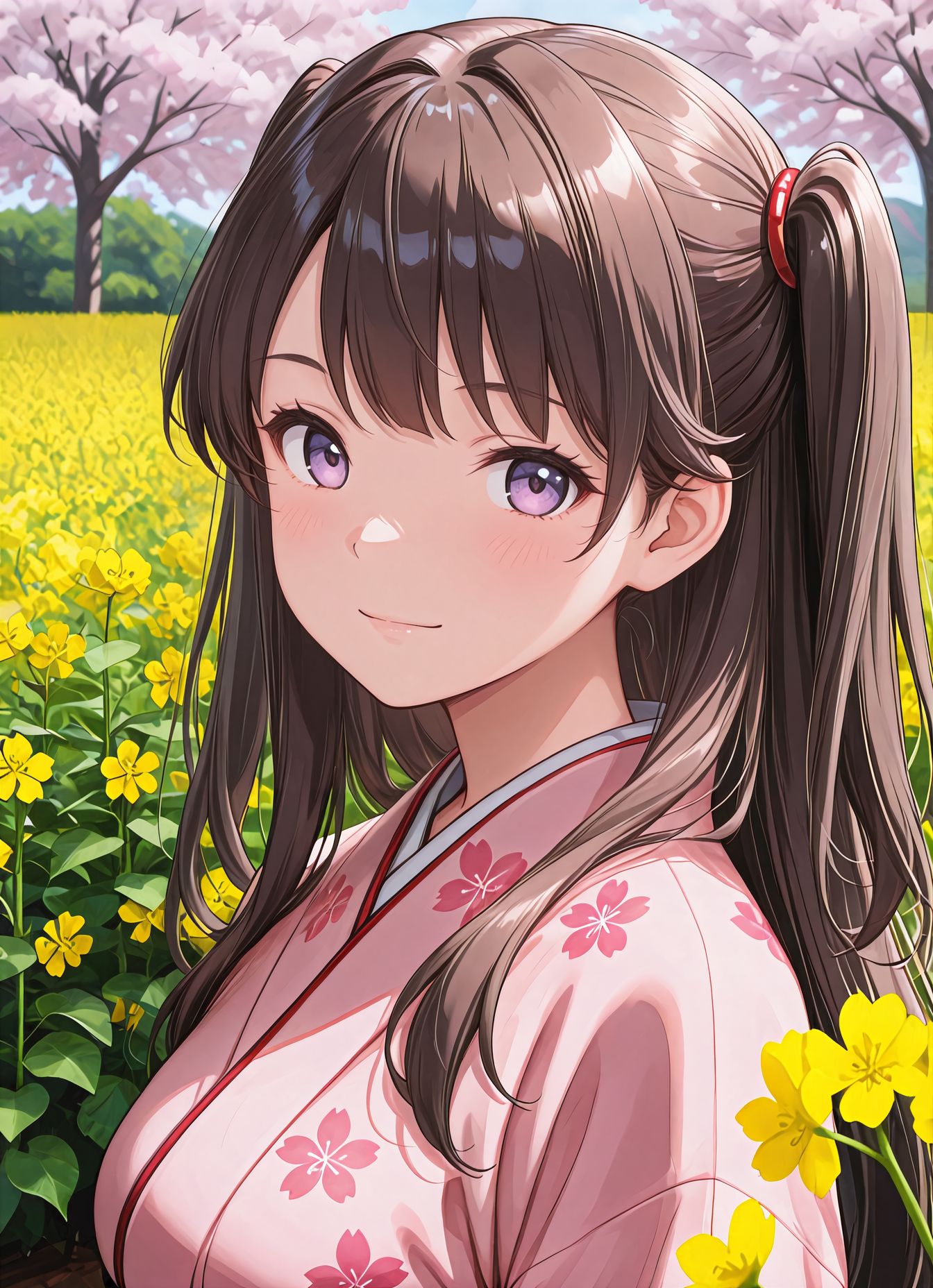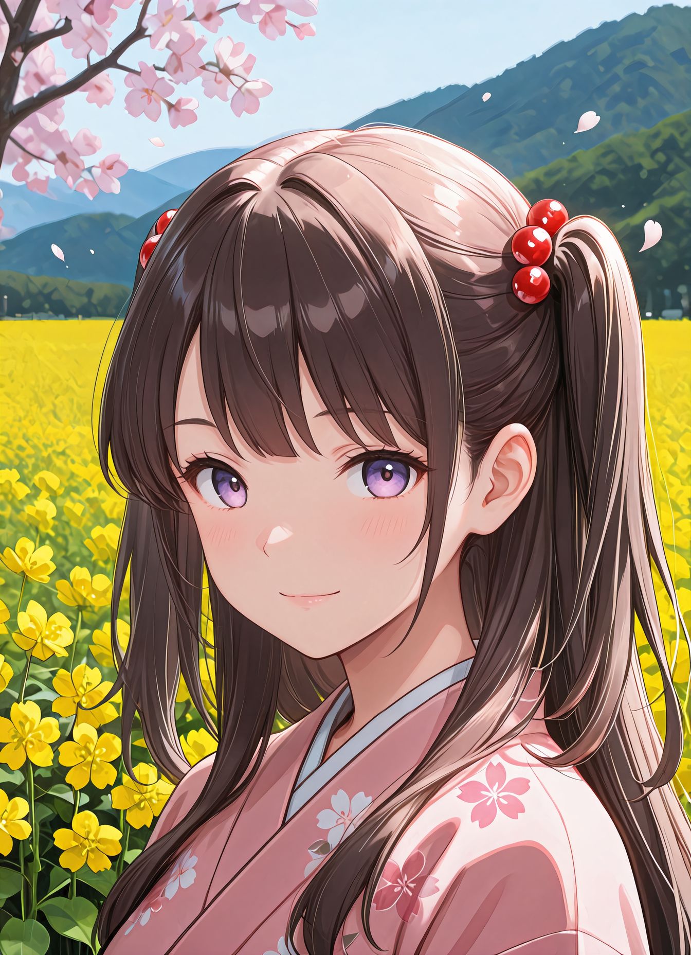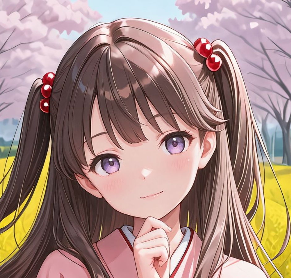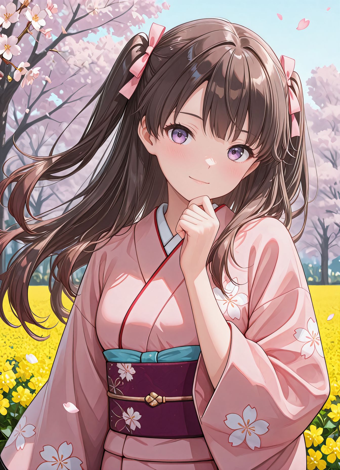 base : f_megumi, 1girl, purple eyes, brown hair, long hair, two side up, hair ribbon, pink ribbon