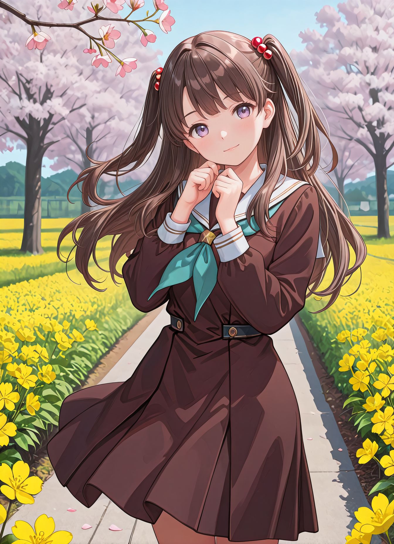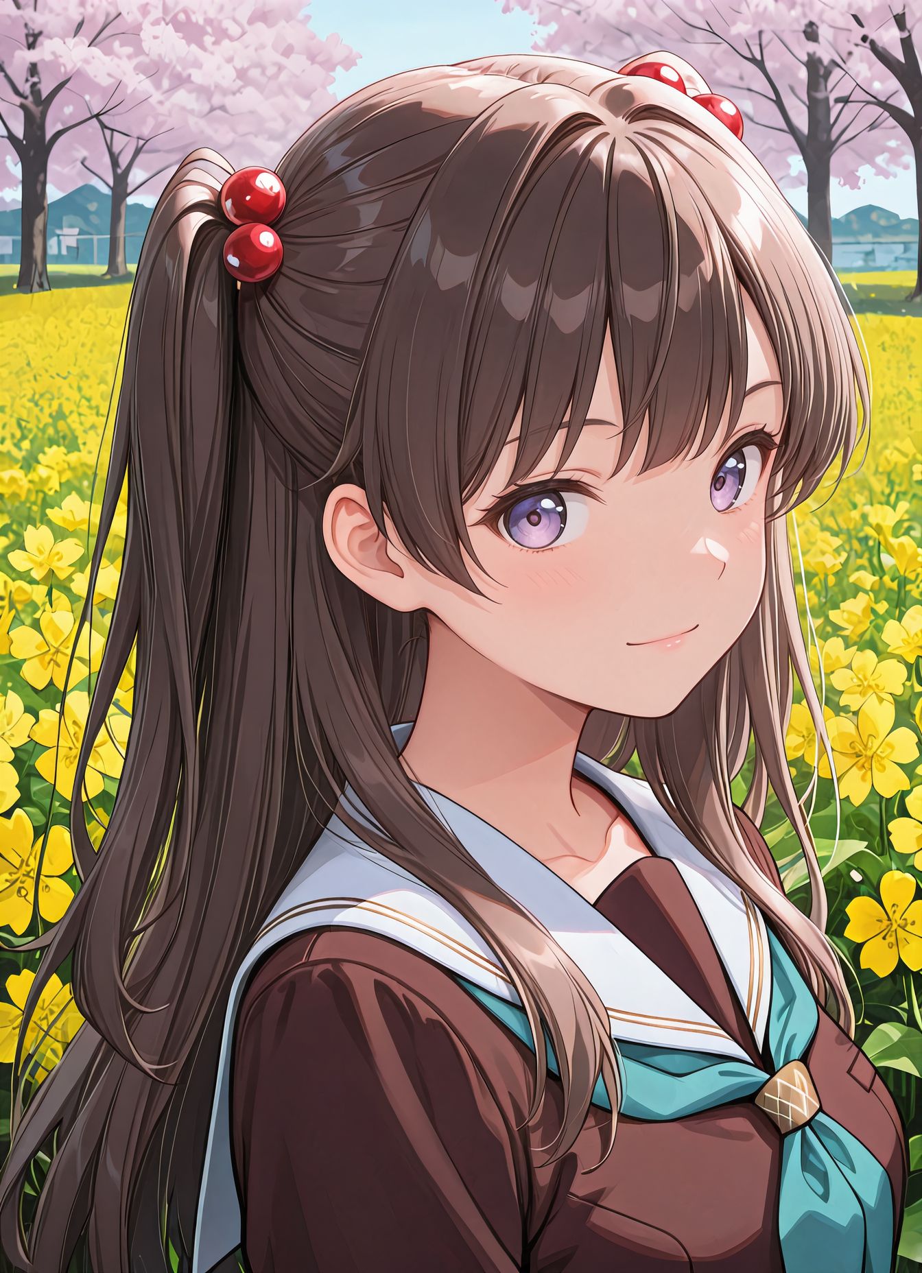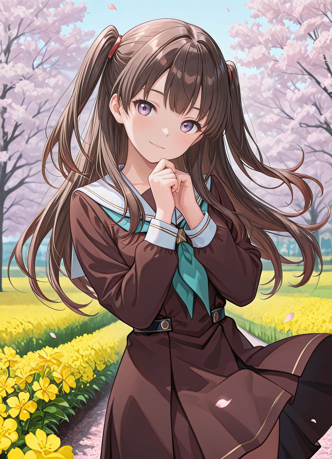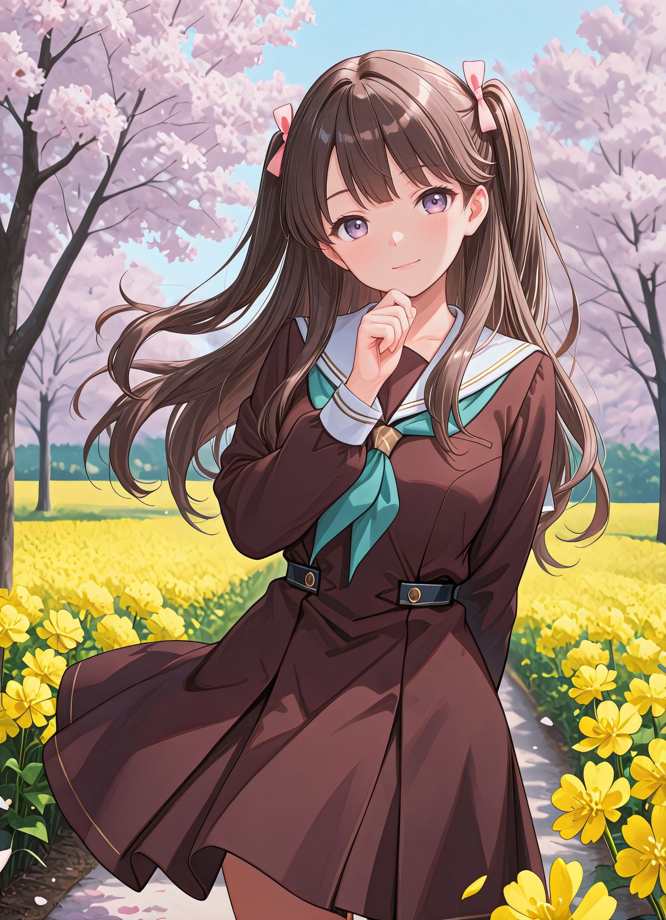 base : f_megumi, 1girl, purple eyes, brown hair, long hair, two side up, hair ribbon, pink ribbon
