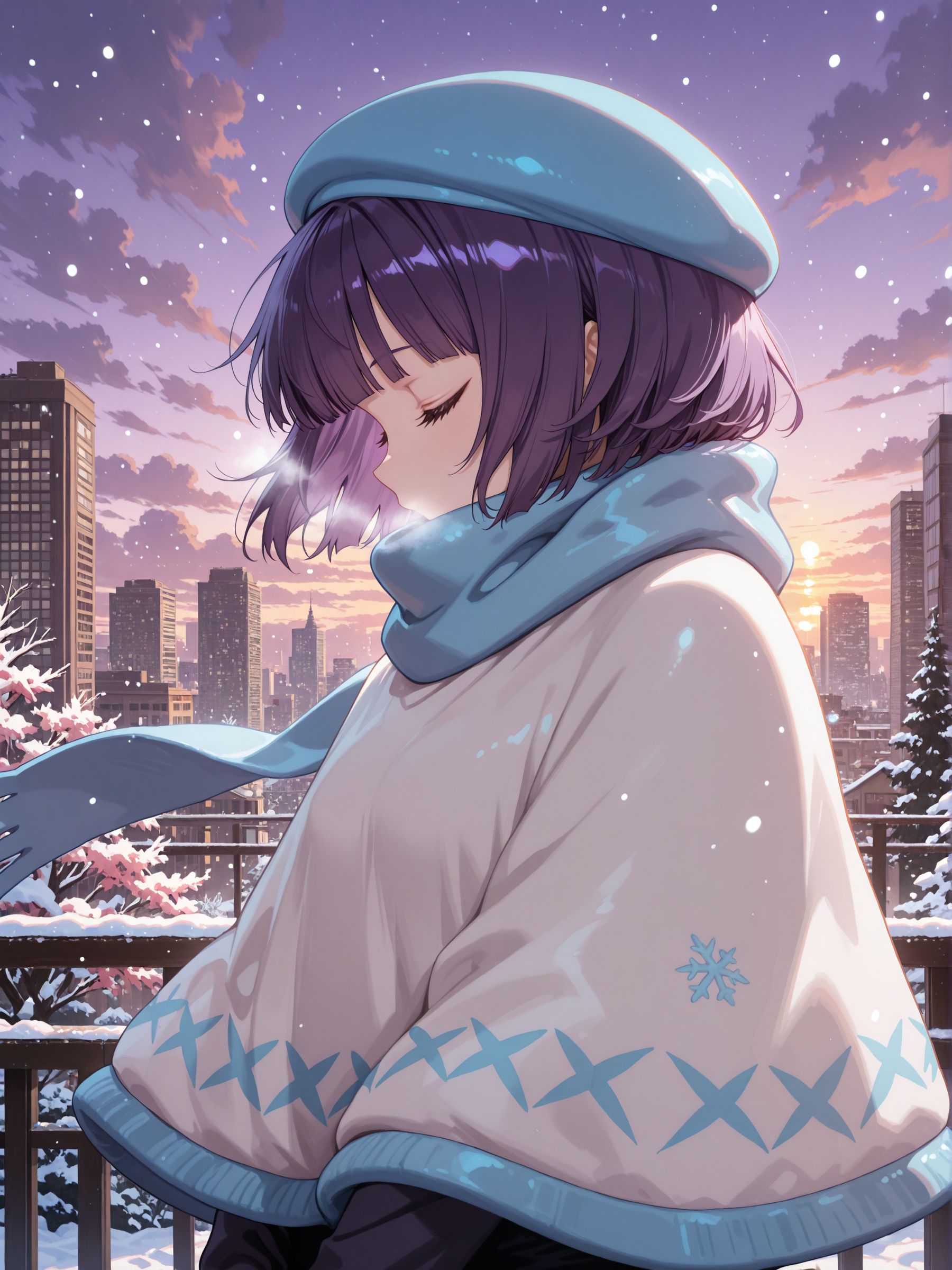 winter clothes, blue beret, blue scarf, scarf over mouth, blue poncho, white poncho, print poncho, white shirt, shirt under poncho, sleeves past wrists, skirt under poncho, purple skirt, miniskirt, leg warmers, purple kneehighs, loose socks, blue shoes, white shoes
